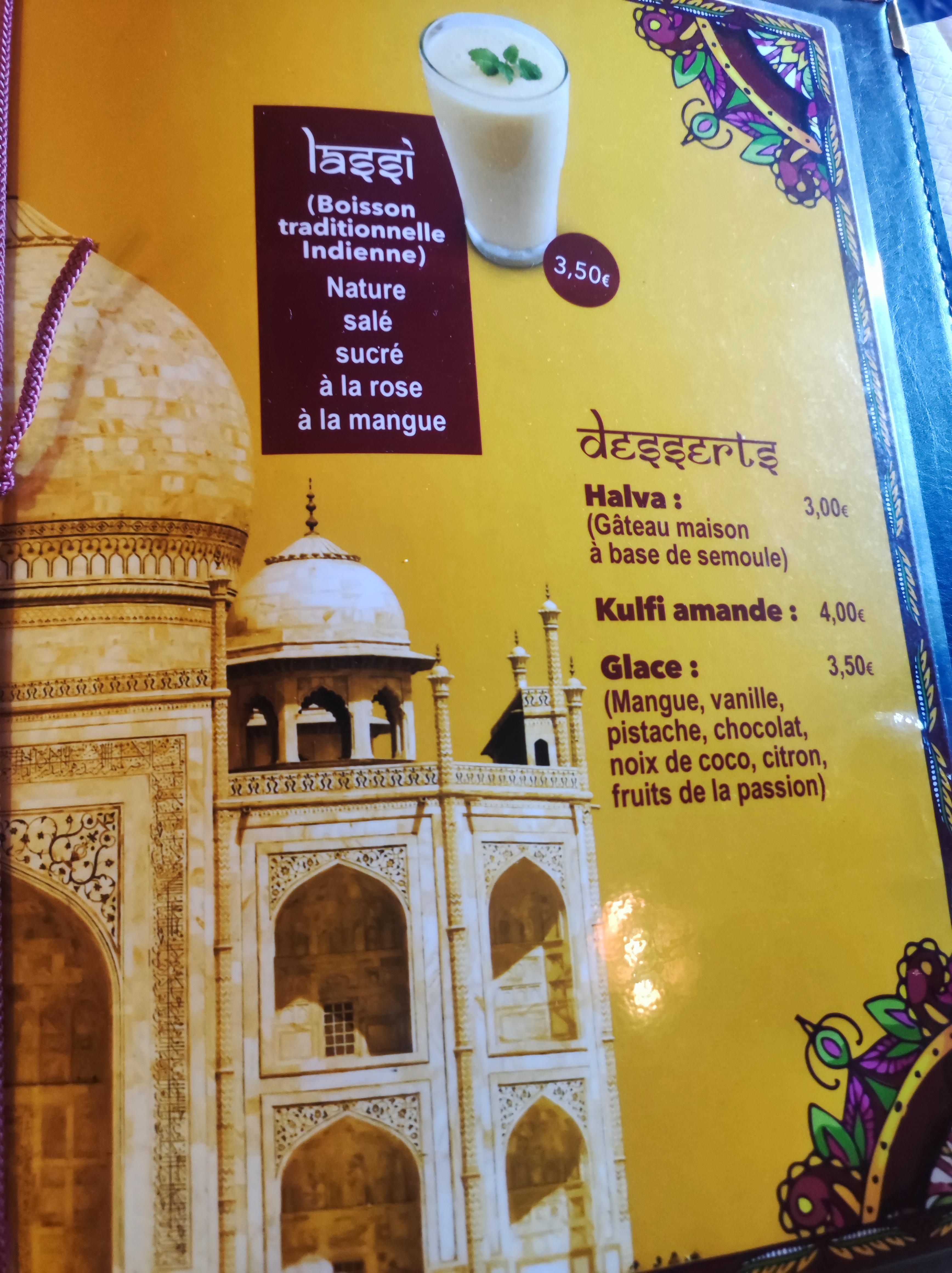 Très agréable, déco cocooning, plats excellents. Attention aux desserts pour ceux qui n'ont pas l'habitude de la cuisine indienne, la cardamome à croquer peut surprendre ! Pour les boissons, bière Taj Mahal très bonne et le coca servi dans unne bouteille en verre, très rare à notre époque ! Tout petit bémol pour les nan un peu noires par endroit mais excellentes cependant. On y retournera ! Le thé à la cardamome : très bon.