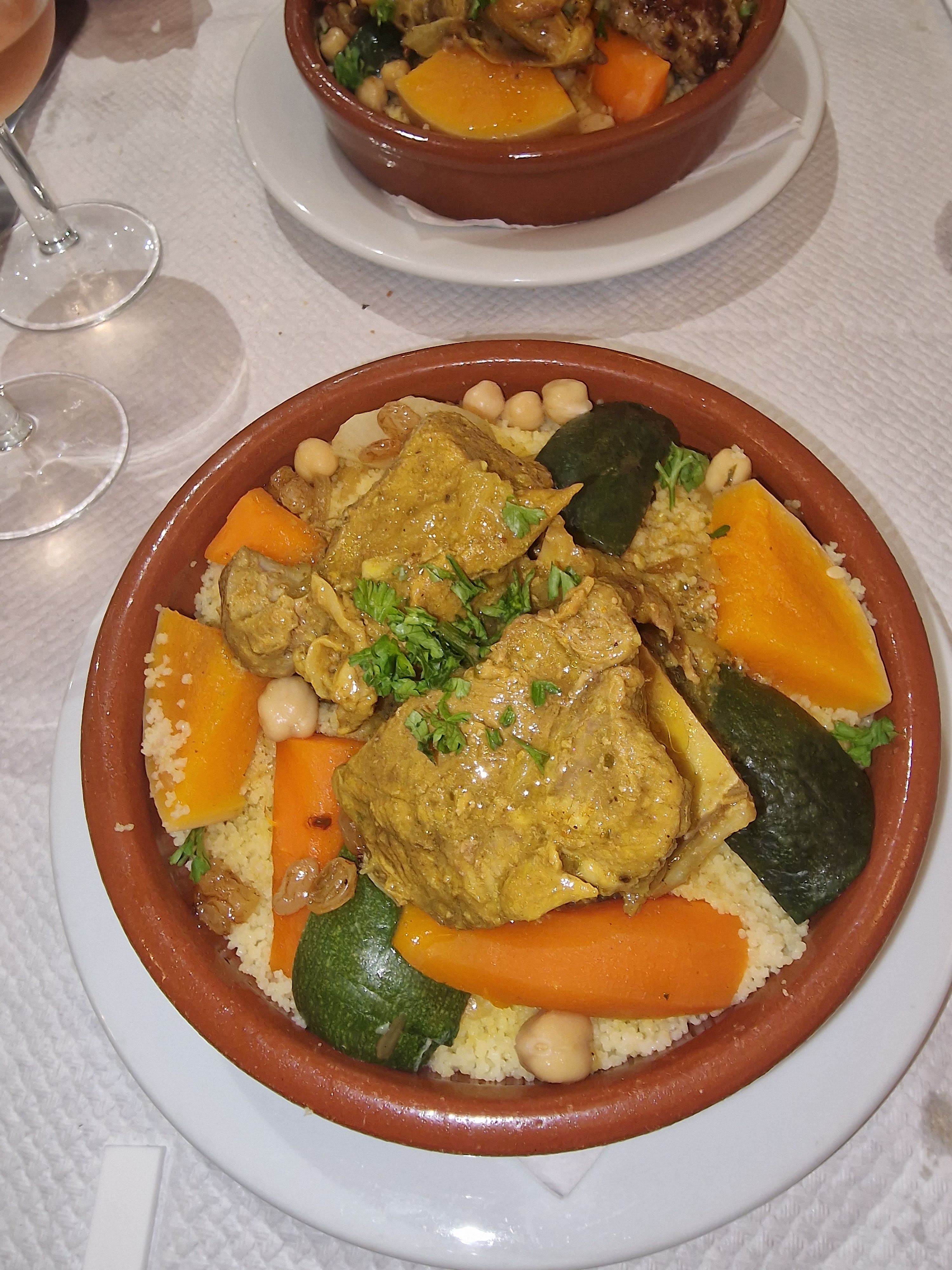Couscous royal 25 € l’assiette (sans un seul morceau d’agneau) juste Une merguez + une boulette de kefta dure + une cuisse de poulet. Tout est très fade . On ne sent pas les épices. La graine de couscous trempée d’eau … L’arissa c’est du coulis de tomate ! De gros efforts encore à faire pour s’améliorer en cuisine !