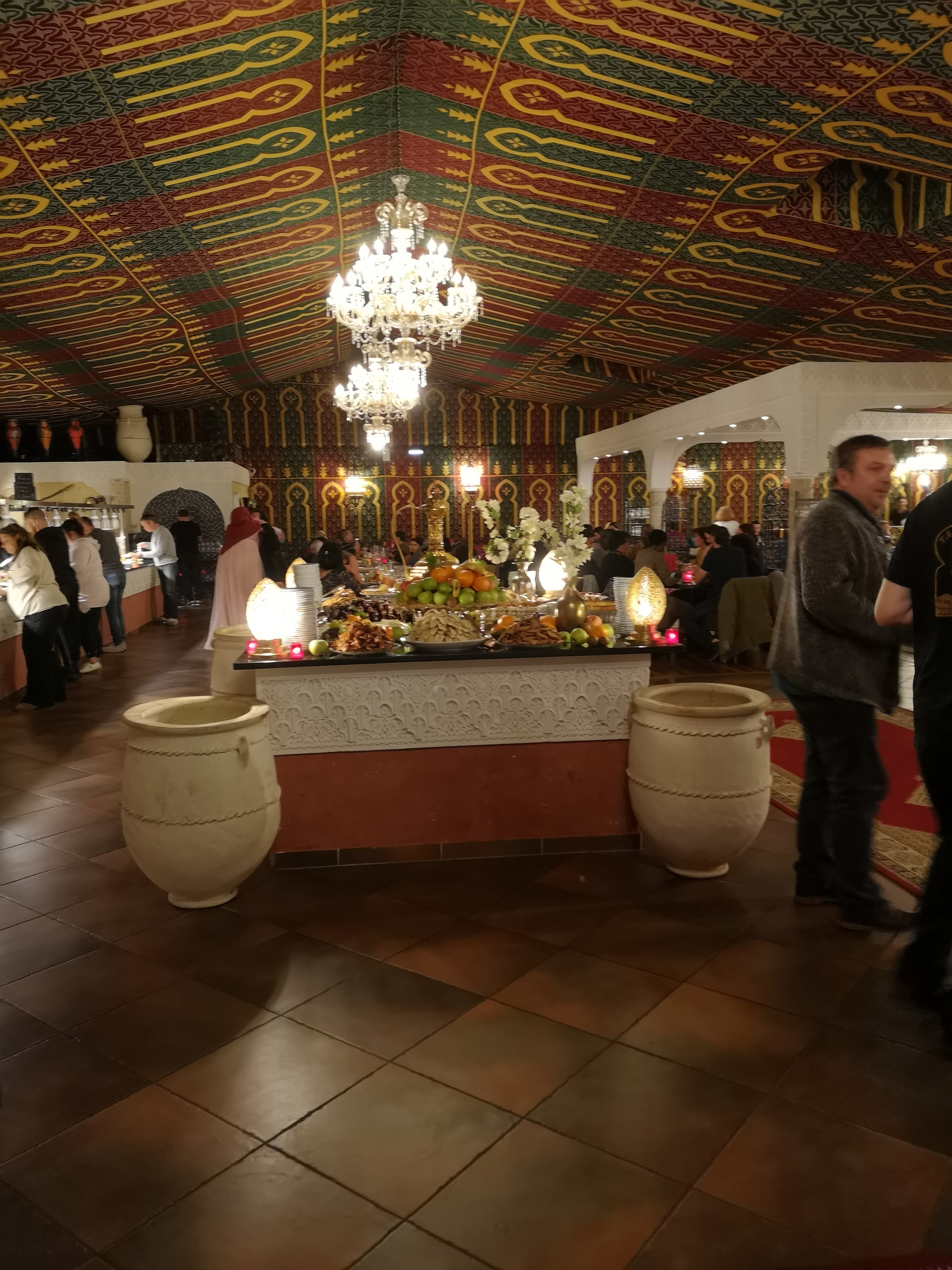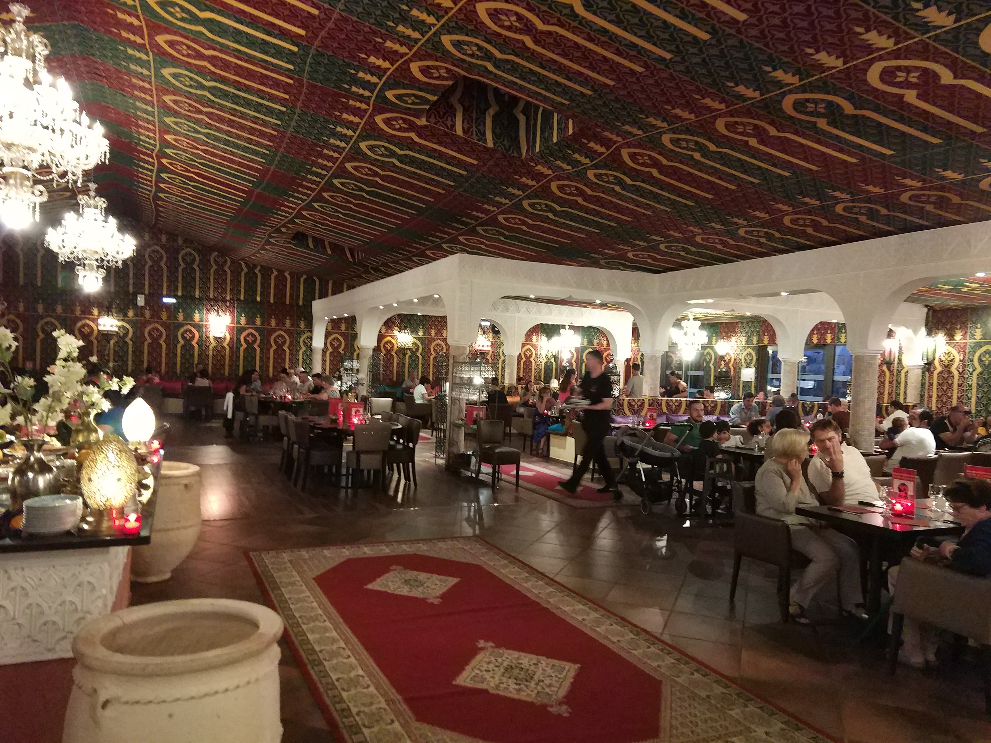 Repas en soirée, ambiance bruyante mais on ne va pas dans ce restaurant pour un repas en amoureux. Cuisine marocaine, décoration, danseuses du ventre, lumières, musiques, on se sent bien si on aime ça. Le buffet est bien présenté et copieux, la nourriture est bonne pour un restaurant à volonté.