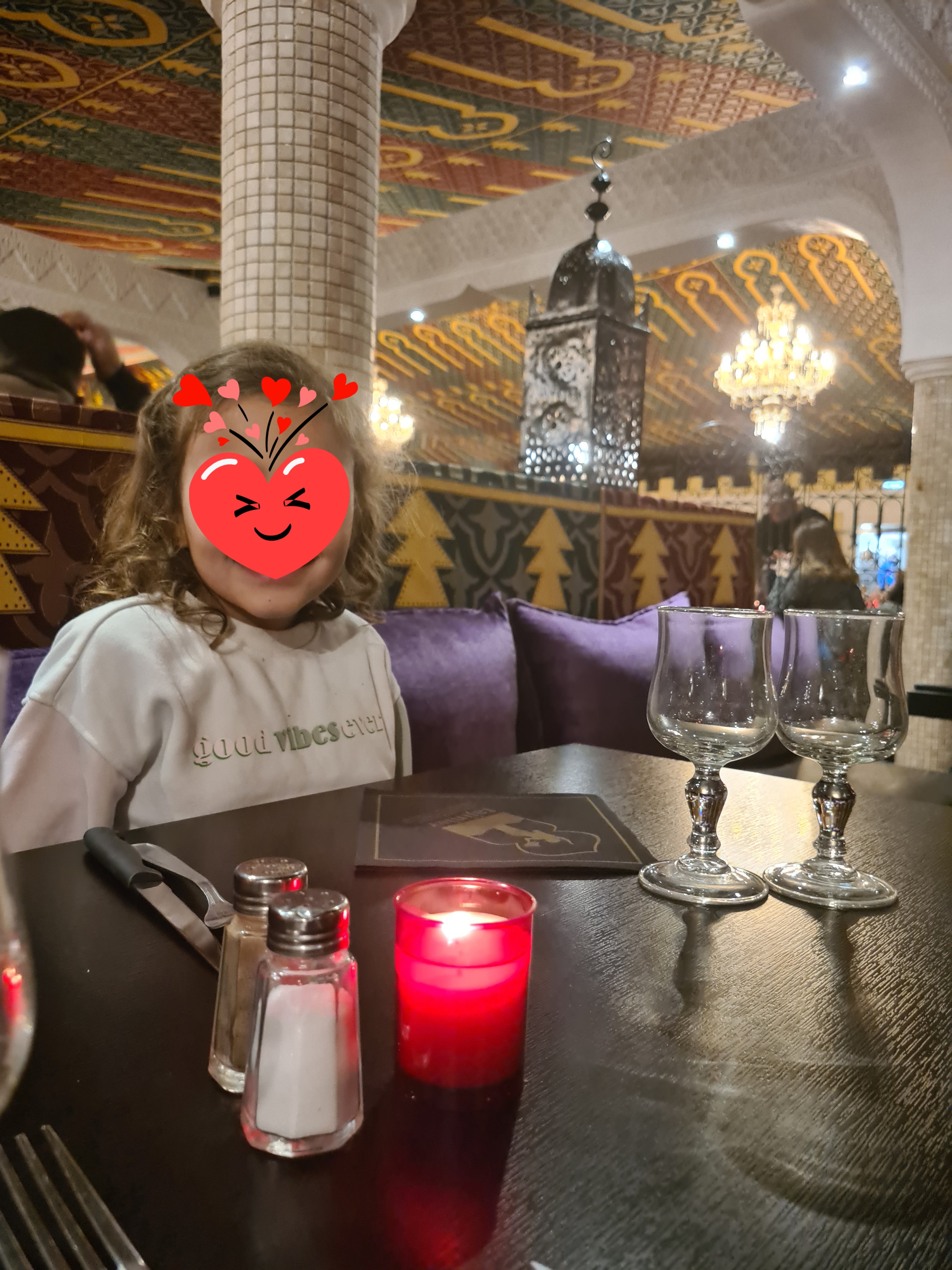 J'ai bien aimé le cadre, tout était en parfait accord. Nous avons eu des danseuses pour nous mettre dans l'ambiance, tout le long de la soirée, c'était très sympa. Concernant le repas, les entrées n'étaient pas très originales, les plats étaient vraiment très bons mais un peu trop gras, après c'est de la cuisine orientale donc normal. Et les desserts, je pense que je n'ai pas eu de chance, je suis tombée sur une part de gâteau basque encore glacée au milieu. Le point super positif, c'était notre serveuse, qui a été super, elle nous a tout bien expliqué et a été adorable. Je recommande ce restaurant si vous avez envie de passer une bonne soirée d'anniversaire ou bien avec des amis.