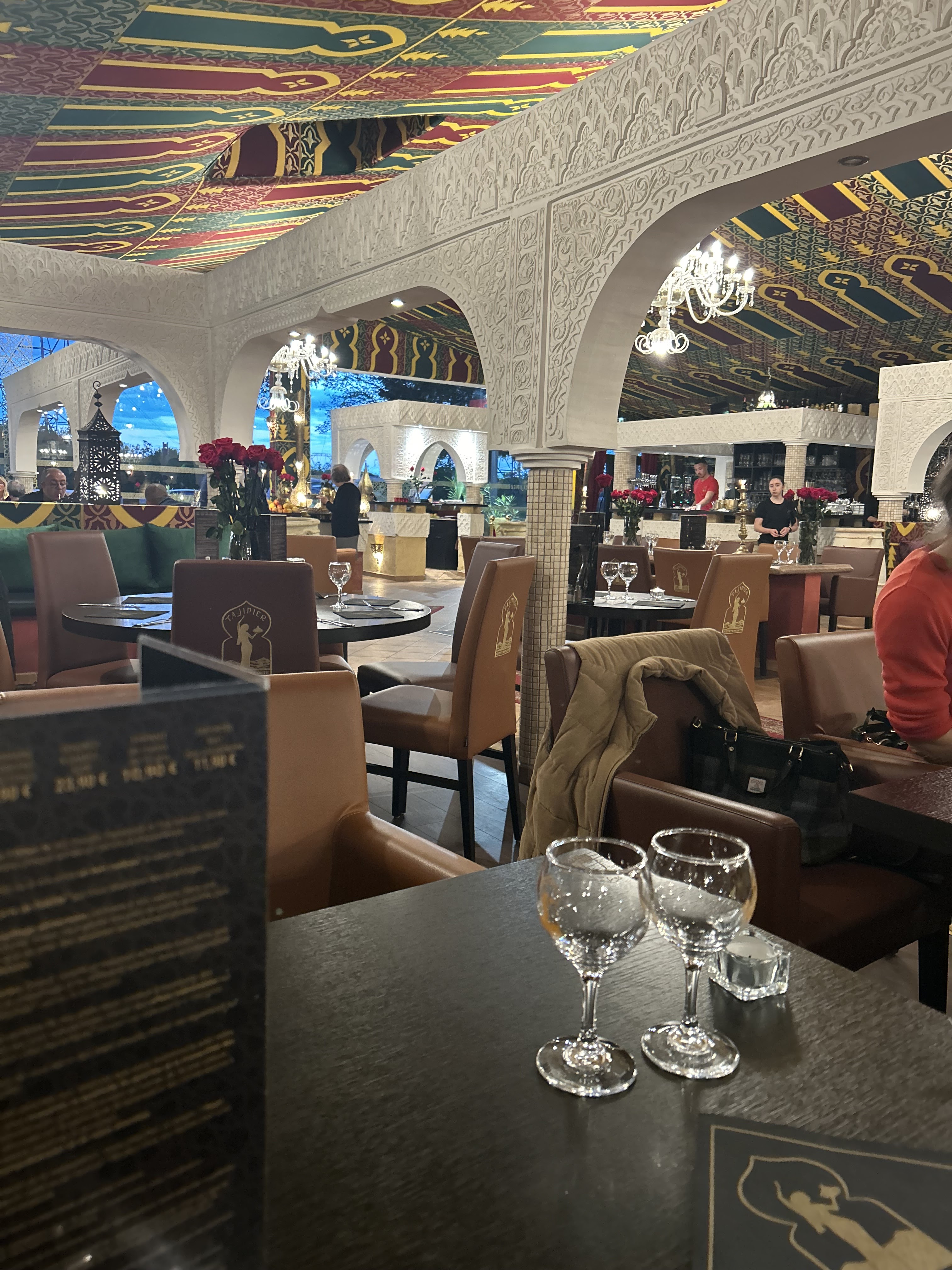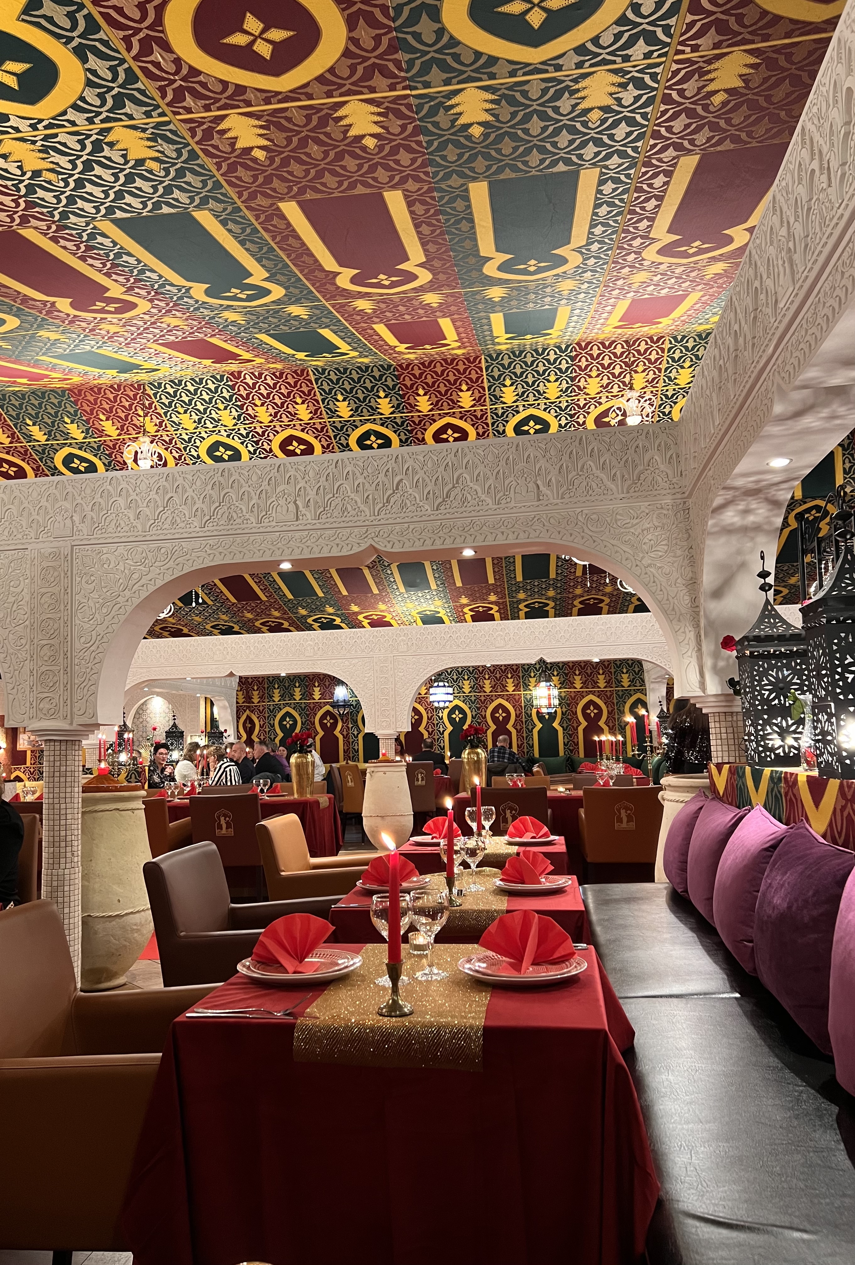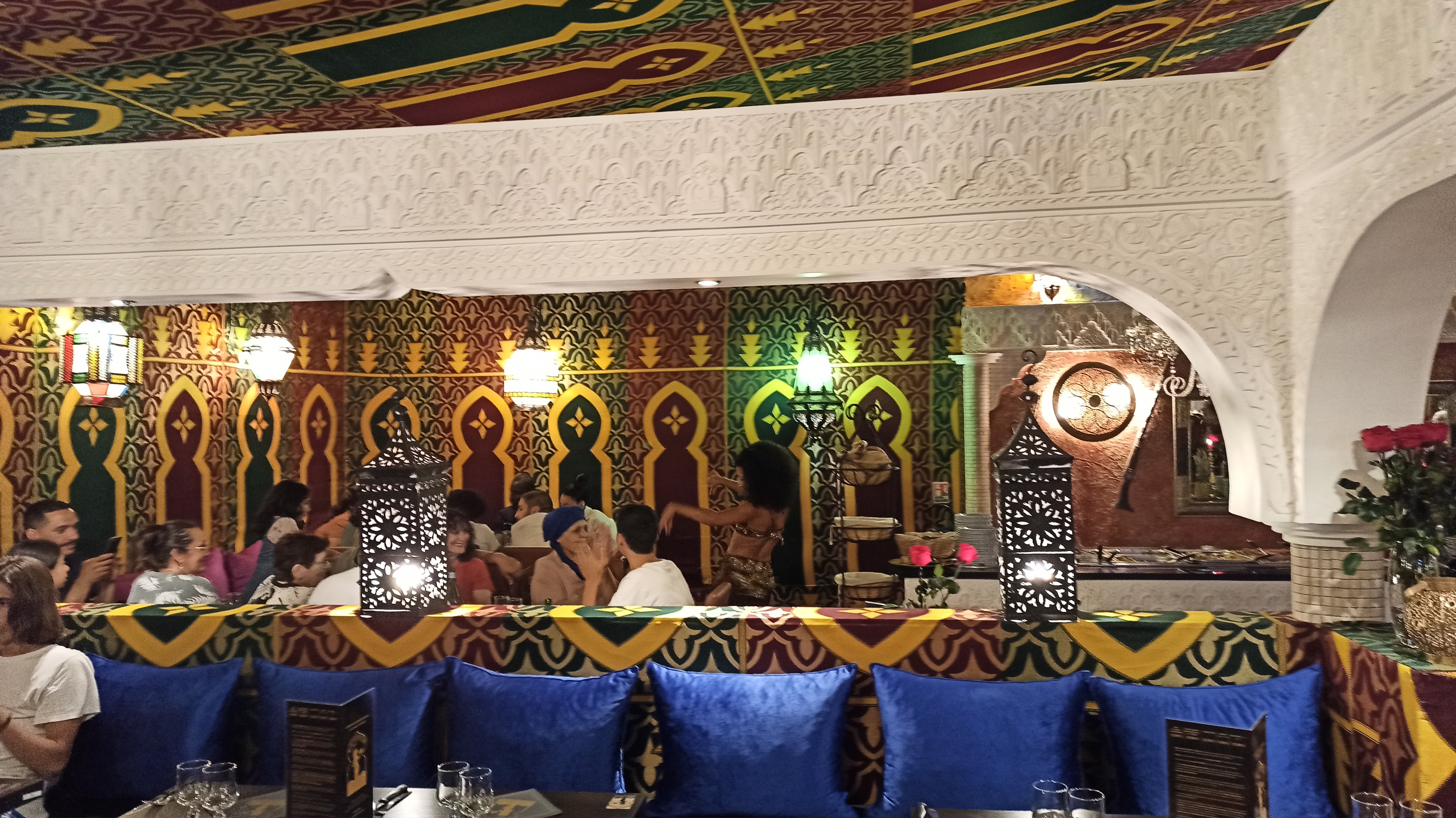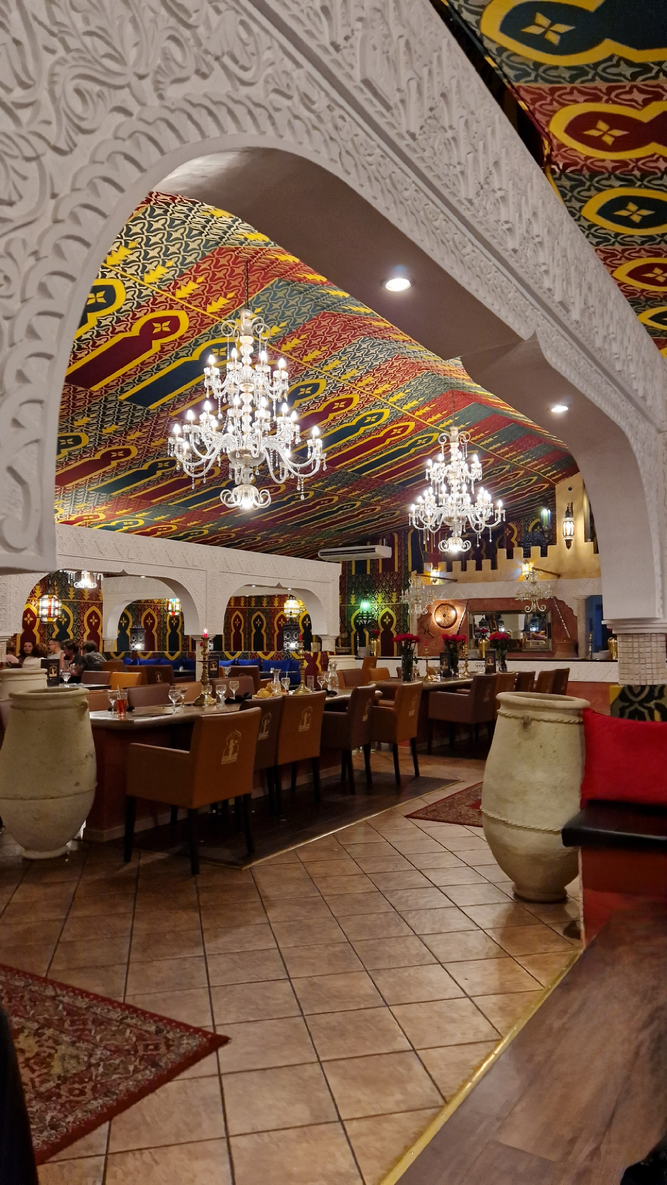 Le décor est somptueux , les 1001 nuits, le personnel sympathique dans l'ensemble,pour le personnel en salle,bof à l'accueil. Nous y sommes allés 5 fois, c'est toujours bondé. Tout à volonté,entrées plats tajine couscous et les desserts. Sincèrement concept bien pour les gros mangeurs mais loin d'un vrai restaurant marocain, rien à voir, c'est tiède et aigreur d'estomac les 3 dernières fois, mon mari aussi. Il y a eu l'effet surprise, on a voulu retenter mais on n'ira plus. A noter weekend et vendredi soir, réserver. 2 services, 19h et 21h. Et danses au long du repas ça c'est cool