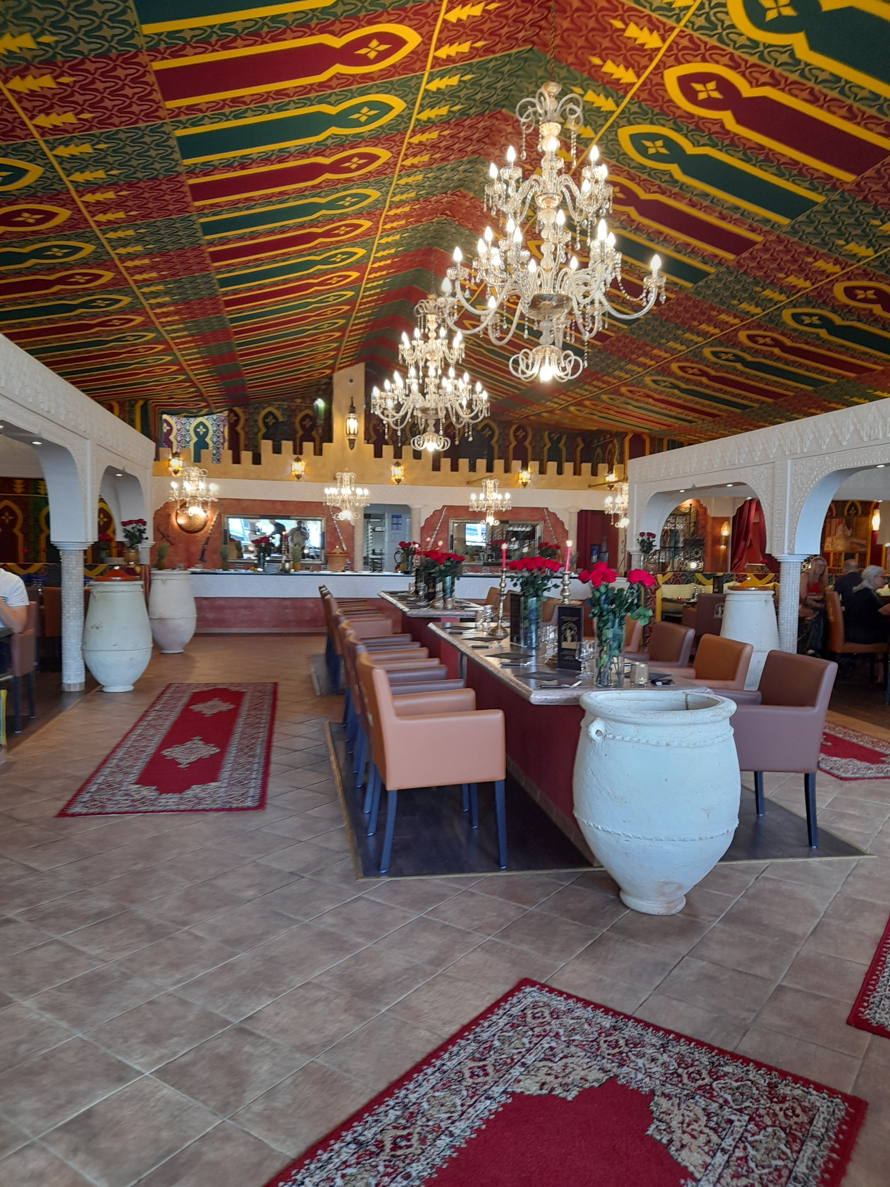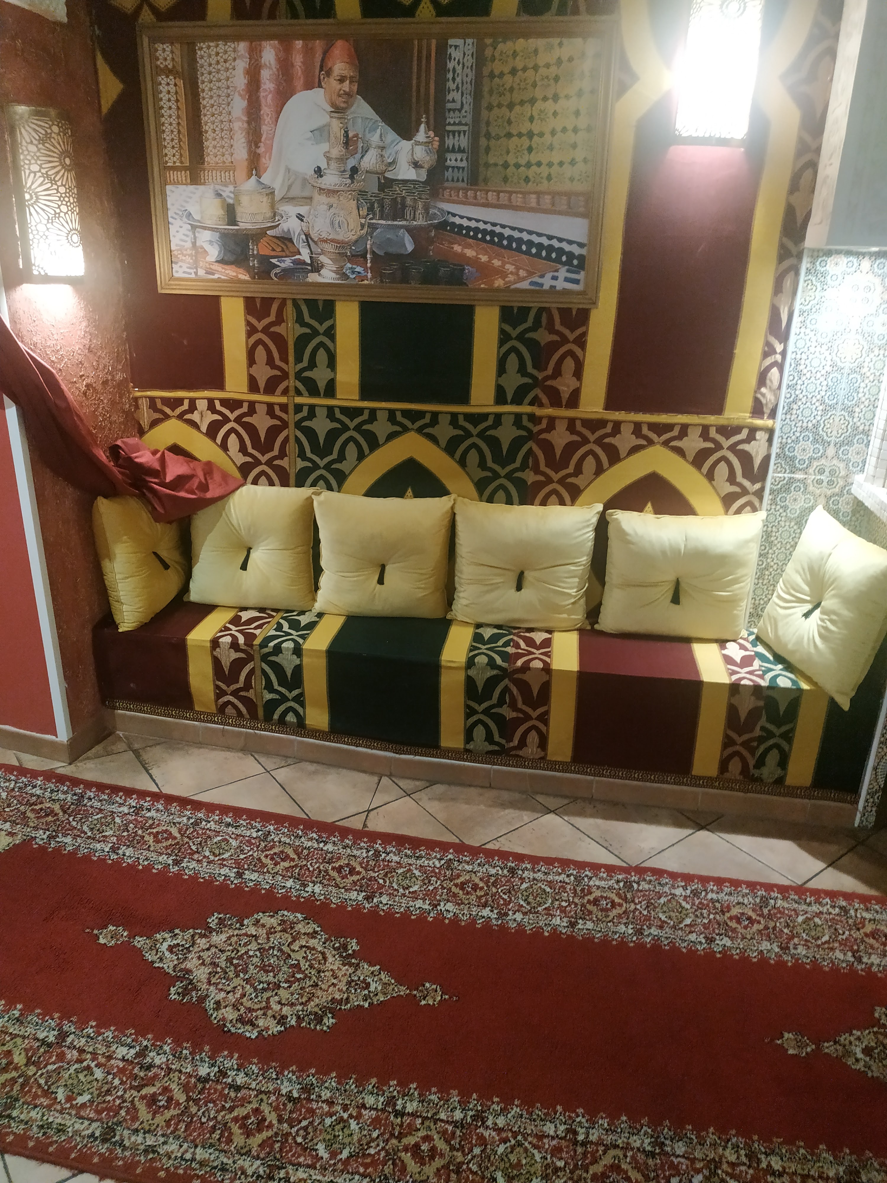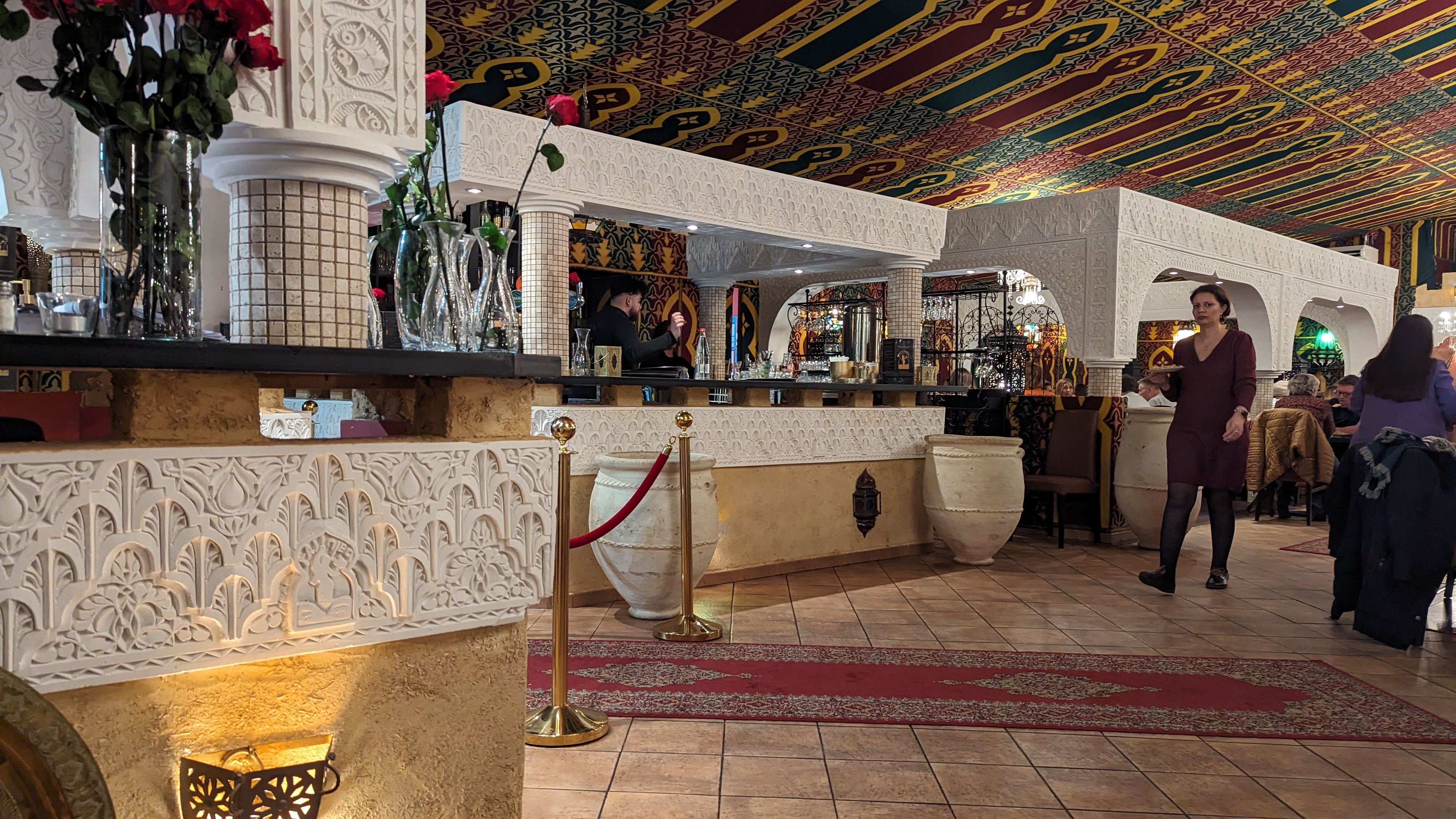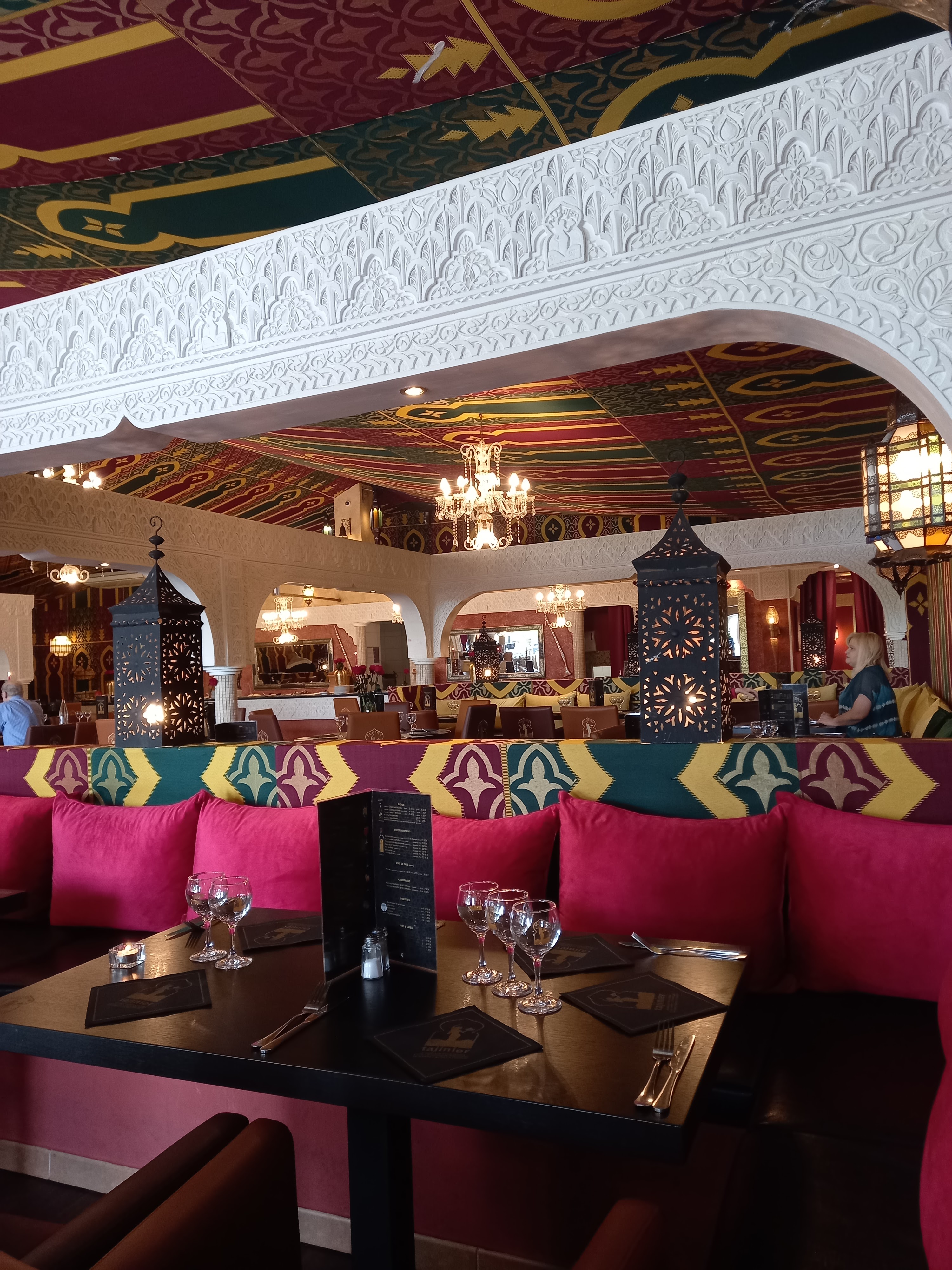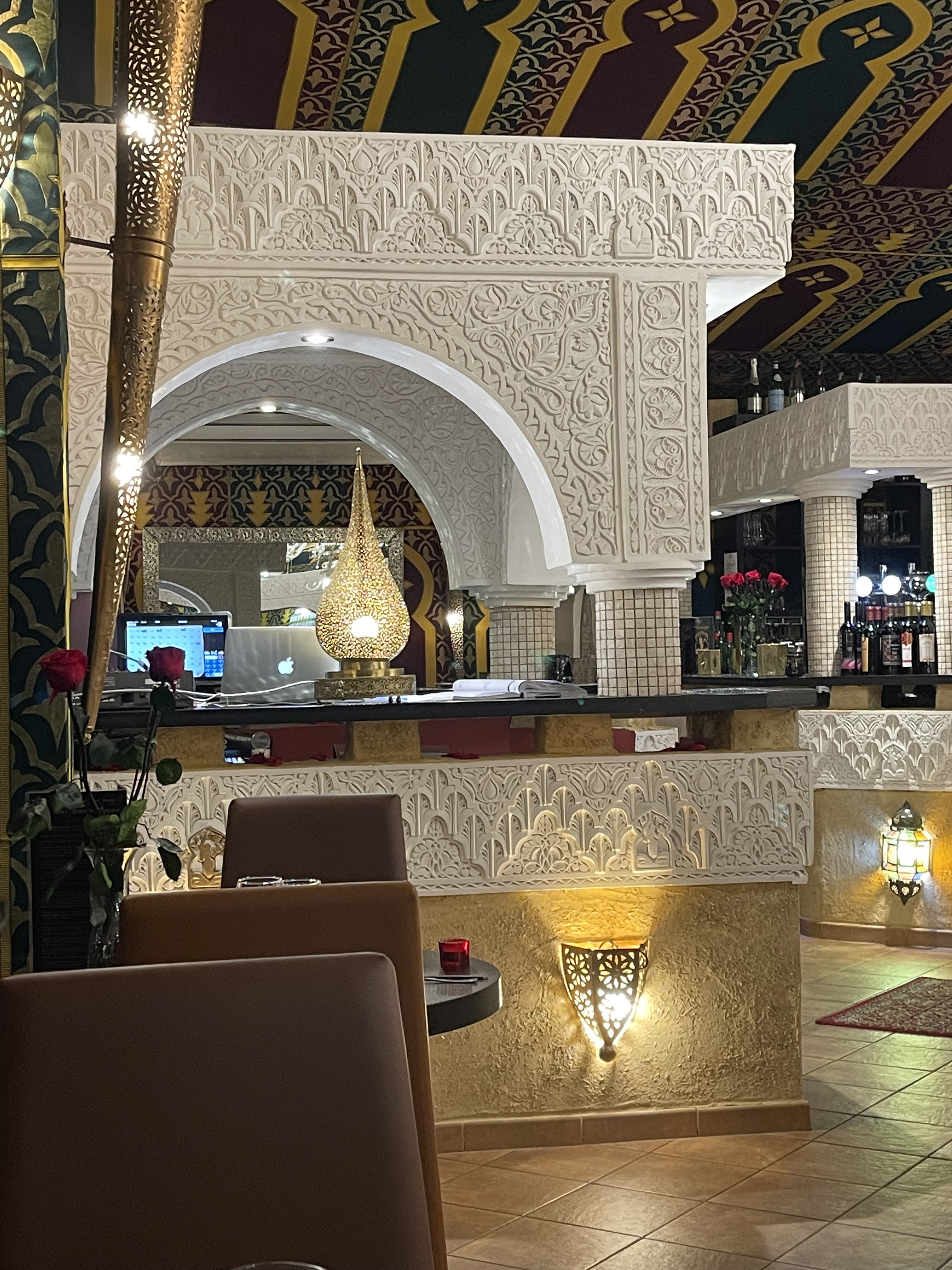 Le décor est somptueux , les 1001 nuits, le personnel sympathique dans l'ensemble,pour le personnel en salle,bof à l'accueil. Nous y sommes allés 5 fois, c'est toujours bondé. Tout à volonté,entrées plats tajine couscous et les desserts. Sincèrement concept bien pour les gros mangeurs mais loin d'un vrai restaurant marocain, rien à voir, c'est tiède et aigreur d'estomac les 3 dernières fois, mon mari aussi. Il y a eu l'effet surprise, on a voulu retenter mais on n'ira plus. A noter weekend et vendredi soir, réserver. 2 services, 19h et 21h. Et danses au long du repas ça c'est cool