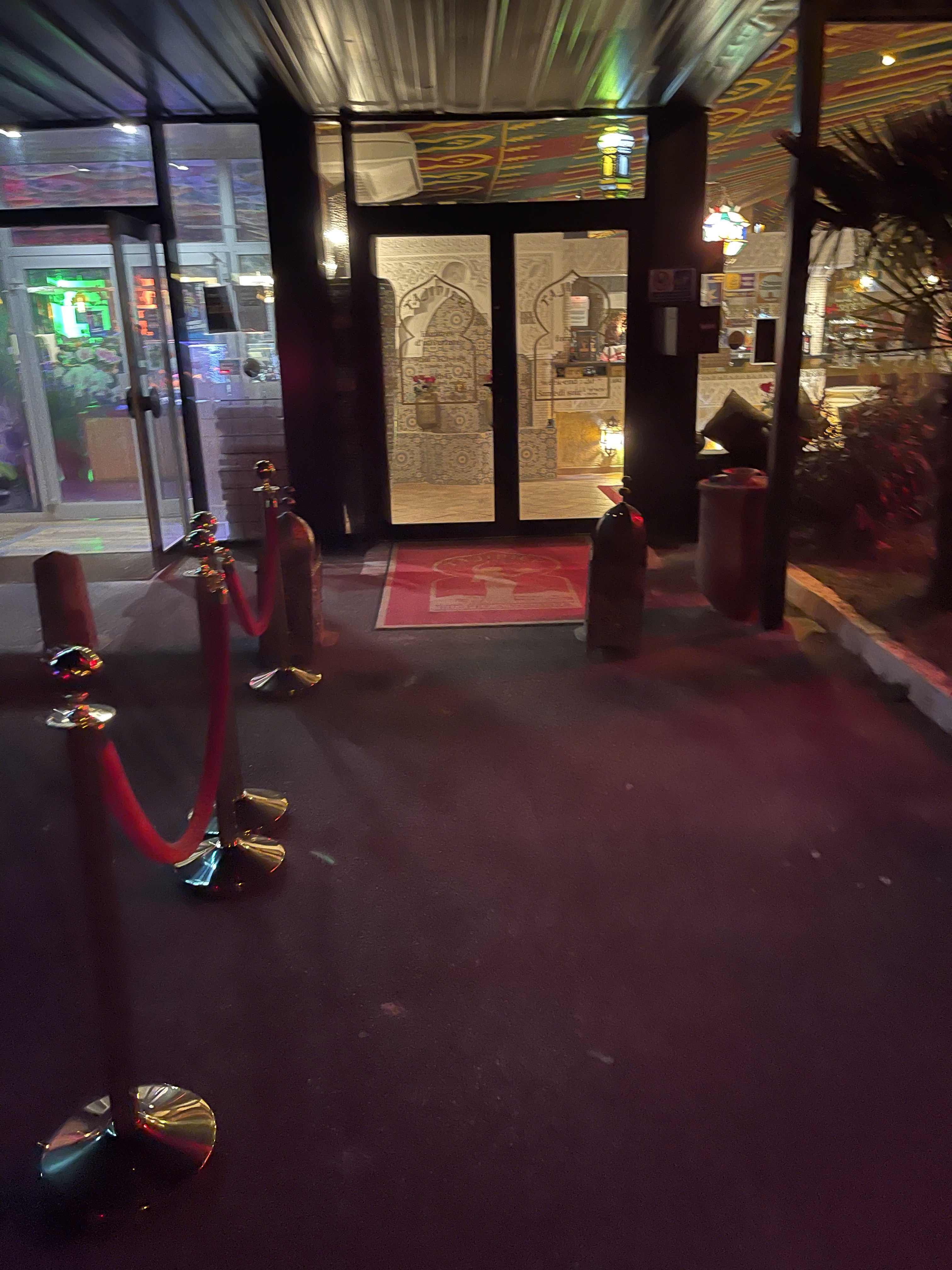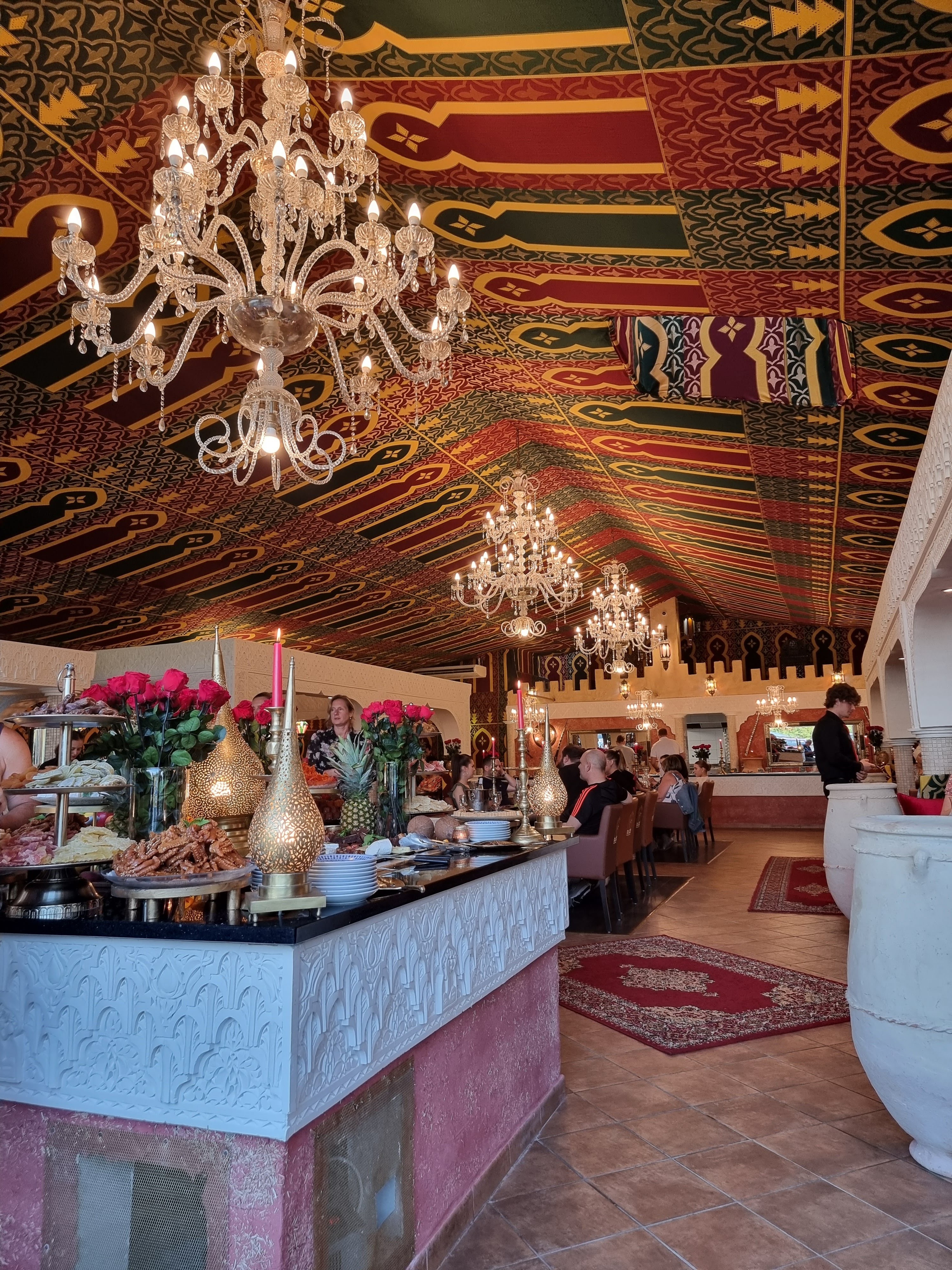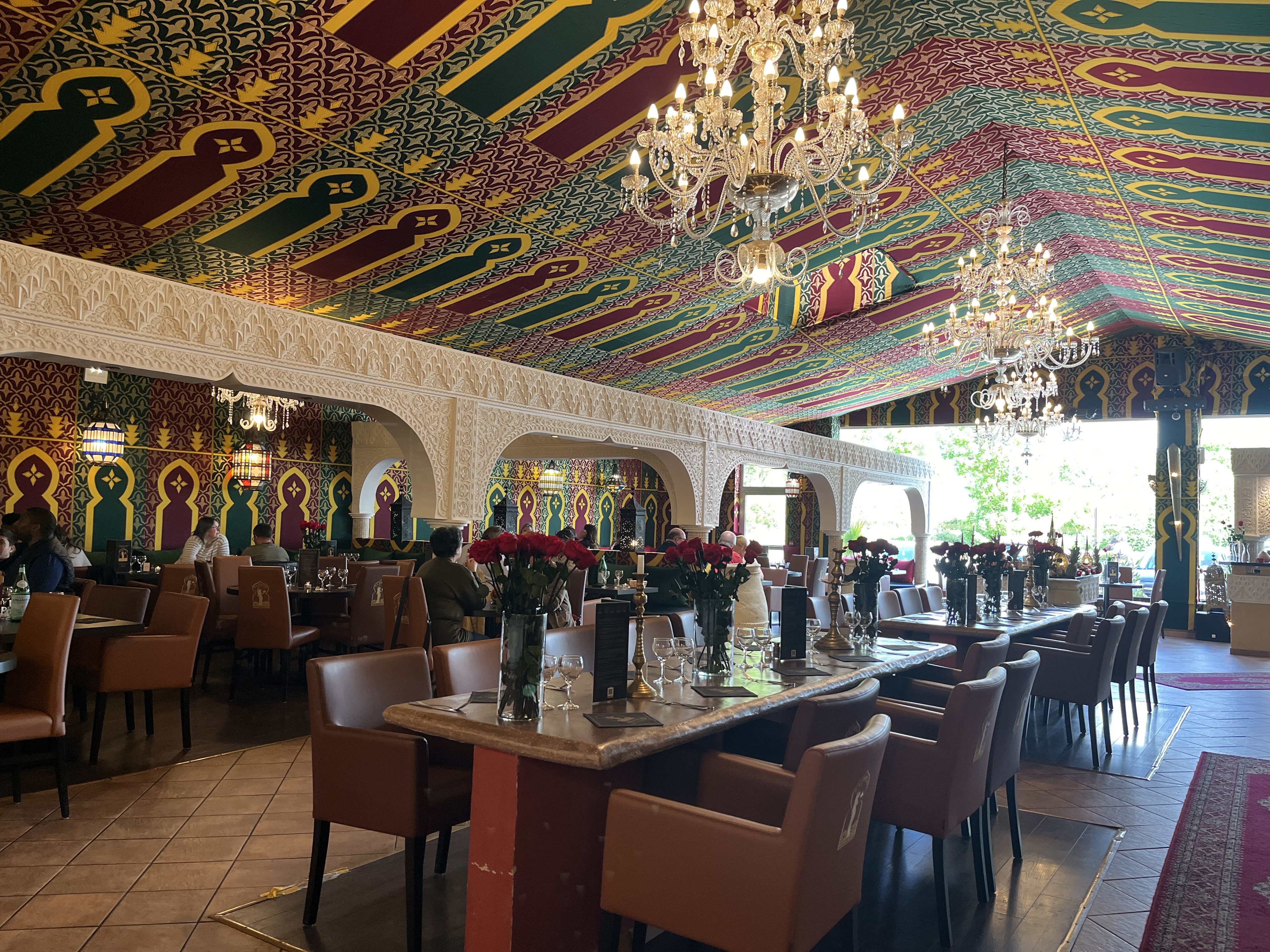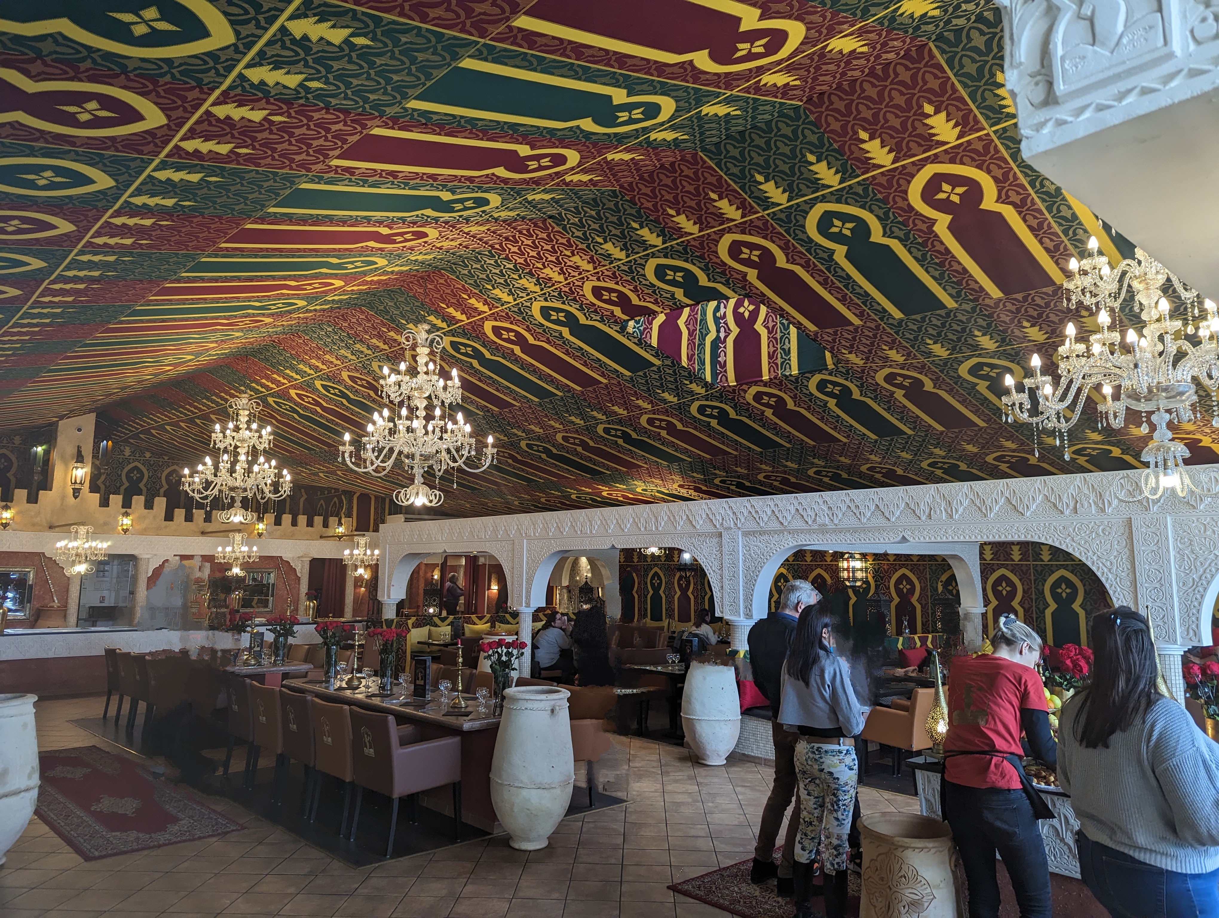 Le décor est somptueux , les 1001 nuits, le personnel sympathique dans l'ensemble,pour le personnel en salle,bof à l'accueil. Nous y sommes allés 5 fois, c'est toujours bondé. Tout à volonté,entrées plats tajine couscous et les desserts. Sincèrement concept bien pour les gros mangeurs mais loin d'un vrai restaurant marocain, rien à voir, c'est tiède et aigreur d'estomac les 3 dernières fois, mon mari aussi. Il y a eu l'effet surprise, on a voulu retenter mais on n'ira plus. A noter weekend et vendredi soir, réserver. 2 services, 19h et 21h. Et danses au long du repas ça c'est cool