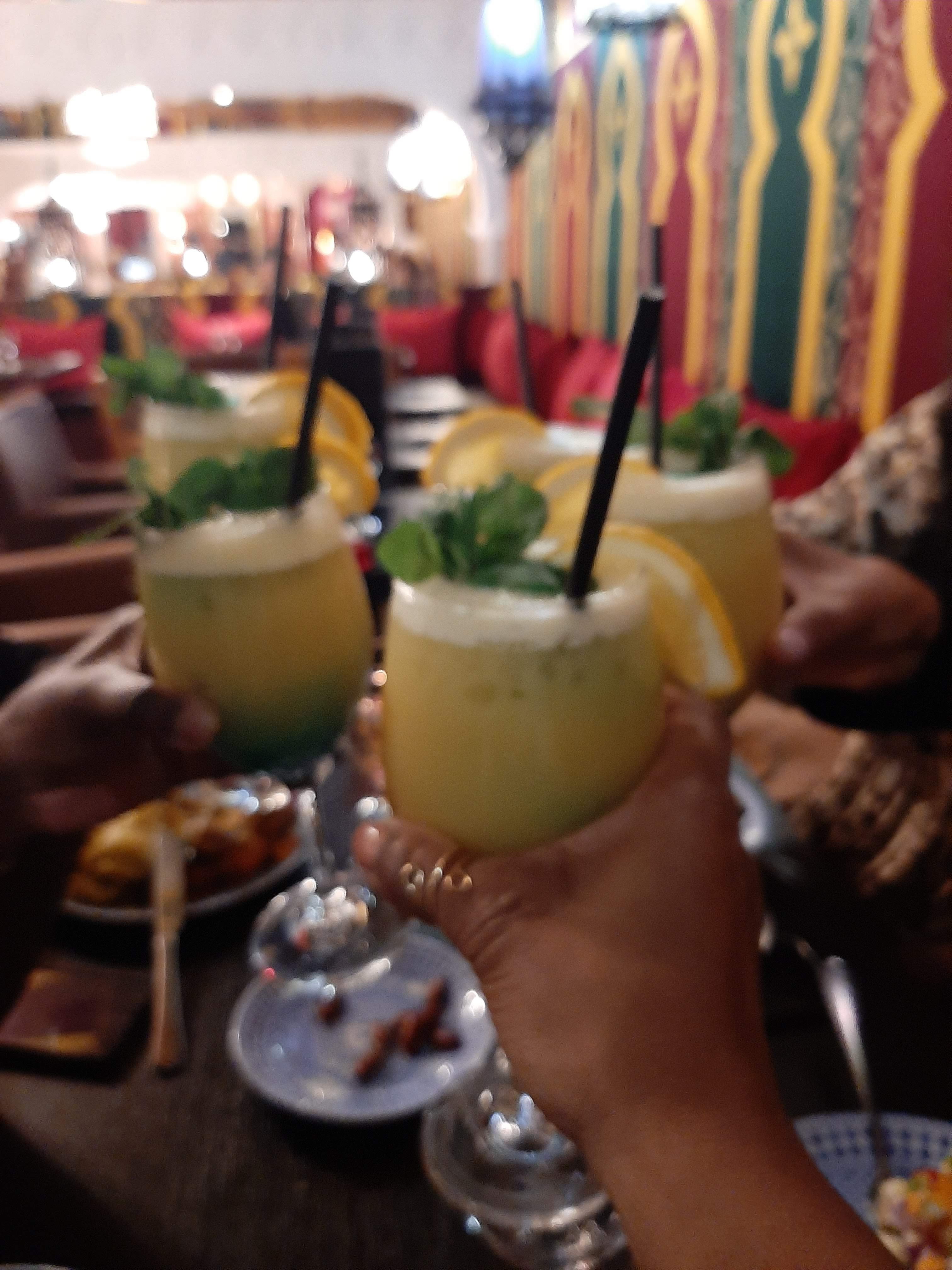 Buffet varié et délicieux. Grand choix de desserts marocains. Cocktail au thé délicieux (sans rhum pour ma part). Une danseuse qui fait participer la clientèle passe régulièrement (vendredi et samedi soir). Bonne ambiance. Service sympathique et efficace. Je conseille de réserver le weekend ce restaurant a du succès.