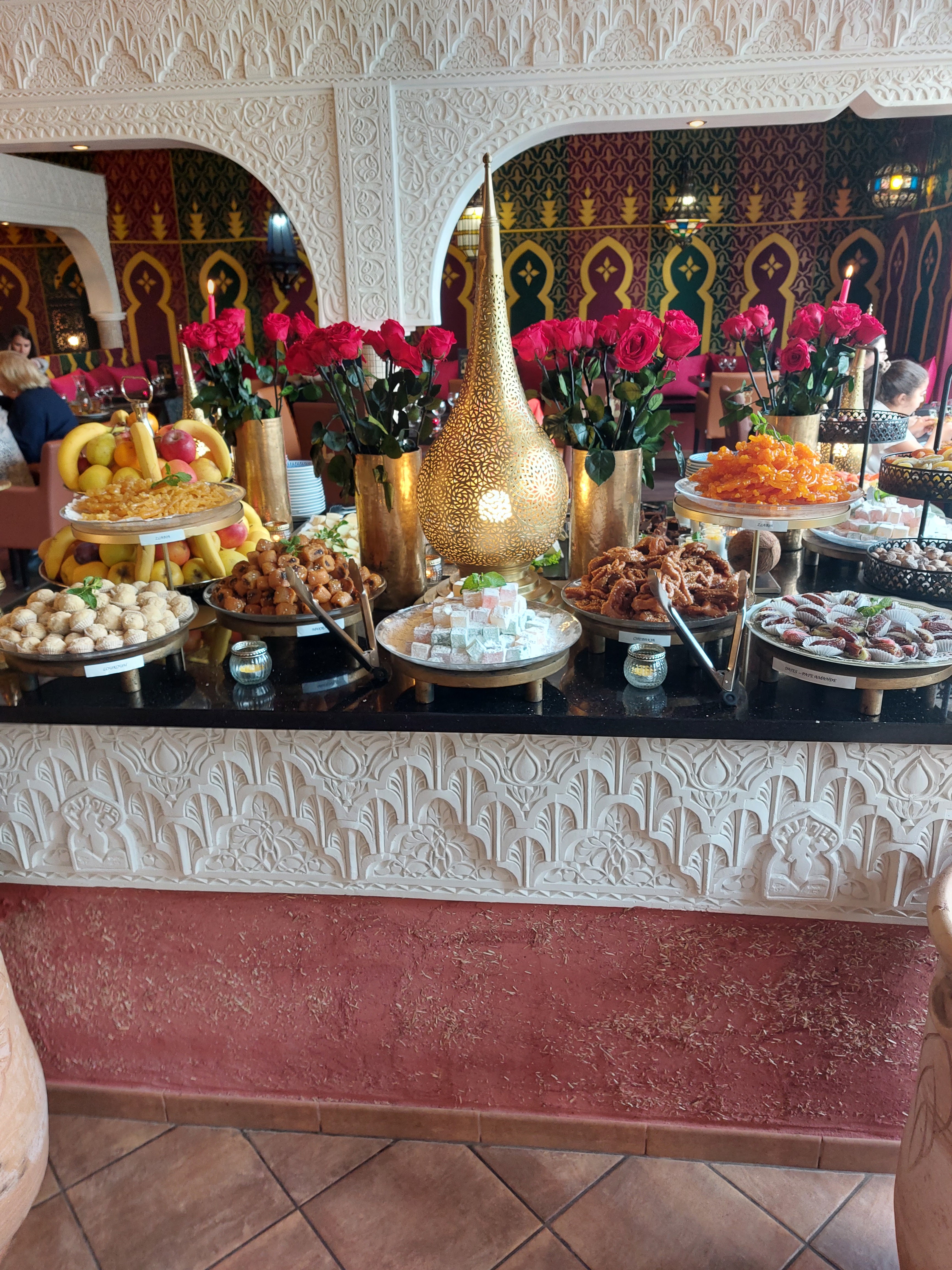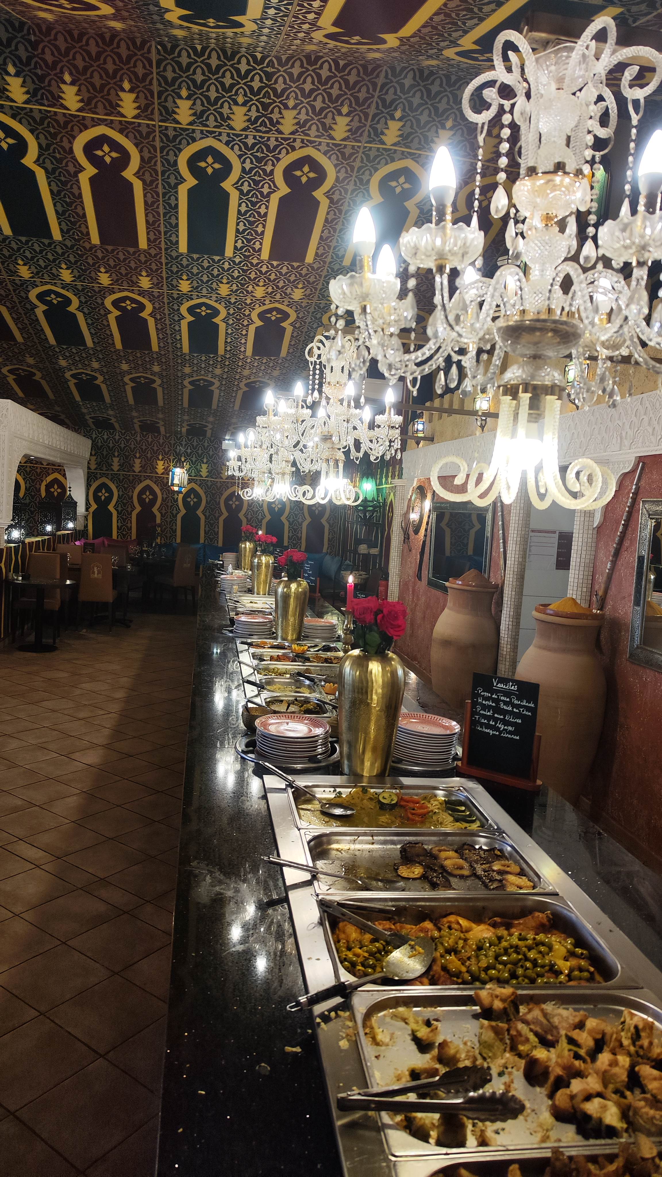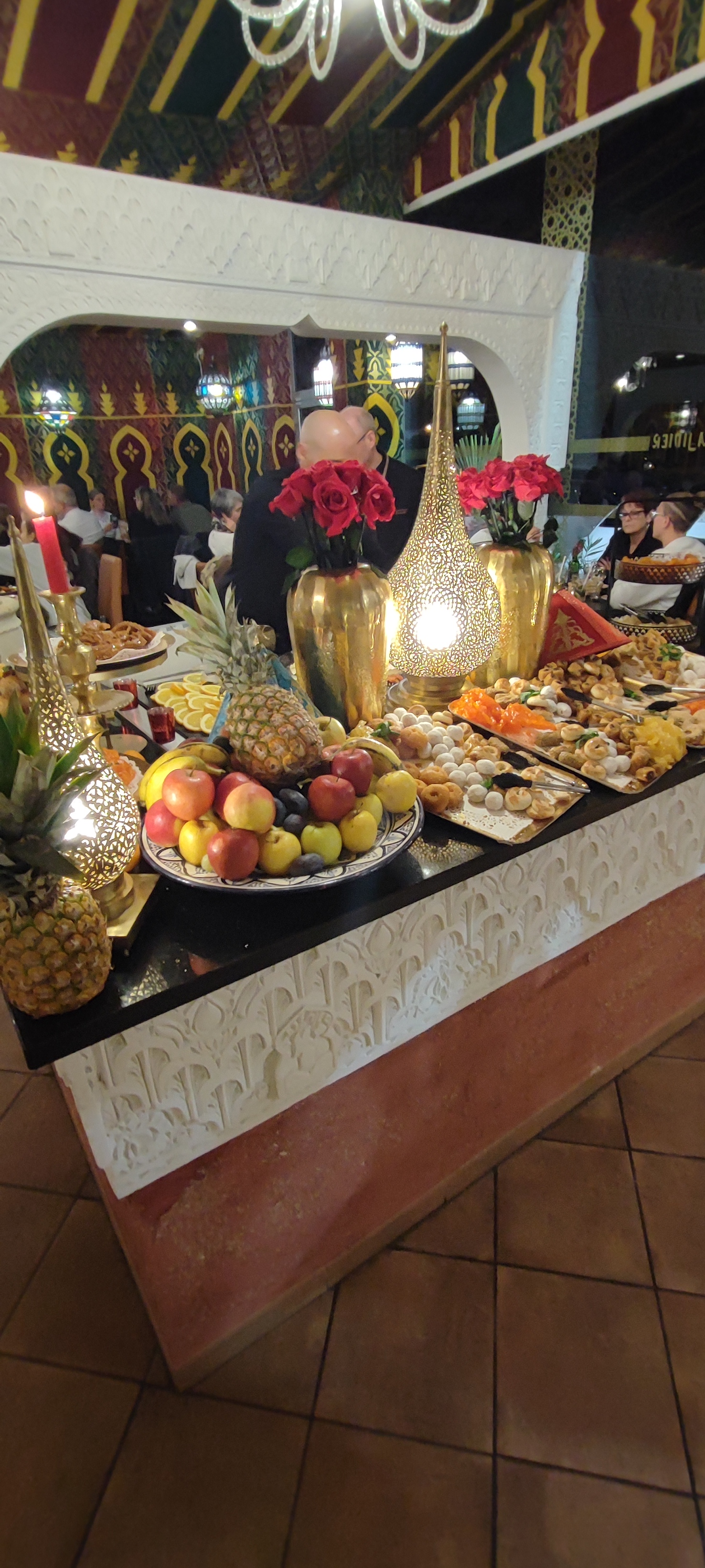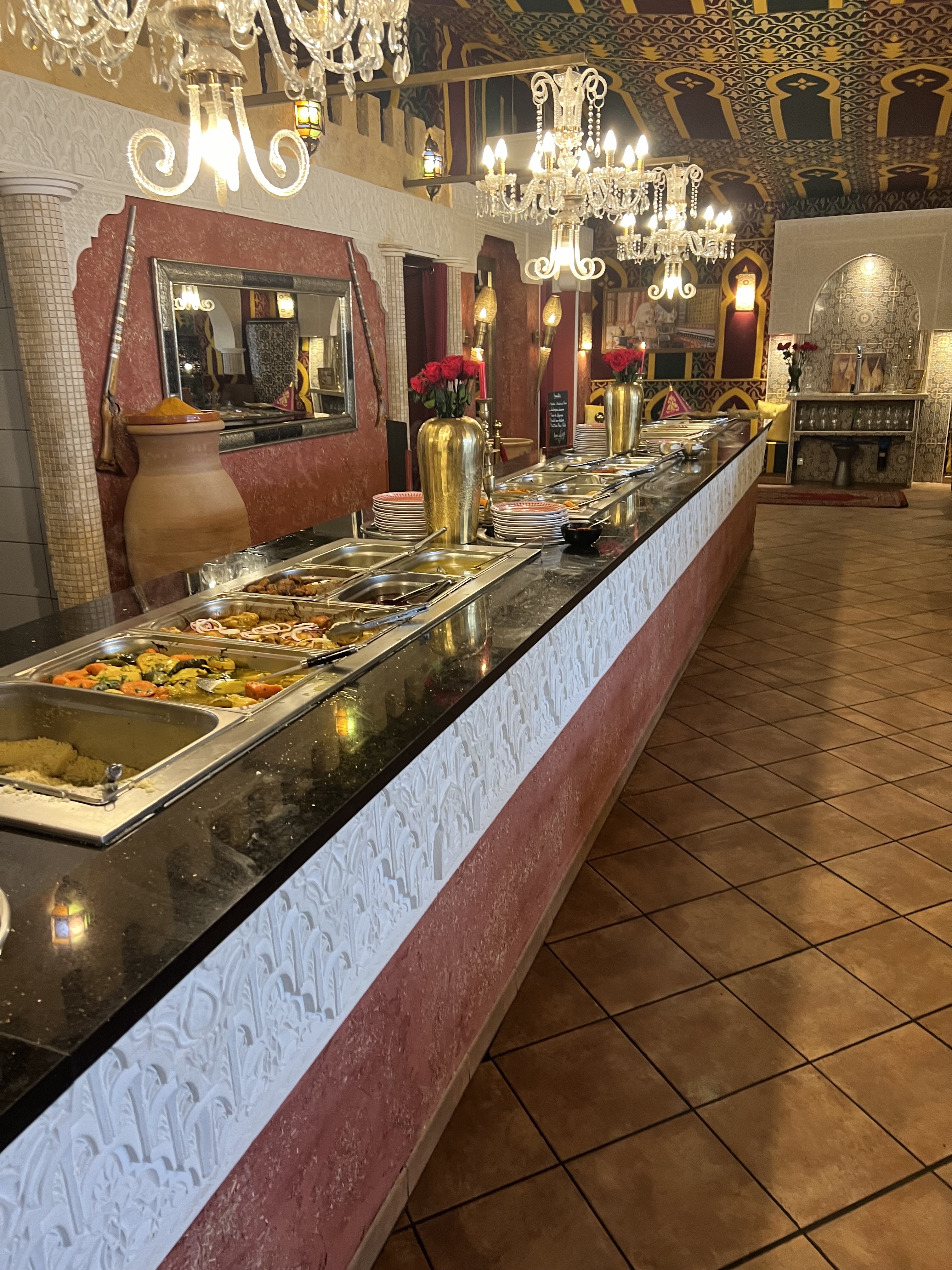 j’ai beaucoup apprécié la déco chaleureuse de ce restaurant. Le personnel est gentil. Il y a une danseuse orientale le samedi soir. En ce qui concerne, le buffet, on y trouve un peu de tout. Poulet aux olives, tajine au pruneaux, couscous… En dessert, fruits, fromages, gâteaux orientaux.. Les plats sont bons mais je n’ai pas retrouvé les bonnes saveurs marocaines( étant moi meme marocaine)