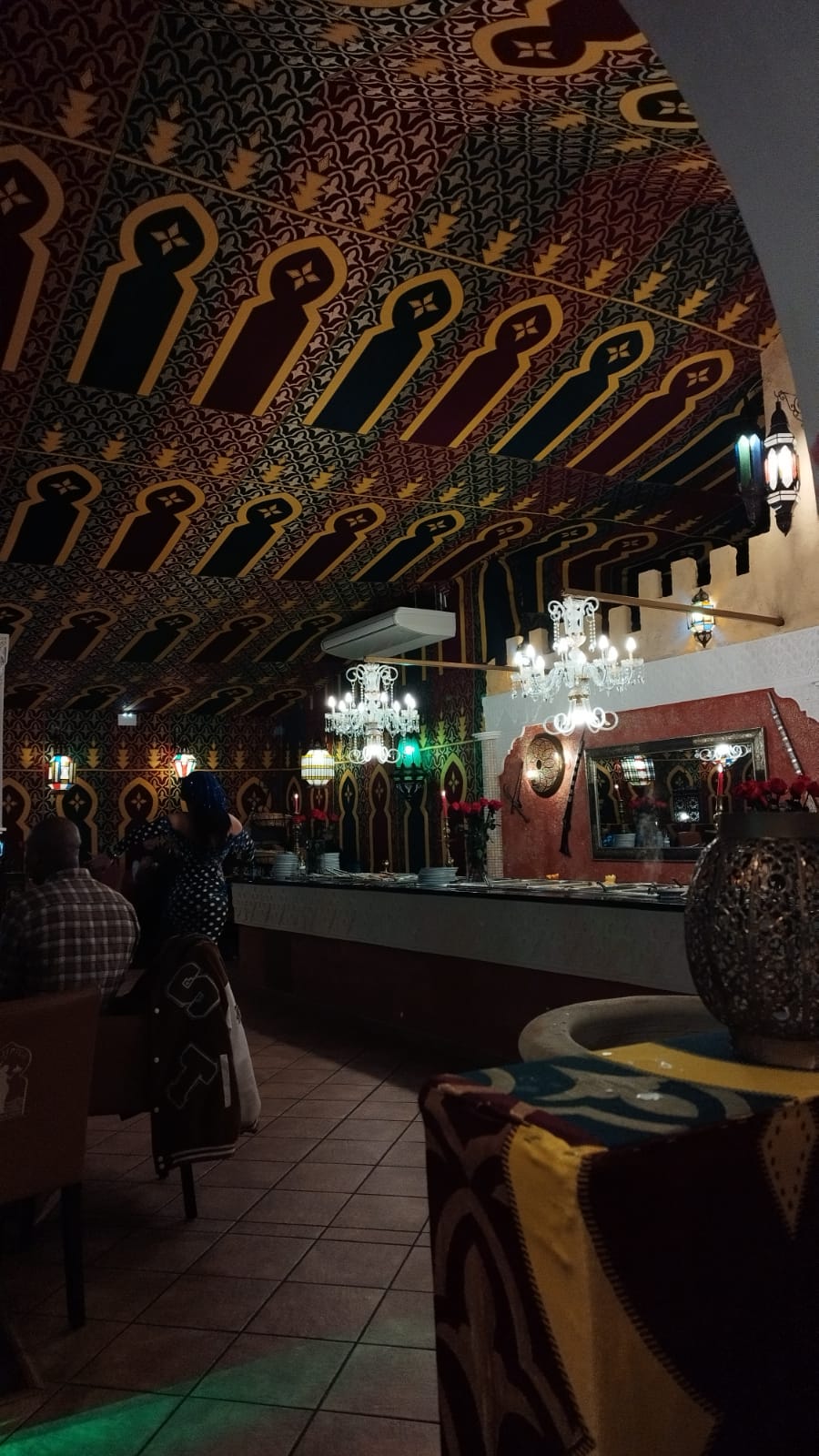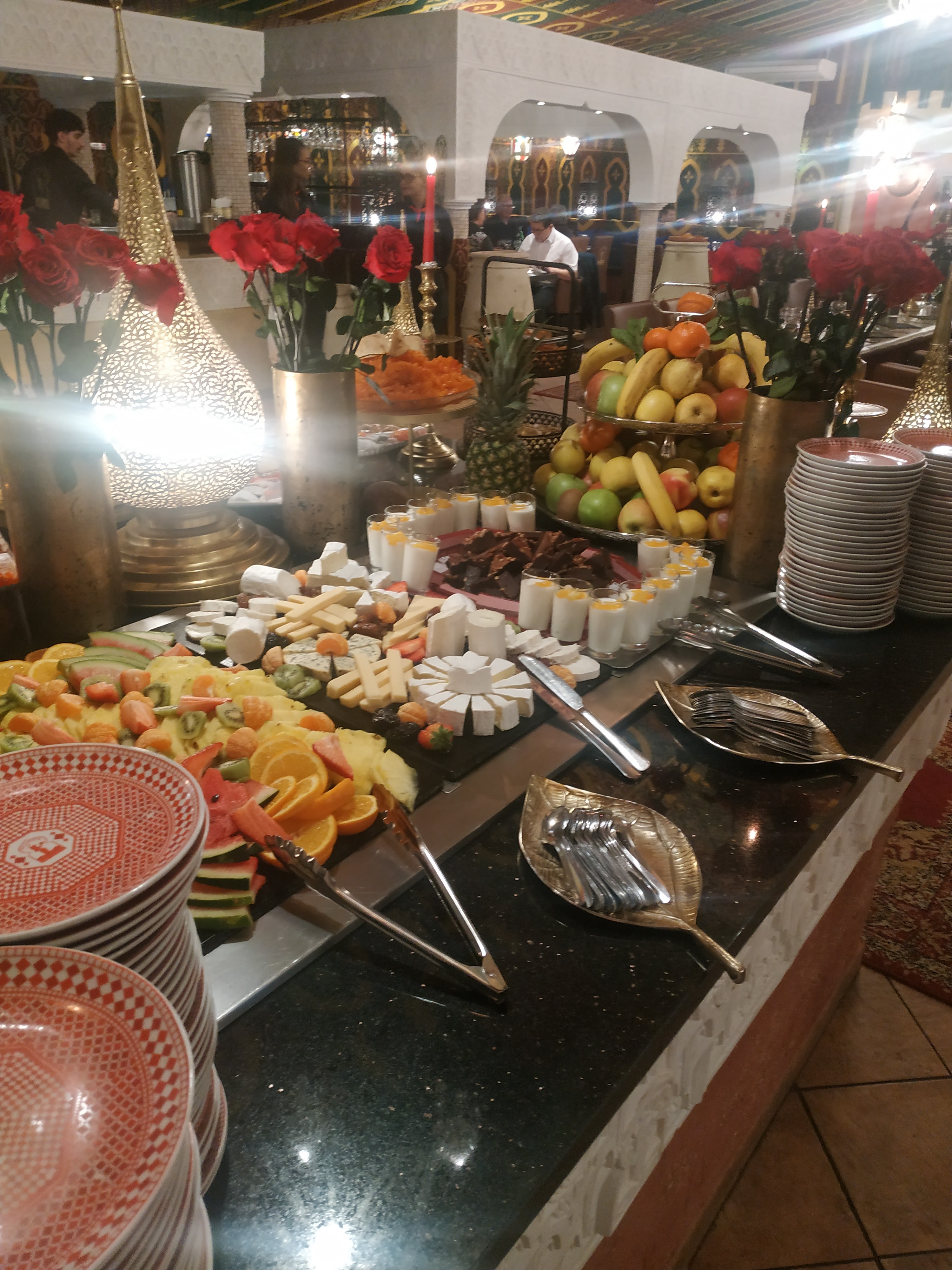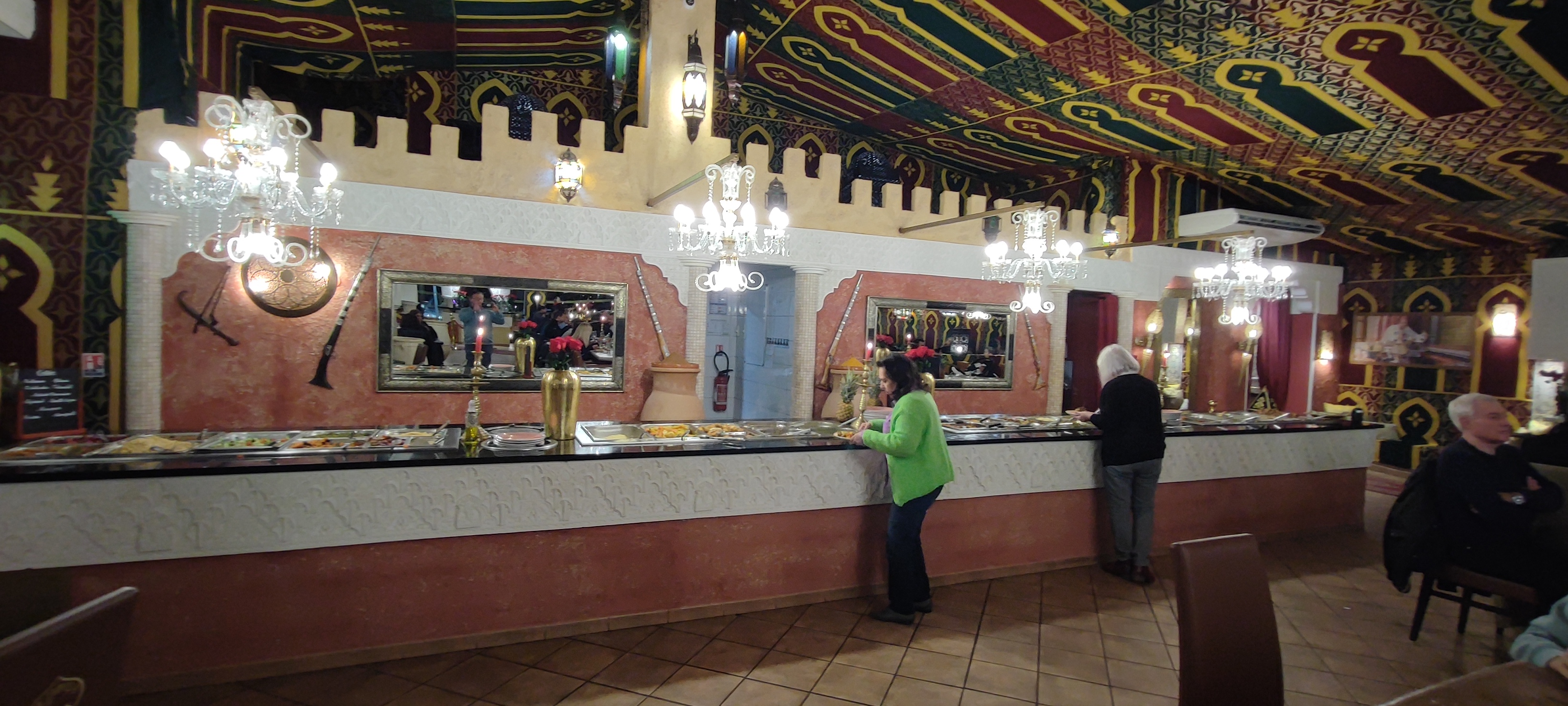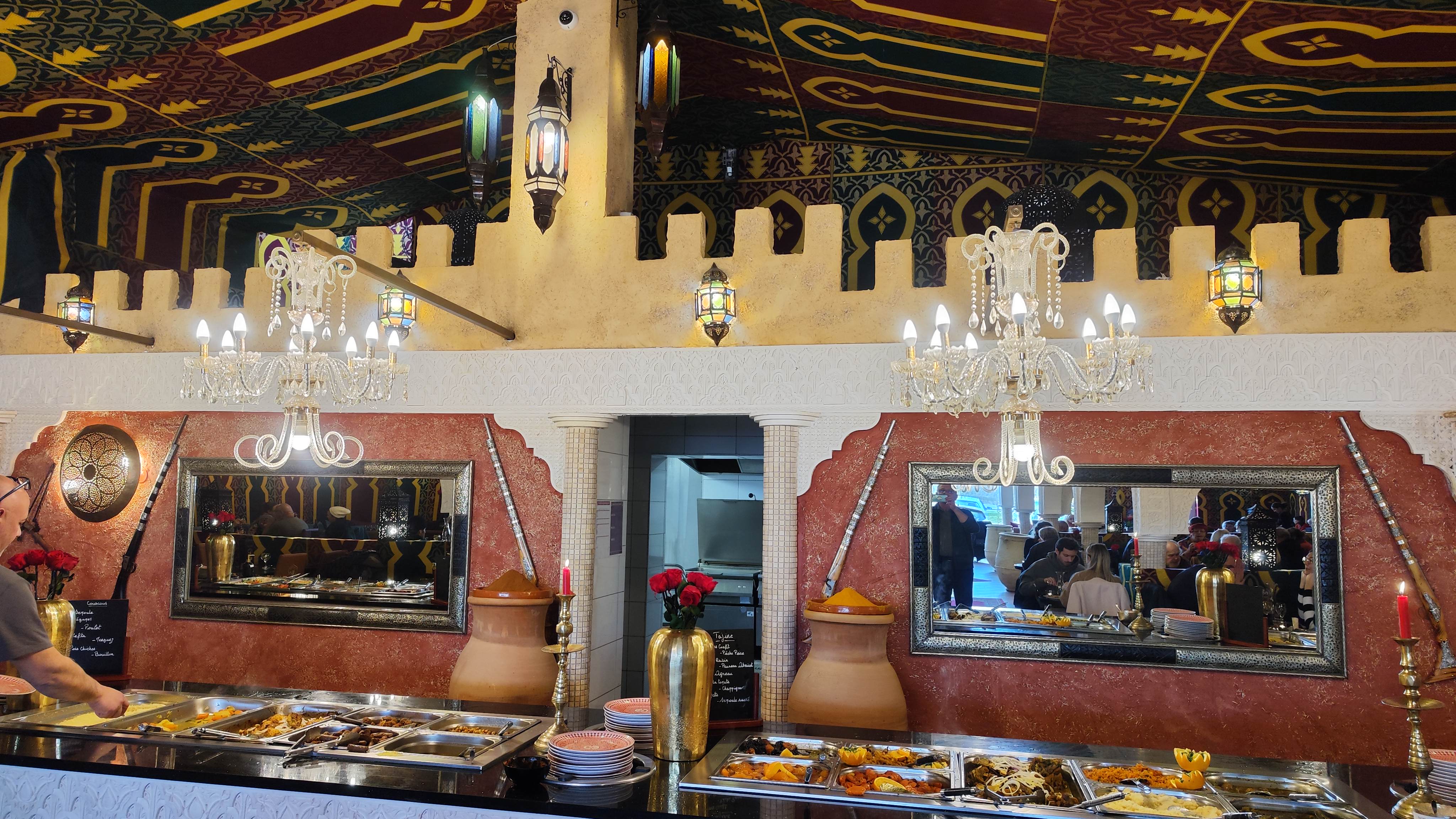 j’ai beaucoup apprécié la déco chaleureuse de ce restaurant. Le personnel est gentil. Il y a une danseuse orientale le samedi soir. En ce qui concerne, le buffet, on y trouve un peu de tout. Poulet aux olives, tajine au pruneaux, couscous… En dessert, fruits, fromages, gâteaux orientaux.. Les plats sont bons mais je n’ai pas retrouvé les bonnes saveurs marocaines( étant moi meme marocaine)
