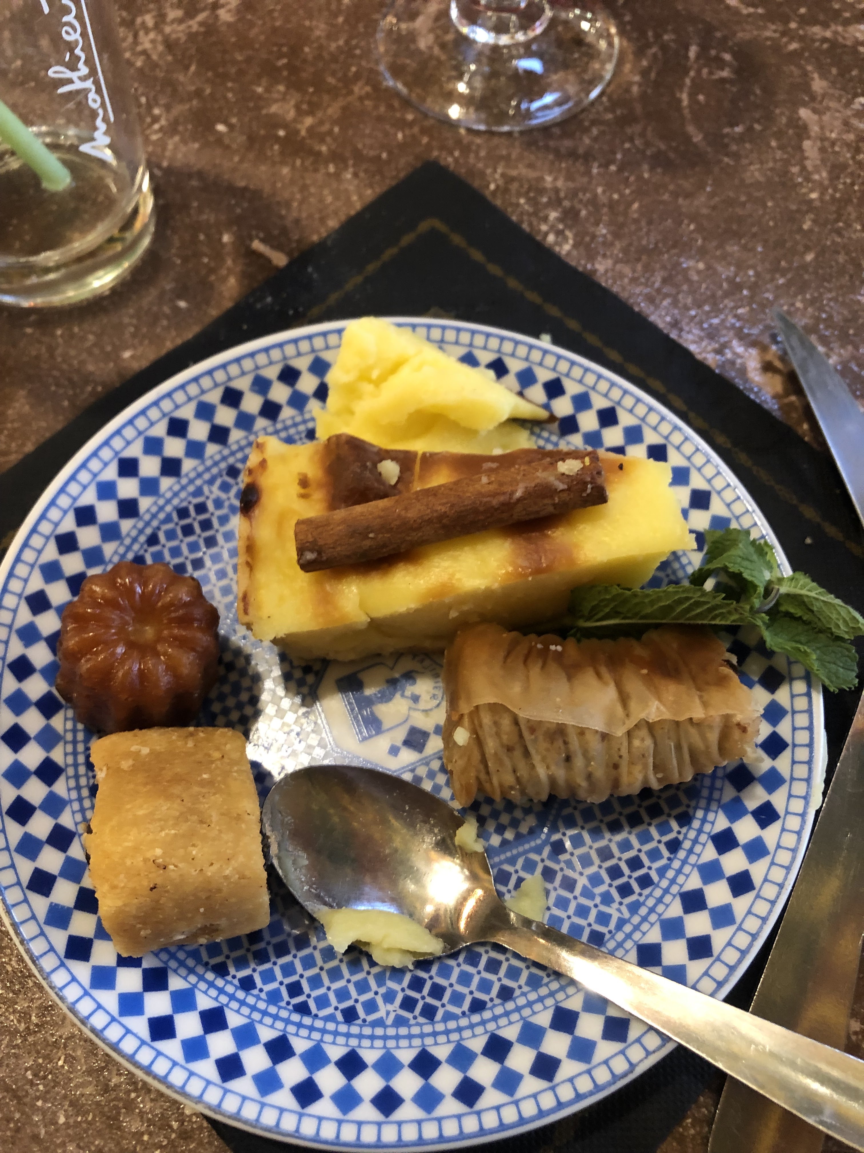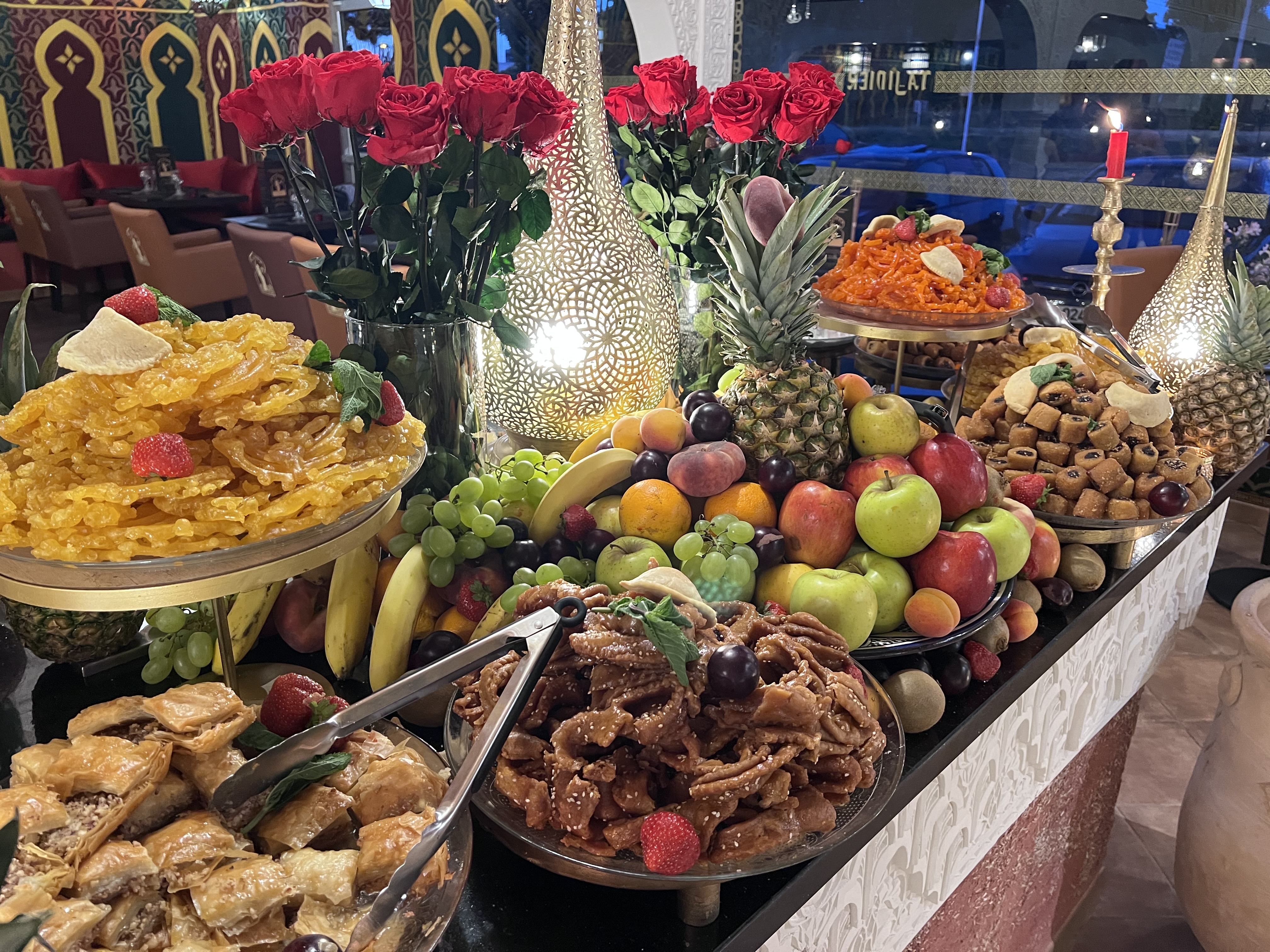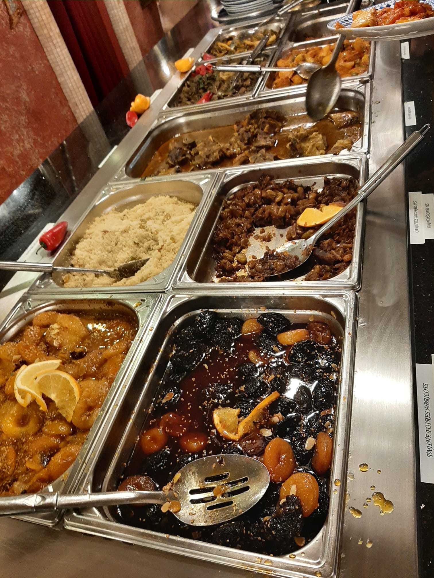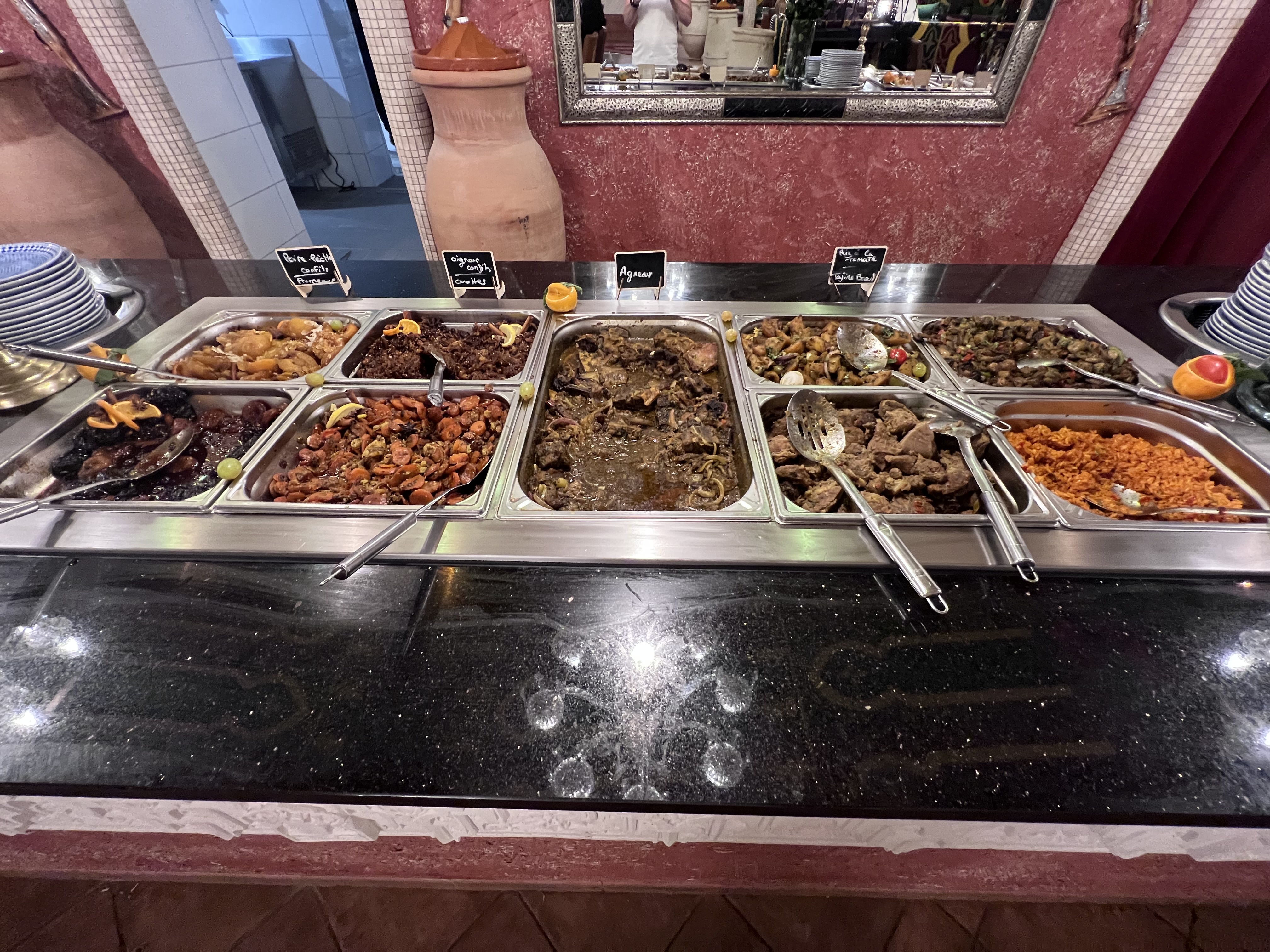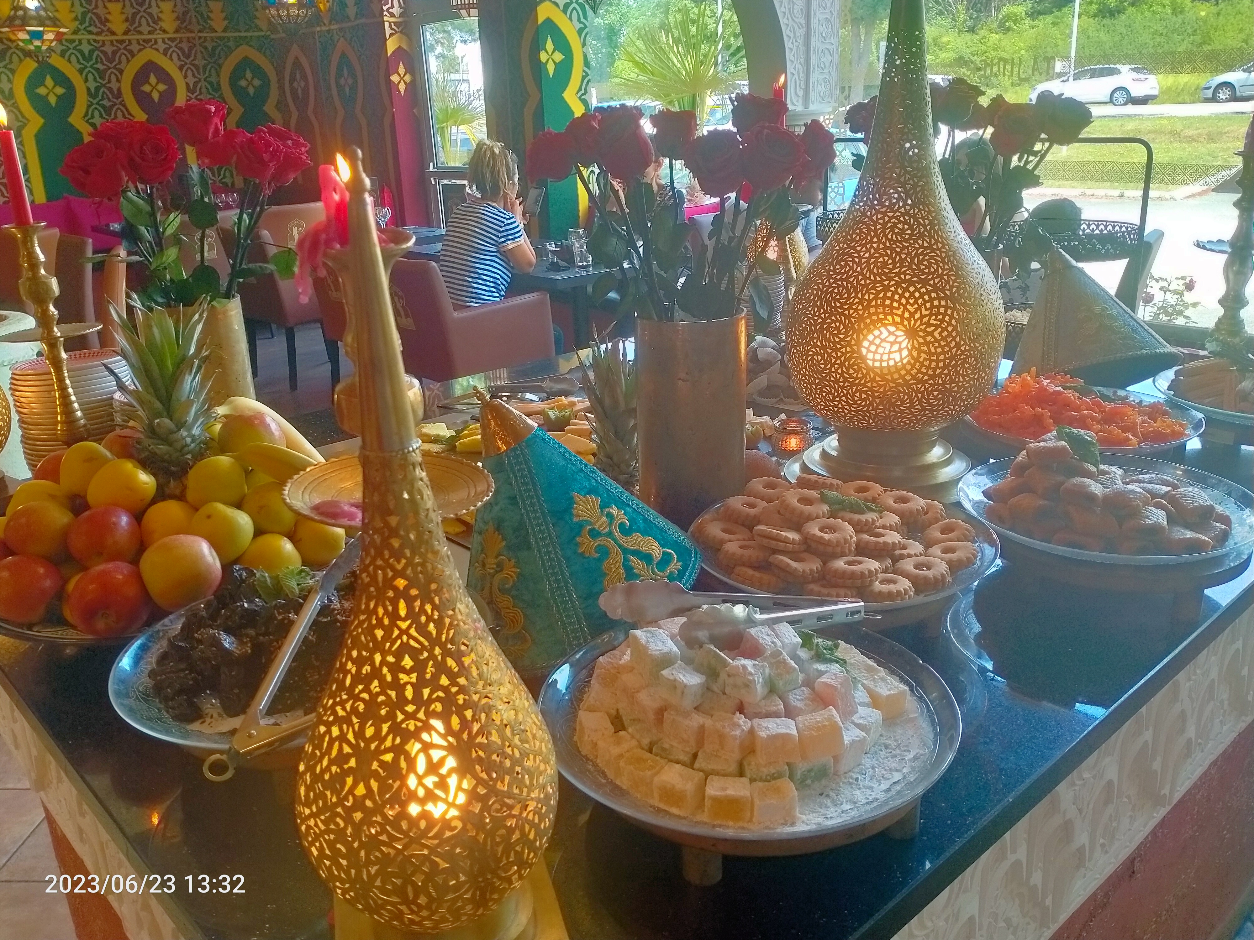 j’ai beaucoup apprécié la déco chaleureuse de ce restaurant. Le personnel est gentil. Il y a une danseuse orientale le samedi soir. En ce qui concerne, le buffet, on y trouve un peu de tout. Poulet aux olives, tajine au pruneaux, couscous… En dessert, fruits, fromages, gâteaux orientaux.. Les plats sont bons mais je n’ai pas retrouvé les bonnes saveurs marocaines( étant moi meme marocaine)