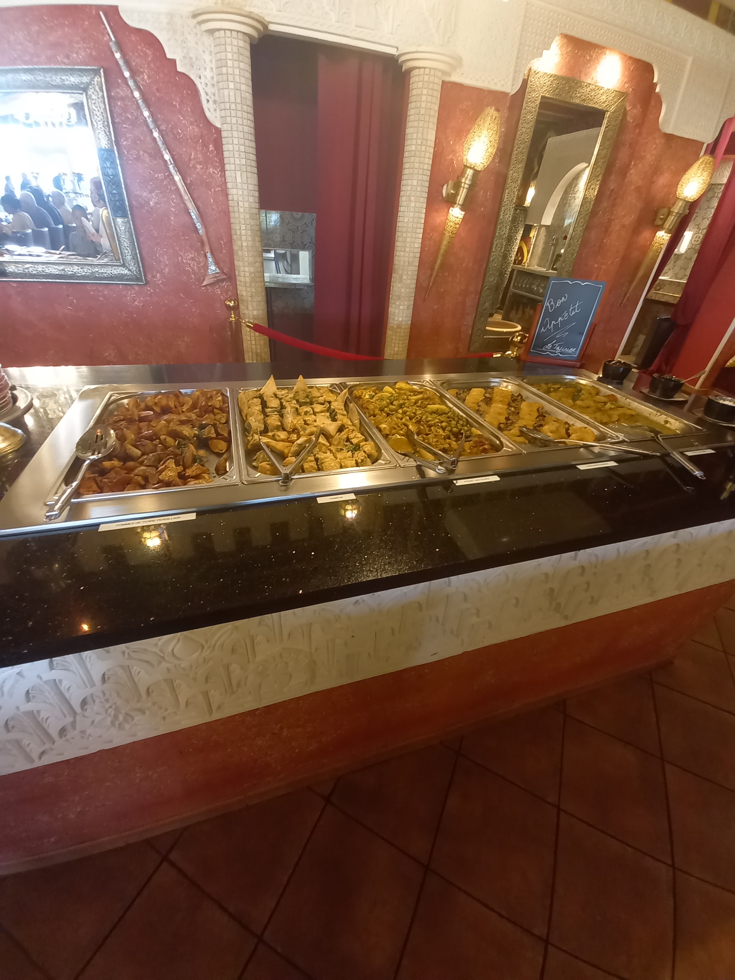 Après une mauvaise expérience au Bombay palace , j'hésitais à venir me disant qu'un nouveau restaurant avec buffet à volonté ne pouvait plus me seduire, et quelle suprise dès l'entrée le décor nous fait voyager au Maroc, la musique et le service sont agréables, pour ce qui est des plats proposés c'est plutôt bon avec du goût, les entrées sont fraiches, les plats bien mijotés et les desserts pas trop sucrés, ne mangeant pas de viande j'aurais aimé trouvé du poisson, mais dans l'ensemble j'ai été pleinement satisfait et reserverai pour profiter des animations du samedi soir. Après une deuxième visite, je rajoute une cinquième étoile pour l'ambiance du samedi soir, qui conjuque convivialité et jovialité.