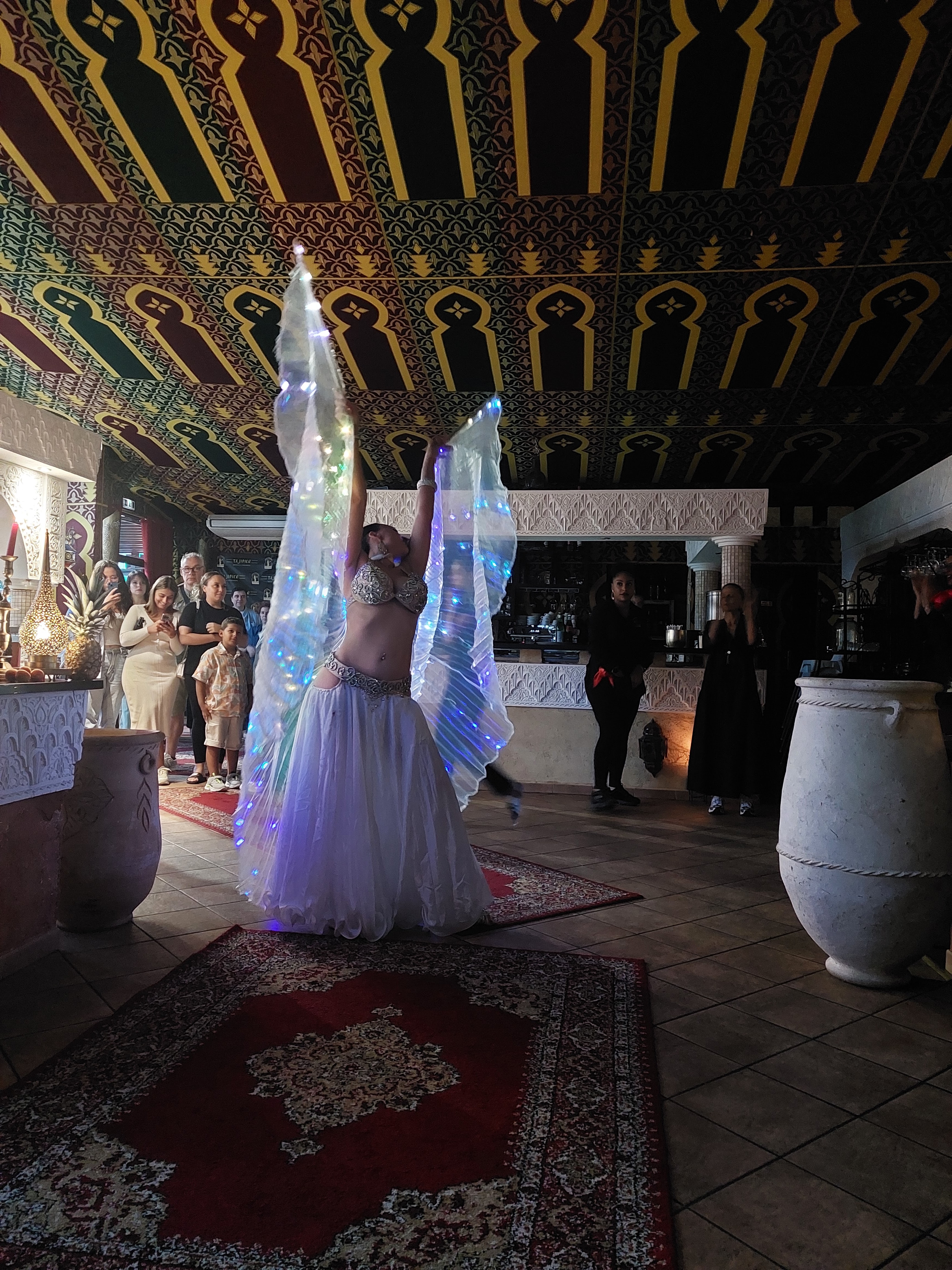 Danseuse du ventre, décor, odeur, on se croirait au Maroc ! Le cadre est fort sympathique. Restaurant à volonté. Certains produits pourraient être meilleurs, dommage.