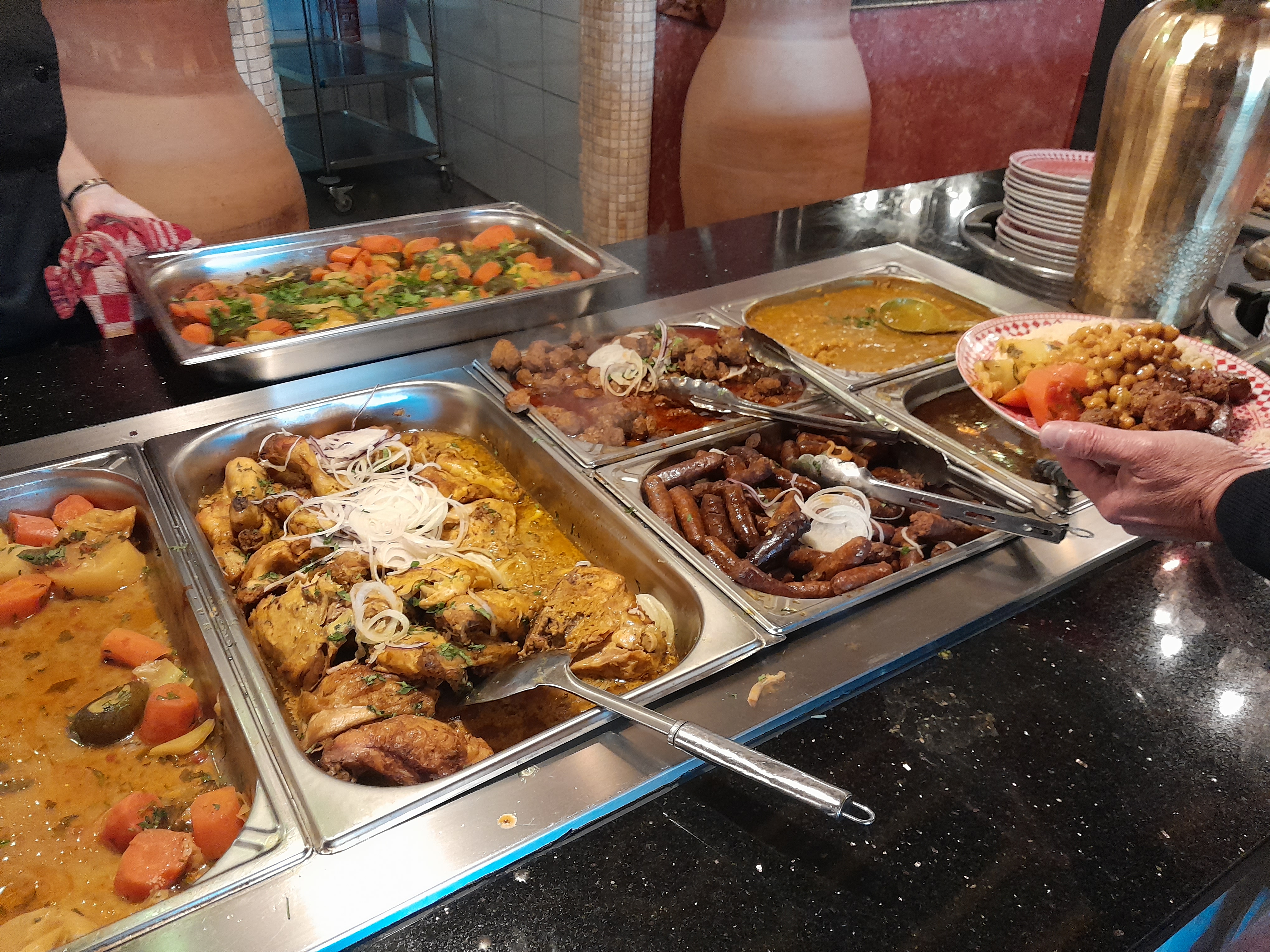 Bon le concept du restaurant avec buffet à volonté je connais, mais celui ci avec une cuisine marocaine c'était une première. Très belle salle avec une décoration réussie, beau mobilier on s'y sent bien, accueil avec le sourire. Belle présentation des mets en différents buffets (partie froide, chaudes, viandes et accompagnements) aisé à s'y déplacer pour se servir. Un grand choix il faut bien l'avouer, mais ce n'est pas de la grande cuisine (si on compare avec des restaurants typiques marocains qui eux savent présenter les plats!). Ce qui est fortement dommage, c'est que cela manque de chaleur (tiède au maximum) et pourtant ces mets doivent être servis chauds pour que l'on puissent les apprécier, les chauffe-plats ne tiennent pas la chaleur. Ici c'est très propre et convivial, nous l'avons fréquenté pour le repas du midi en semaine avec la formule buffet à volonté tout compris à 14,90 euros (vous en avez pour votre argent). La partie desserts est minimaliste (je ne pense pas que ça soit du fait maison (plutôt de la pâtisserie industrielle), mais pour ce prix...!!. Gros mangeur bienvenus. Endroit à tester et s'en faire son opinion