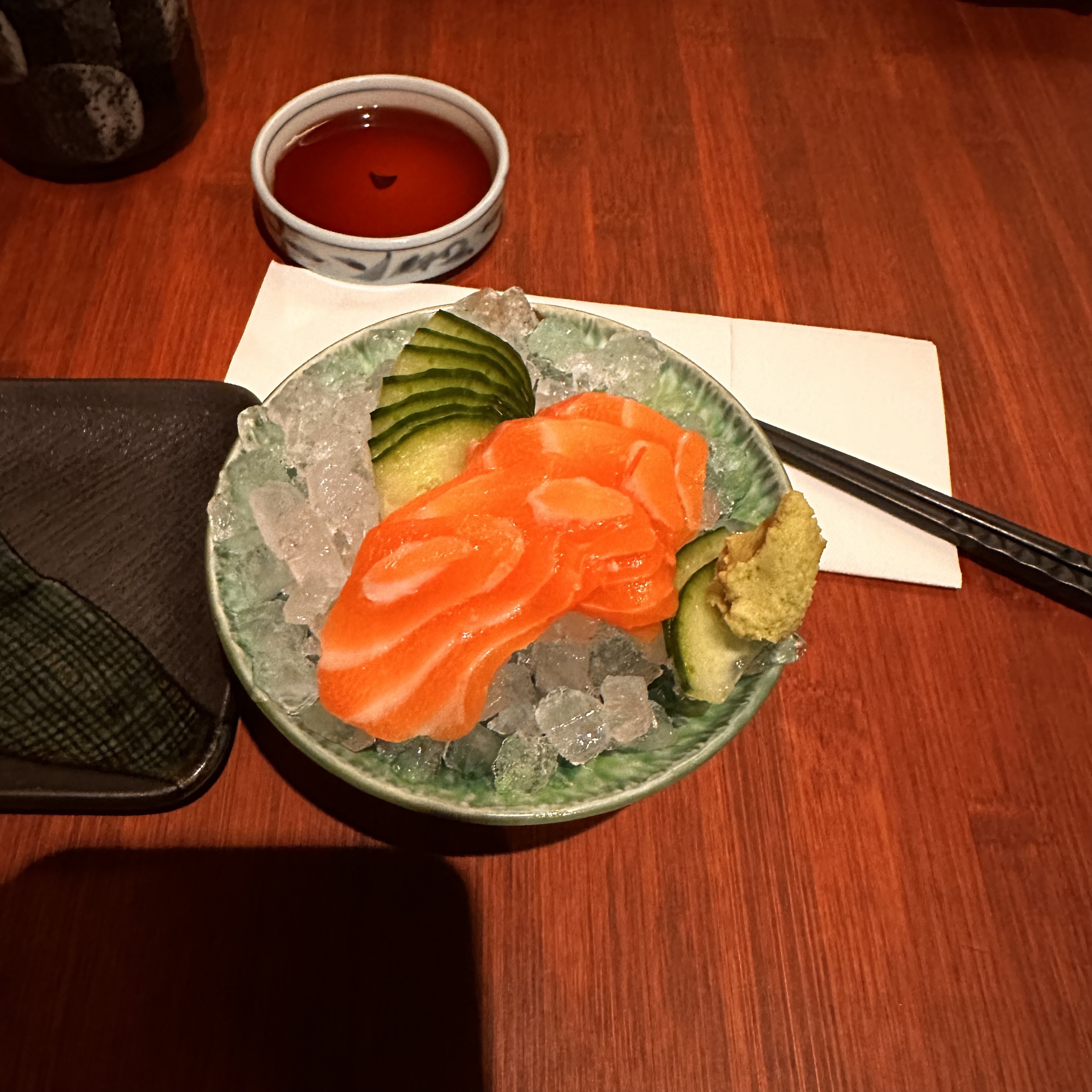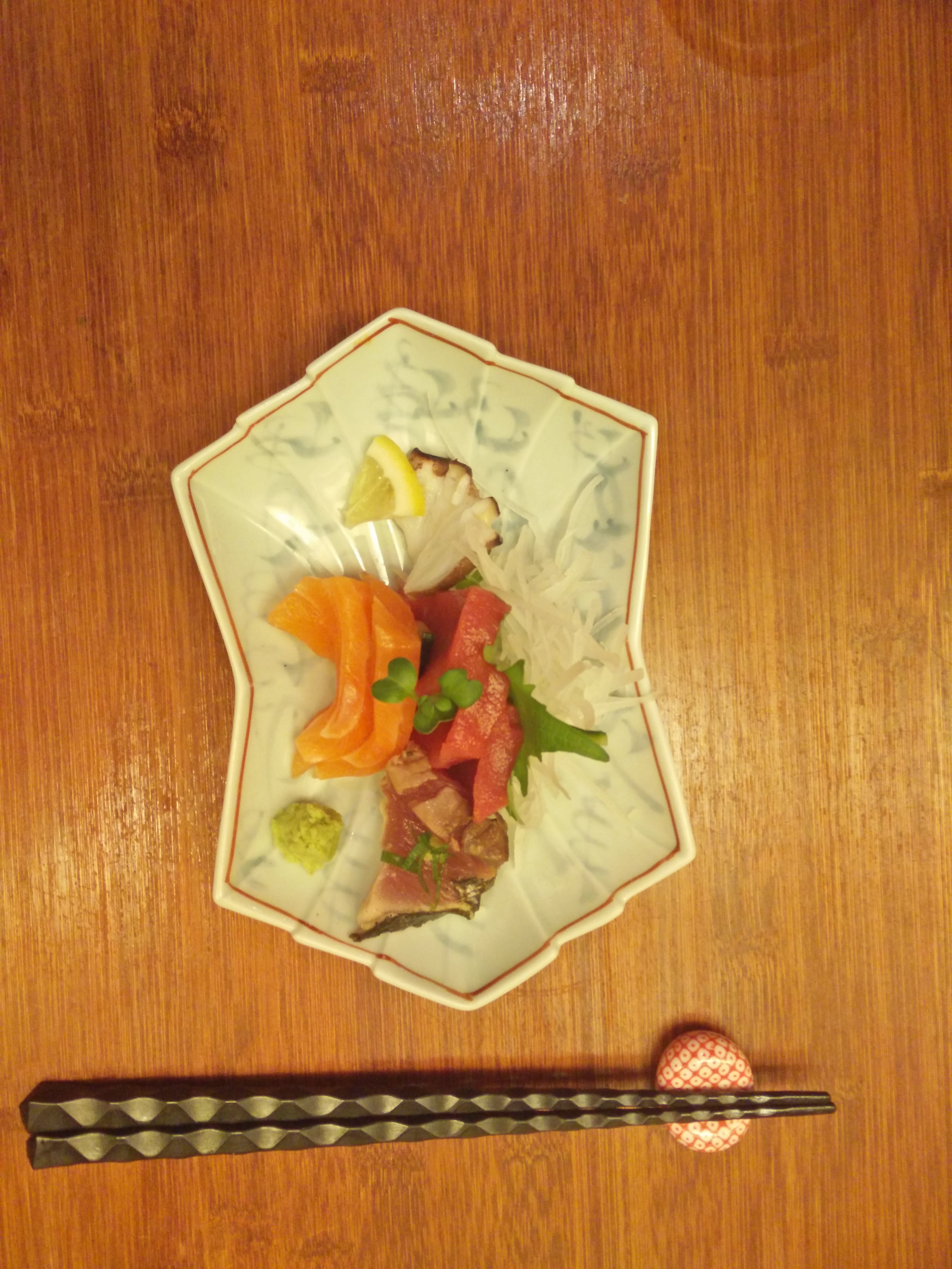 Le restaurant est en partie en travaux, donc pas de carte chaude en ce moment (poissons grillés, tempura, etc). On a donc pris du poisson frais. C'est très bon, très frais, mais trop cher pour ce que c'est quand même. Quasi 3€ le sashimi, c'est exagéré. D'autant qu'avec les travaux le cadre n'est pas exceptionnel, il faisait même froid à cause de la clim à fond 😩 Le service est très sympathique. Photo du plat de sashimis pour 2, qui coûte 60€ (pas de soupe miso, pas de riz à ce prix, vraiment regrettable).