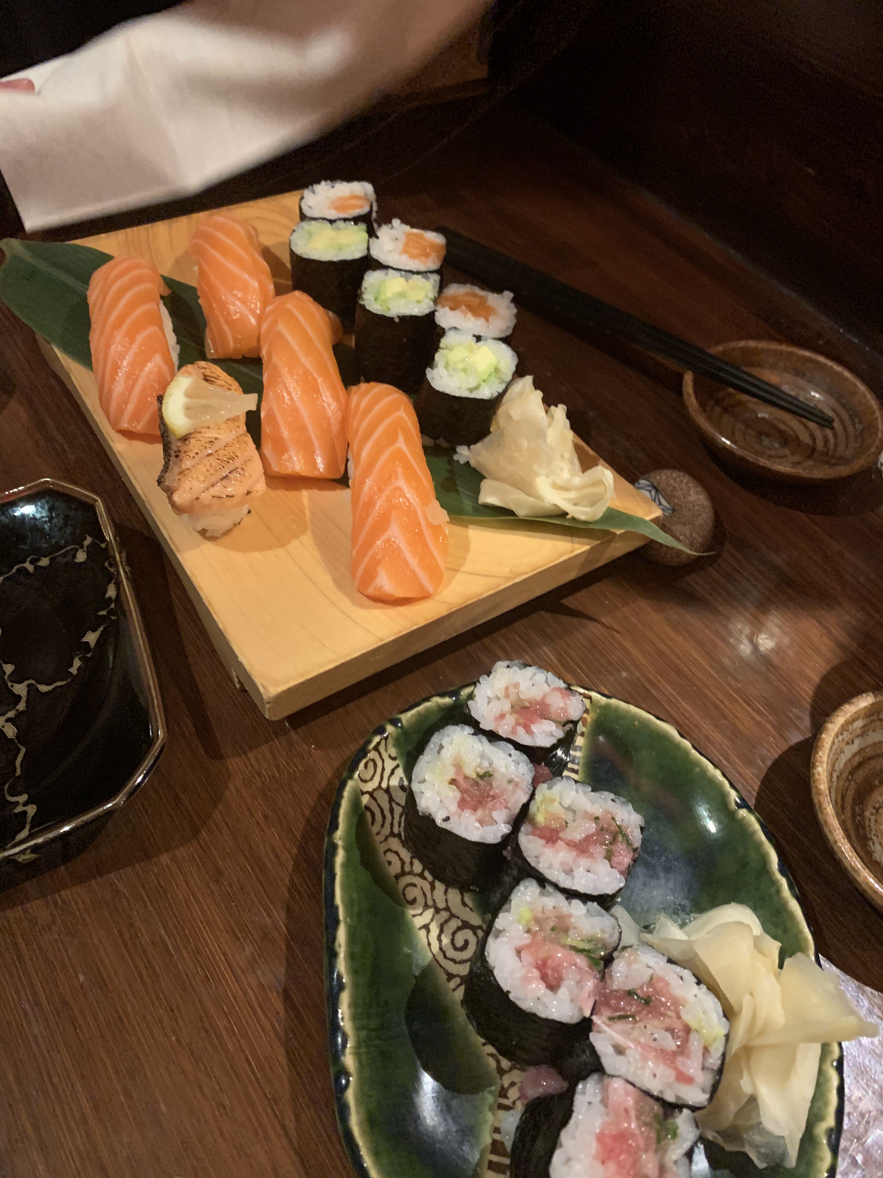 Largement surfait, ce restaurant propose certes du poisson de qualité, mais rien ne justifie le prix appliqué: service sans plus par rapport aux autres japonais beaucoup moins chers, décoration et mobilier datés et certaines chaises sont même à 2 doigts de casser sous notre poids, pas d’aération donc on repart avec les vêtements qui puent. NB1 : était-ce ponctuel ou non ? Le riz utilisé pour les sushis était de mauvaise qualité et ça s’effritait NB2 : une attention particulière en fin de repas à signaler