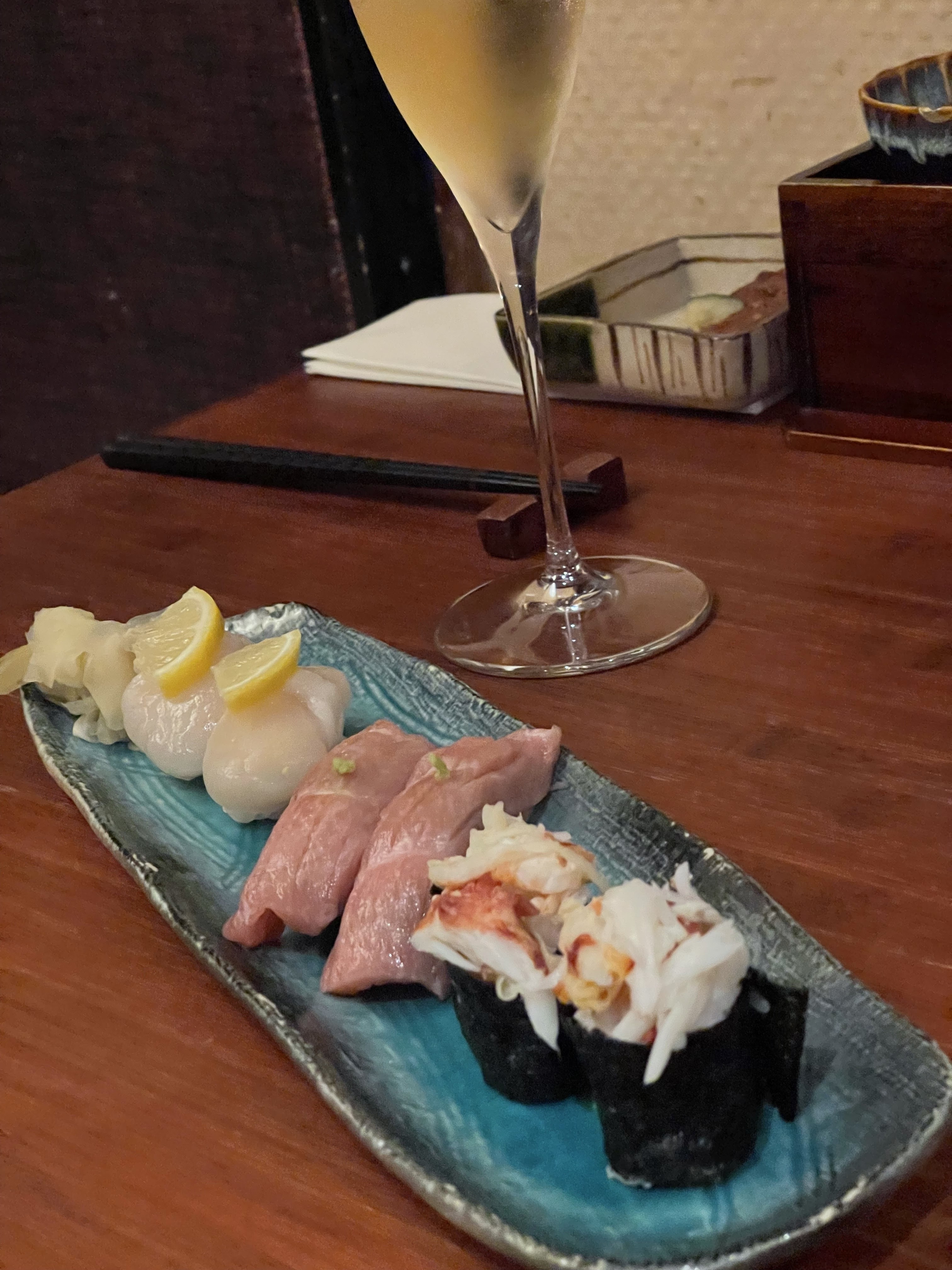 Ayant beaucoup entendu parler de ce restaurant, c’est bien la première fois je m’y rend. Tout était très bon. Le tofu dans sa sauce, les sushi au thon gras etc. Spécial mention pour le sushi au wagyu et celui à la saint jacques. Tout était très frais! Merci à l’équipe !