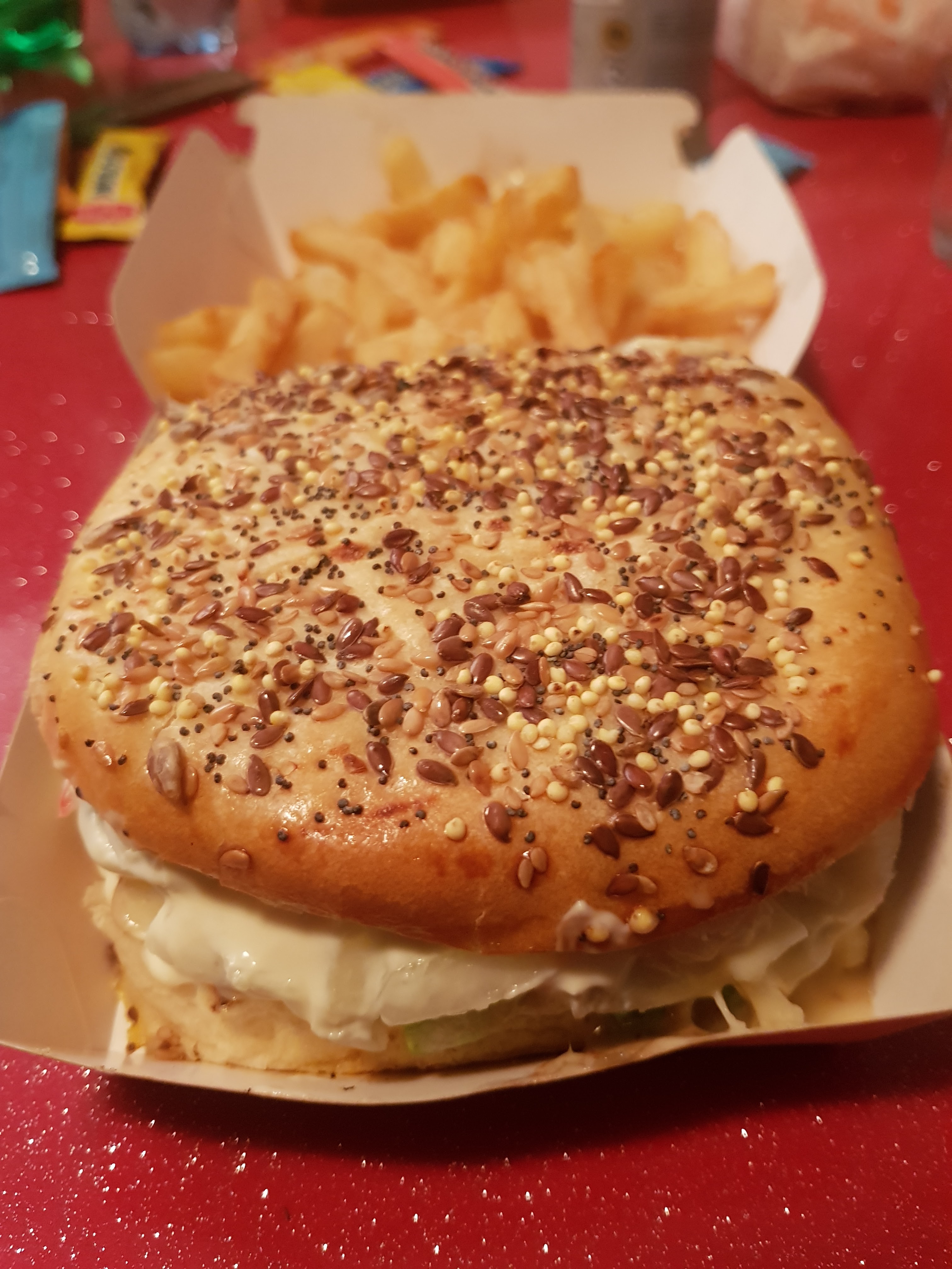 Frites degueulasse désolé y a pas d'autre mot pour les définir, hamburger au camembert sans camembert mais 3 litres de mayonnaise ou autre sauce impossible a savoir, frites cheddar mit dans une grosse boîte, suprise une petite barquette a l'intérieur, pas de cadeau dans le menu enfant et le tout majoré de presque 11€ pour la livraison eh oui le gasoil coûte très cher