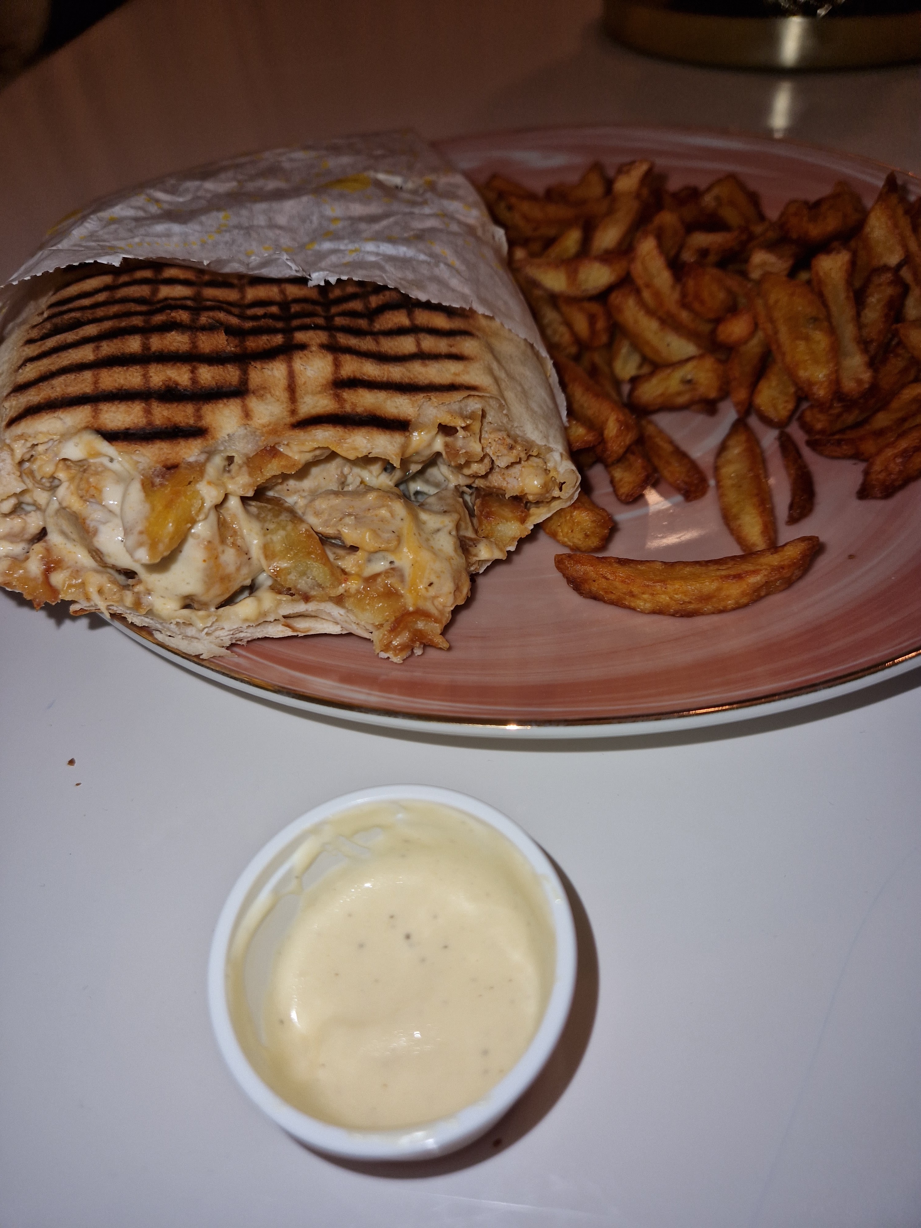 Tacos digne de ce nom. Il était parfaitement préparé. L'essentiel évidemment. Pas de 5 étoiles car le temps de préparation était largement dépassé, l'ambiance football dans une salle peu accueillante ne donnait pas envie de manger sur place. Il faut redonner un coup de boost à la salle. Enfin les 3 ou 4 flyers différents de la carte où l'on coche sont trop lourds. De beaux écrans ou tout sur une même carte suffirait a éclaircir 👍. L'essentiel encore une fois : c'était très bon ! Bravo pour cela.