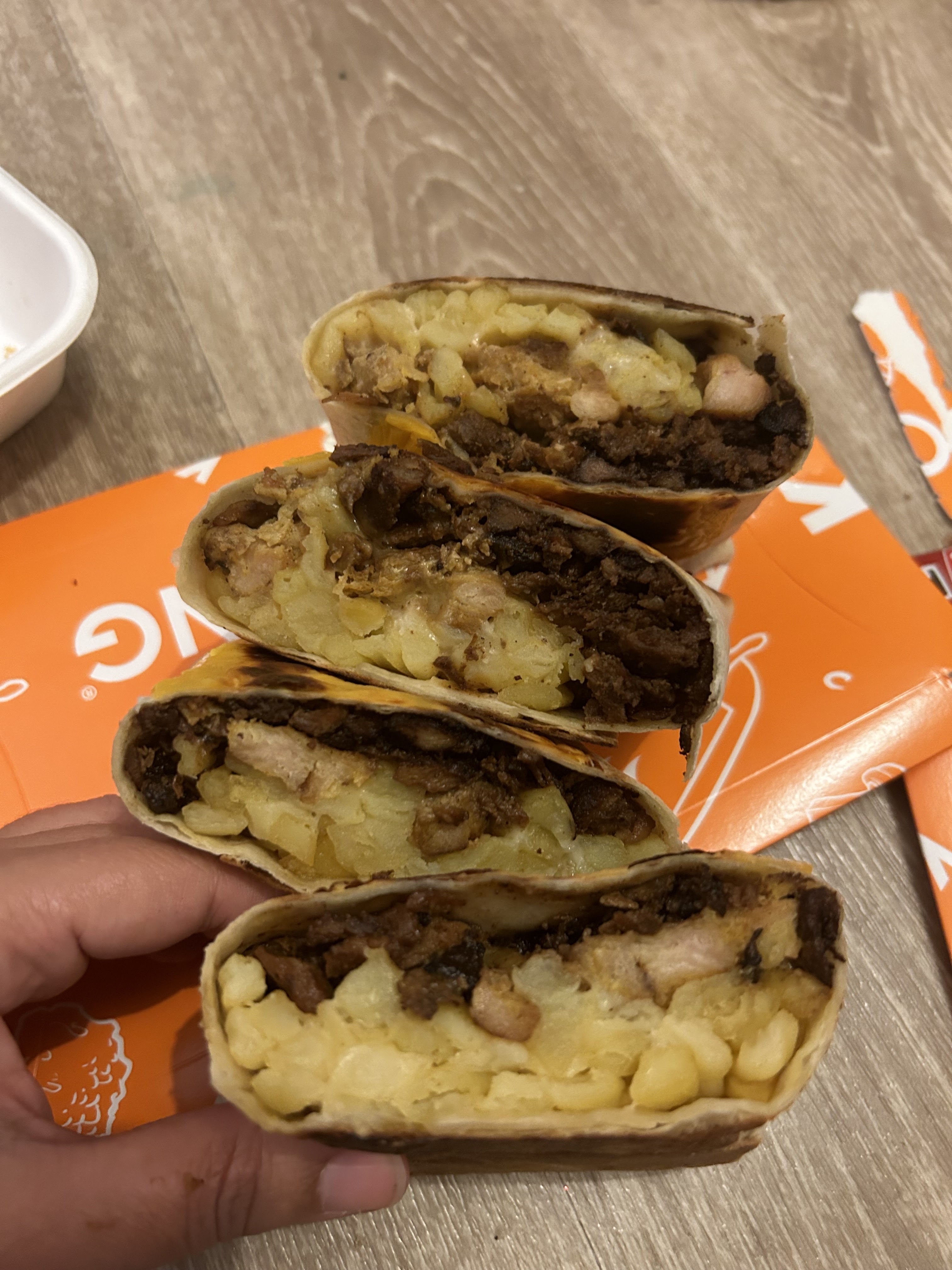 Rapide. Remplissage. Savoureux. Pas vraiment des tacos, plutĂŽt des burritos. Vous choisissez une garniture pour entrer dans le burrito. Ils sont tous dĂ©licieux. Ils sont assez copieux donc un par personne suffit. Il a Ă©tĂ© emballĂ© trĂšs rapidement pour l'heure du dĂ©jeuner, alors soyez prĂȘt pour une courte attente.