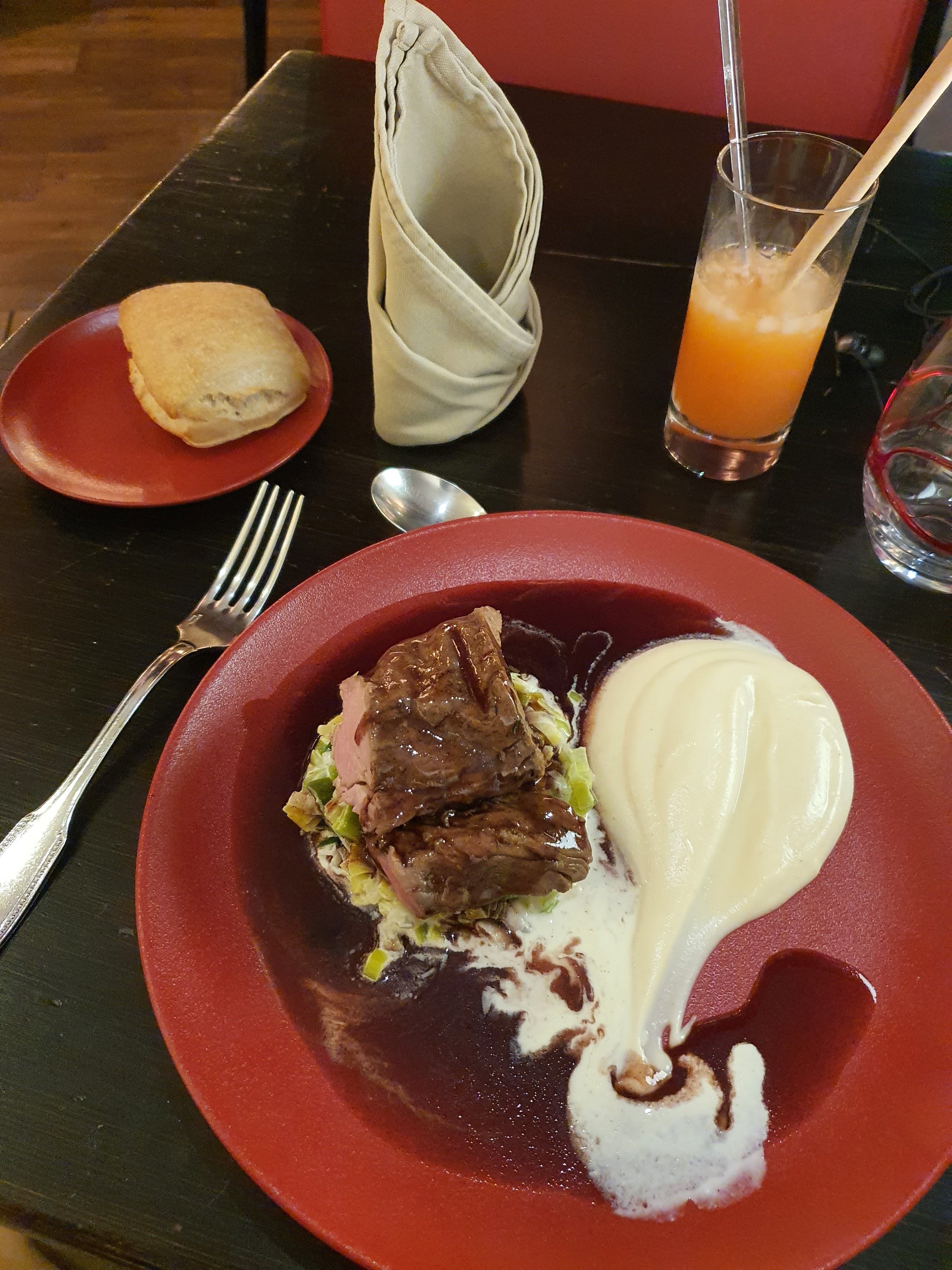 Très bon restaurant. J'ai mangé un filet de veau excellent, accompagné avec un velouté de chou fleur très bon. Je recommande !