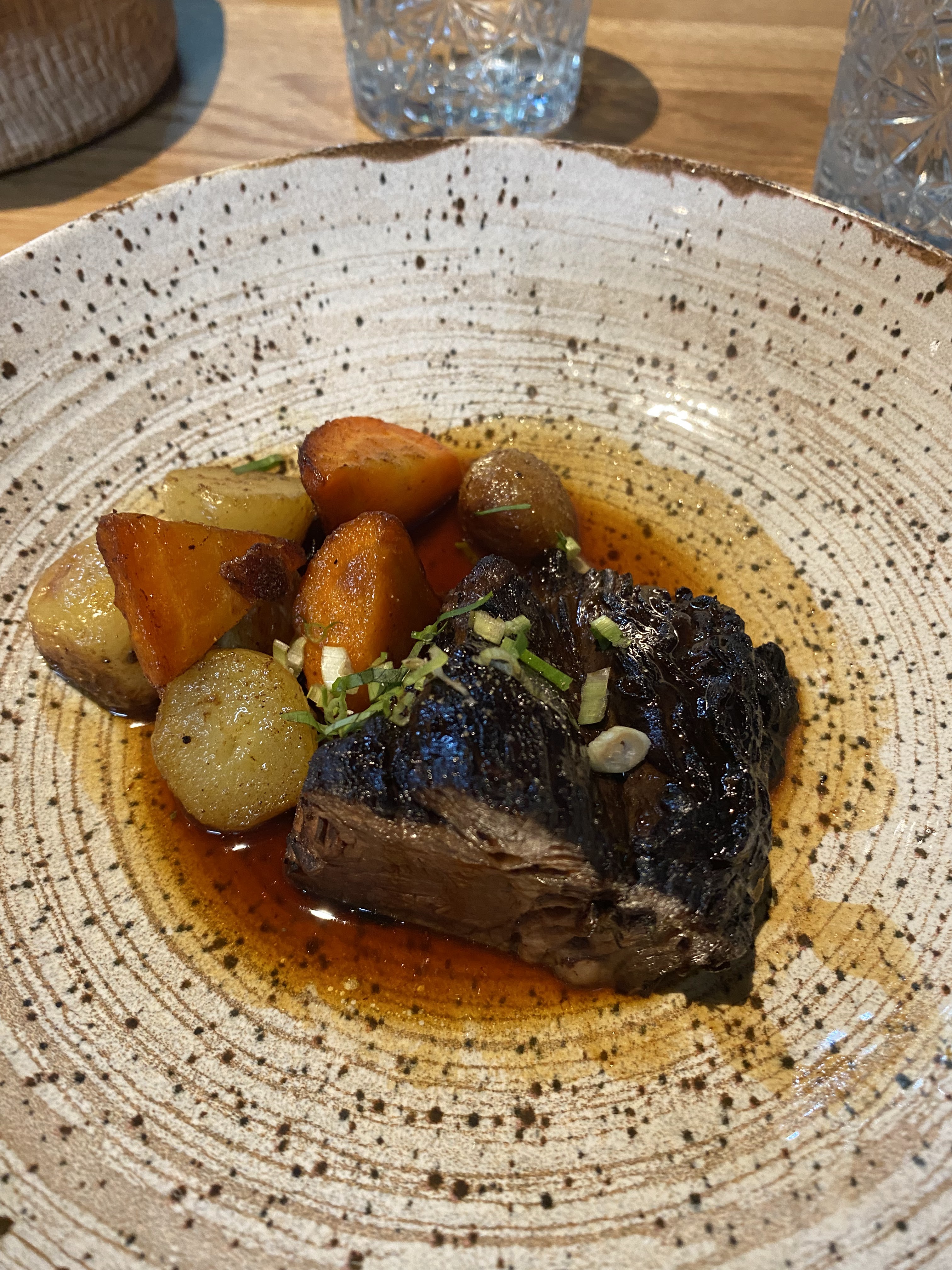 Le cadre est sympathique. La cuisine est très bonne mais nous sommes sortis de table avec faim. En effet, nous avons opté pour le menu en 5 temps (2 entrées, 2 plats et 1 dessert) dans l'espoir d'être repus à la fin du repas. Malheureusement, les portions étaient ridiculement petites. Cela gâche l'expérience et nous a conduit à nous jeter sur le pain. Dommage.