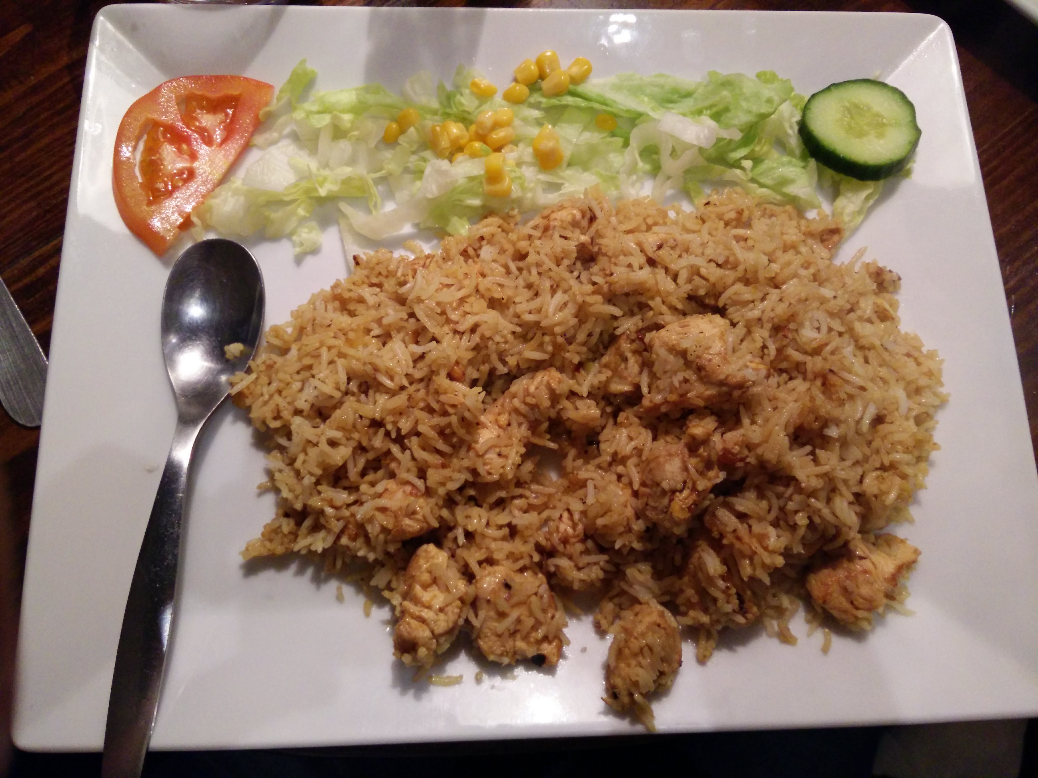 On a pris une belle assiette de riz au curry de poulet avec une brochette de poulet tandoori. C’est généreux et bon. On sort repus et pas déçu.