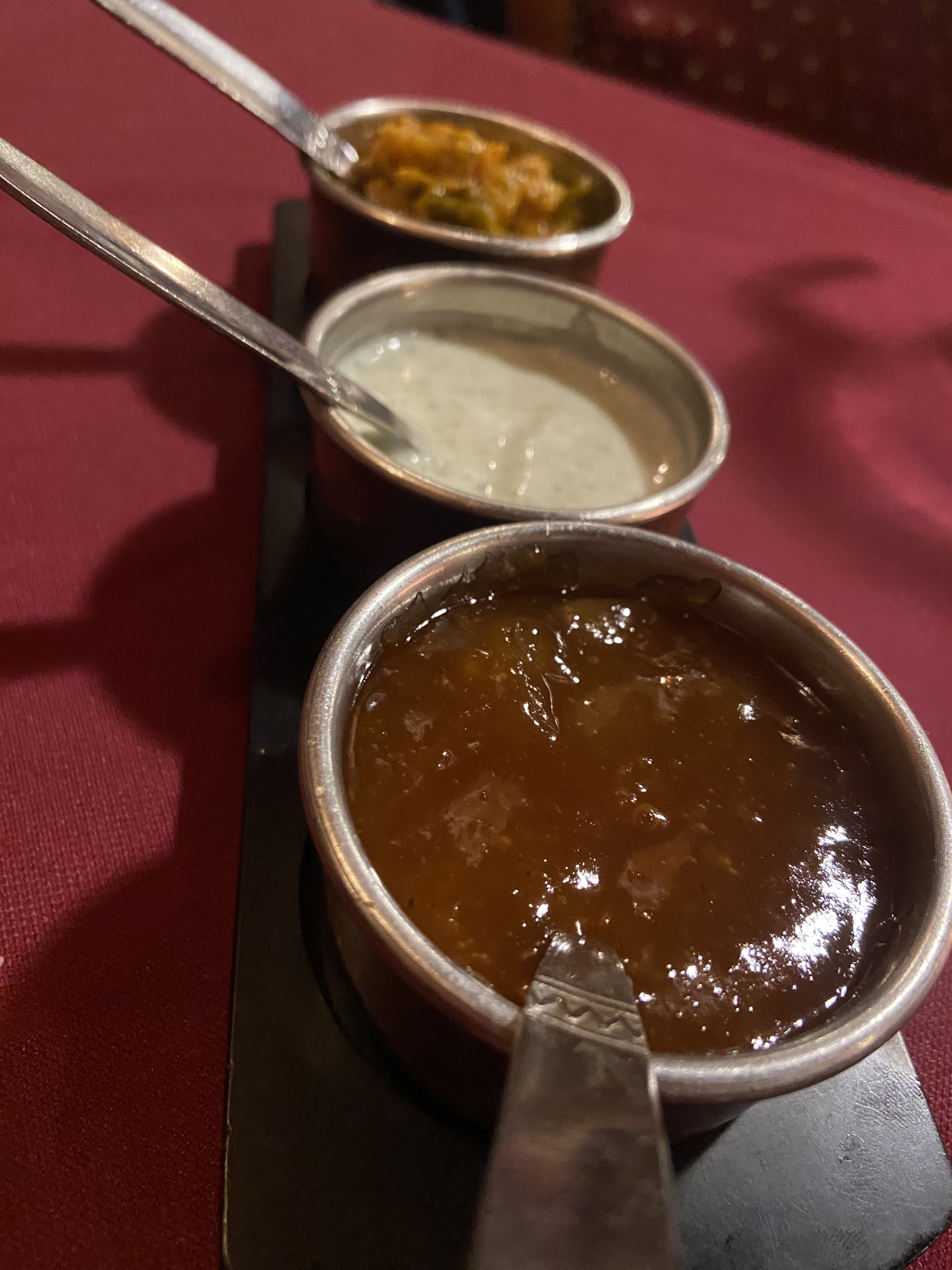 Excellent repas, grosses portions, mais malheureusement pas de nan à l'ail (mon préféré) et une perception étrange de ce qu'est un bhaji à l'oignon. Le poulet madras était cependant excellent... vraiment bon.