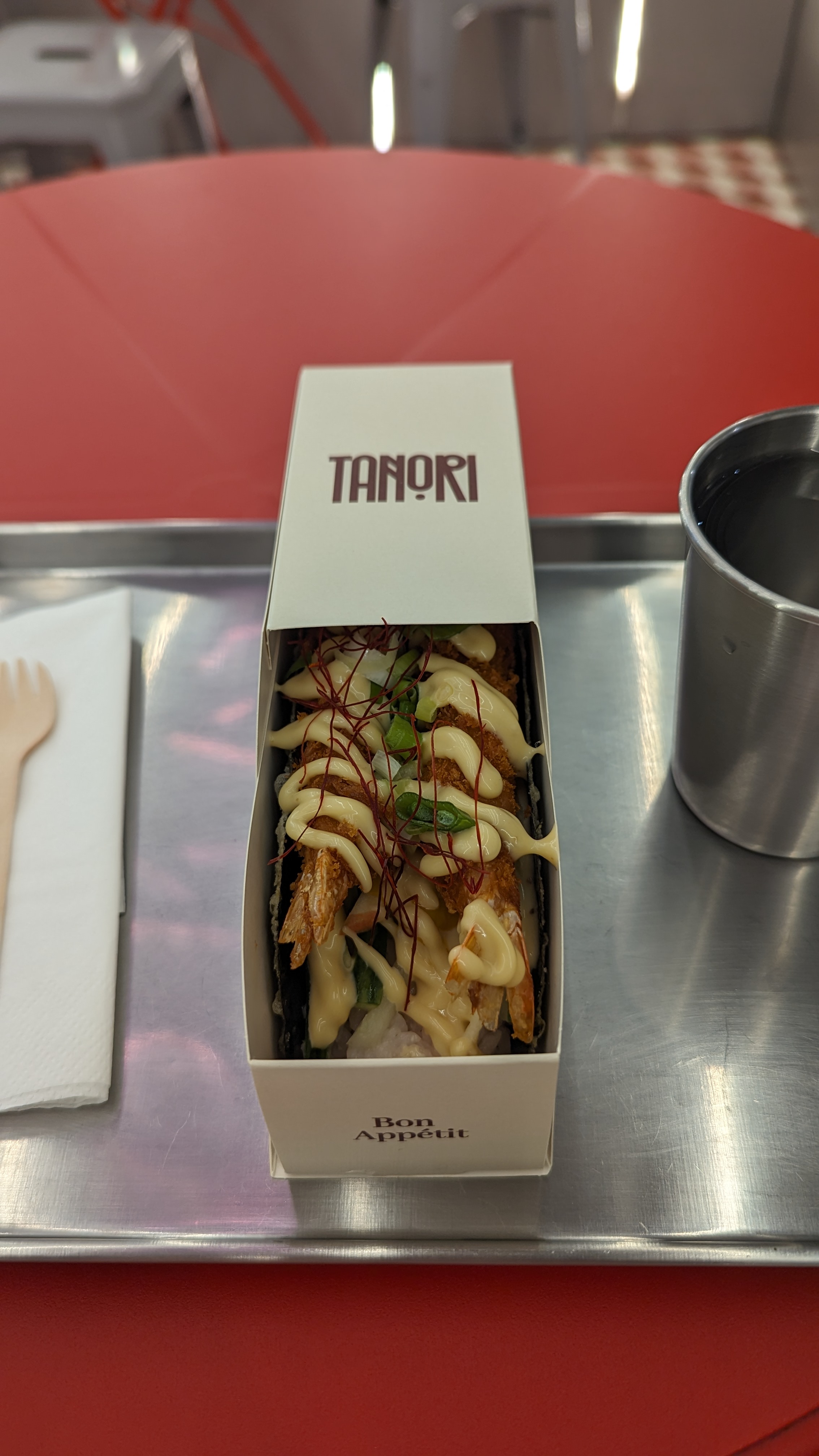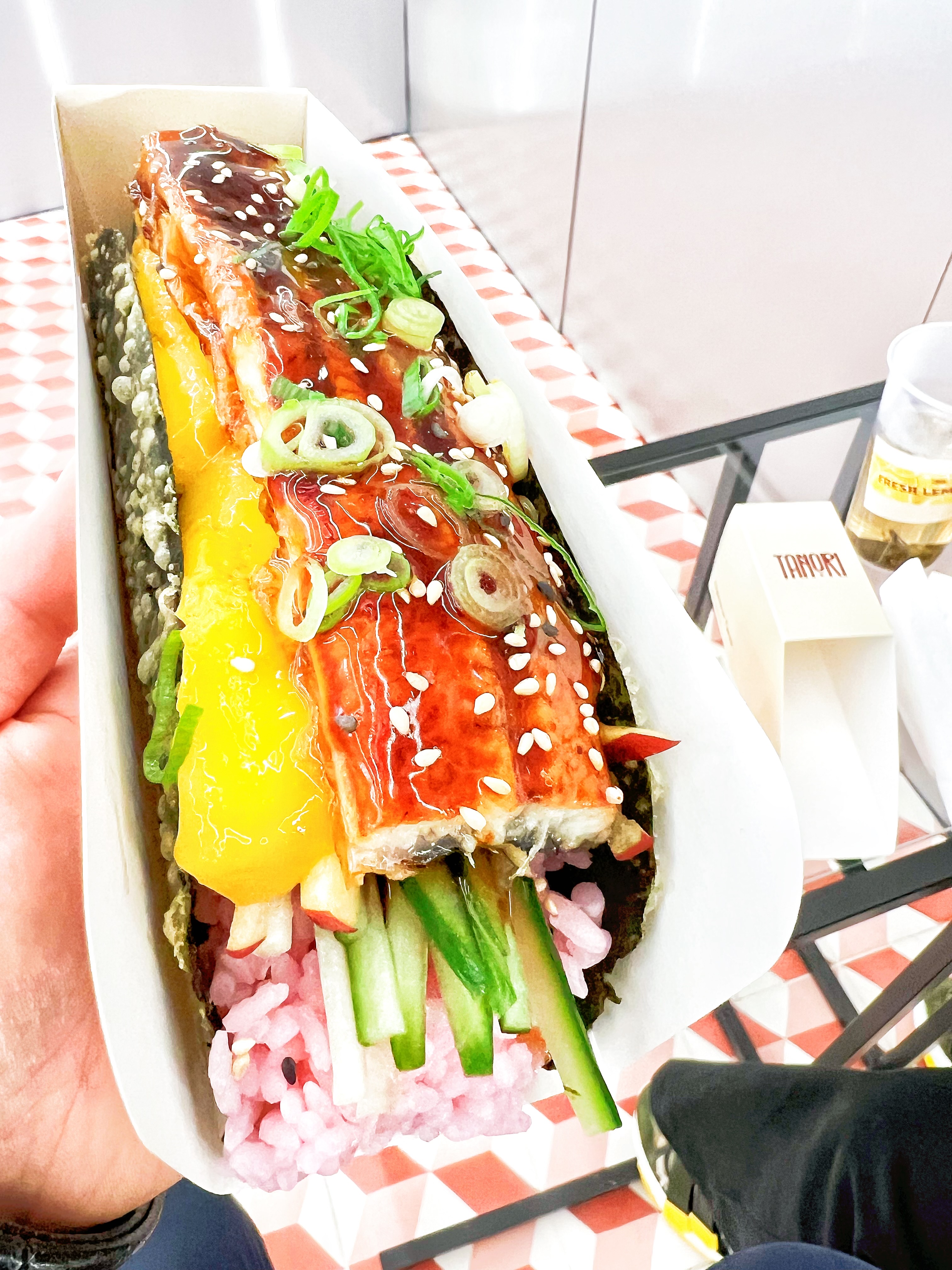 Super concept ! La fusion des goûts japonais et latino. J’ai beaucoup aimé le tacos unagi. Le goût original avec le mélange de l’anguille et de mangue 🥭 et pommes 🍏. Le morceau de poisson était copieux. C’est une bonne surprise. Le service était rapide, il n’y a pas beaucoup de places à la cantine. A mon avis, c’est plutôt à emporter.