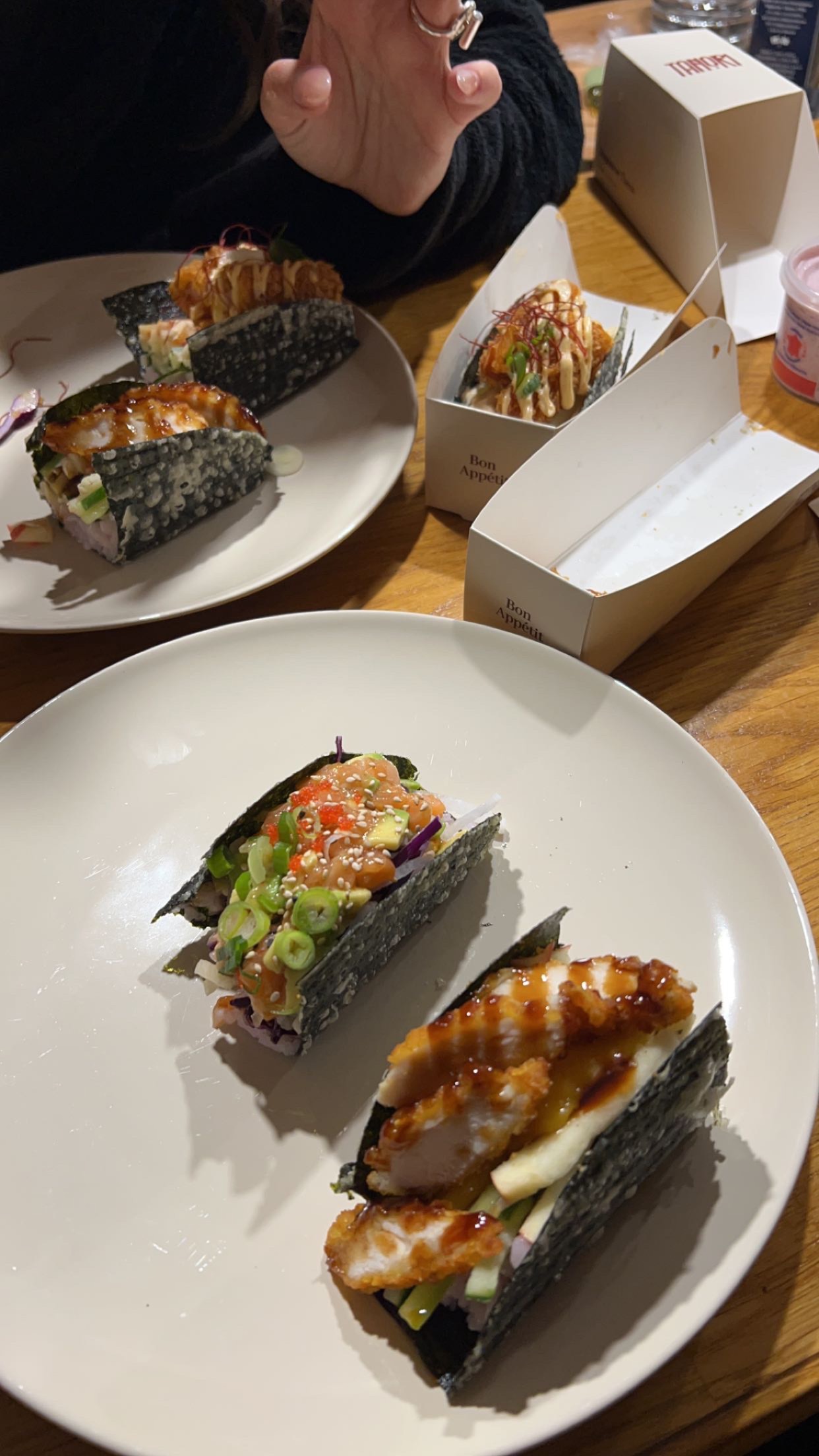 Je recommande Tacos Sake (saumon-avocat) et Tacos Unagi (anguille) mes préférés (celui à la crevettes aussi). Attention pour le sur place il n'y a que 3 tables.