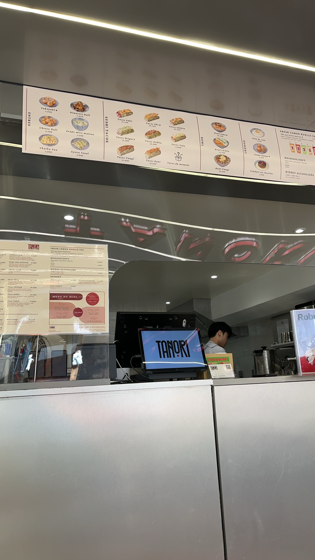 Très bonne expérience. Nous avons testé les sushi Ebi, poulet et Unagi. Le mélange des saveurs est parfait : ni trop salé ni trop sucré. Les takoyaki étaient bons. Le lemon tea passion excellent. Attention il n’y a que 6 places assises mais le resto est ouvert jusqu’à 22h donc ça laisse le temps de tester leur tacos