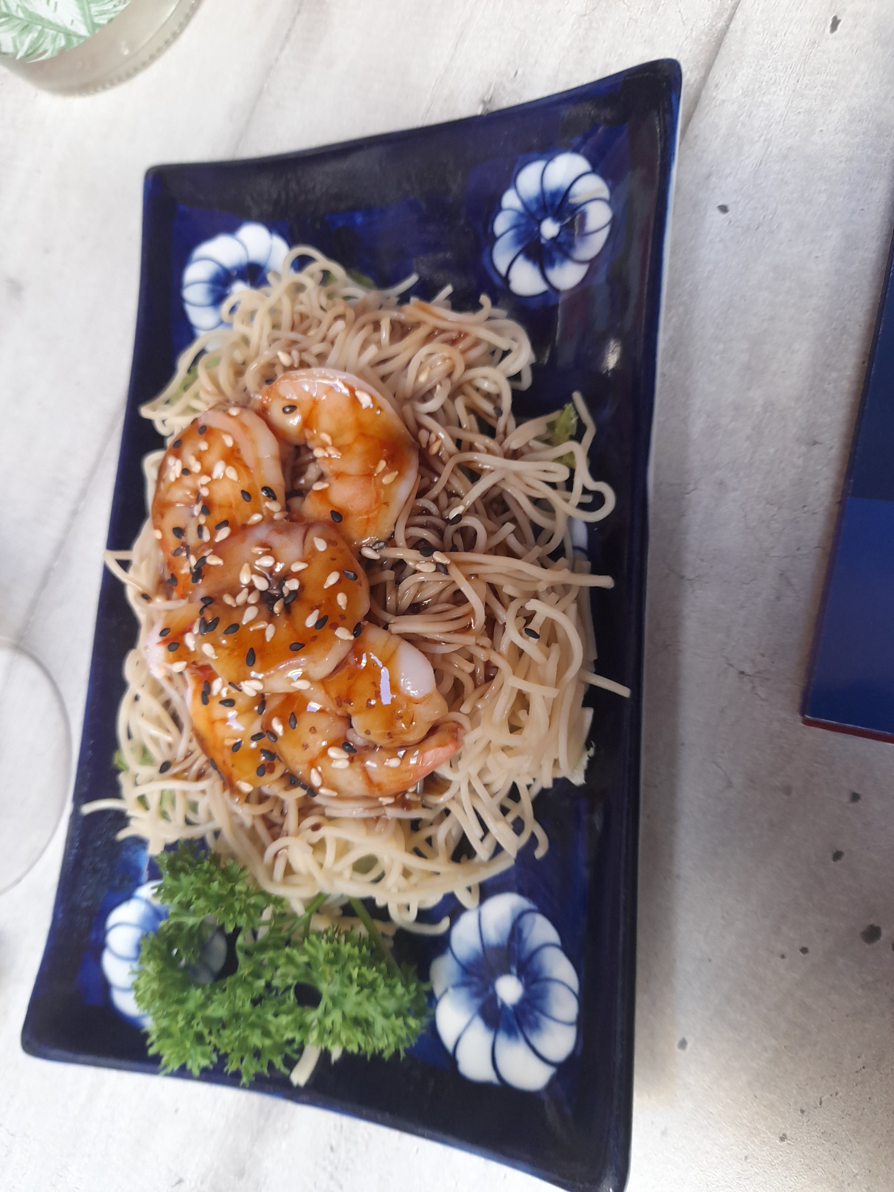 Une très agréable découverte pour moi Petite salade de nouilles aux crevettes et le plateau a la planchas, un délice