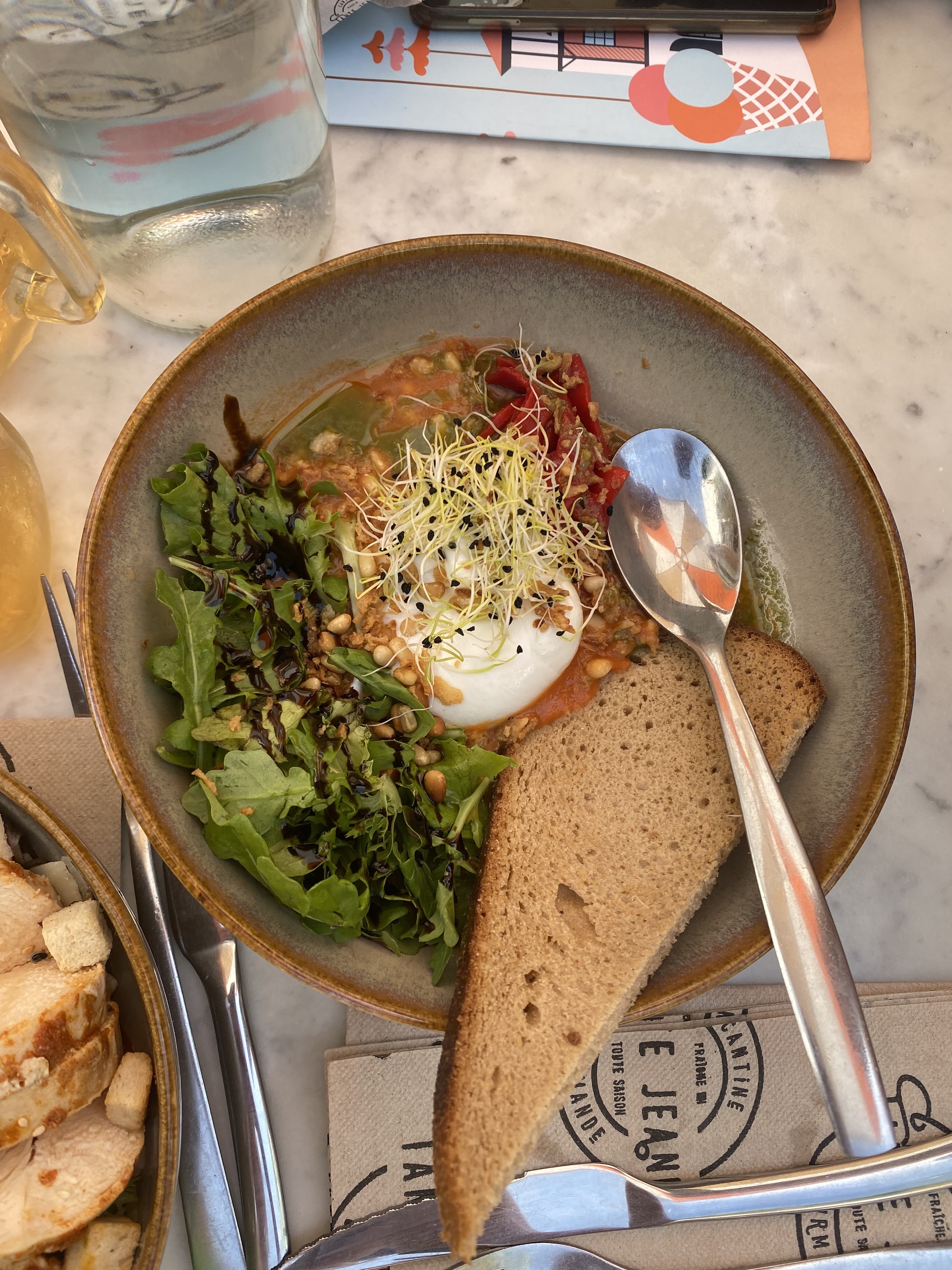 Oubliez que l’endroit attire la foule Oubliez que l’on ne peut réserver Profitez d’un petit déjeuner le matin au calme Pourlécher vous des glaces en fin de soirée Apprécier les plats simples et subtiles entièrement faits maison et à base de produits frais Et malgré le monde et parfois le temps d’attente Prenez tranquillement du temps dans un endroit cosy avec une équipe ultra sympathique Vivez le temps présent chez Jeanne Dernier point j’oubliais une très belle playlist d’ambiance avec juste ce qu’il faut de volume pour que sa présence soit agréable sans être envahissante