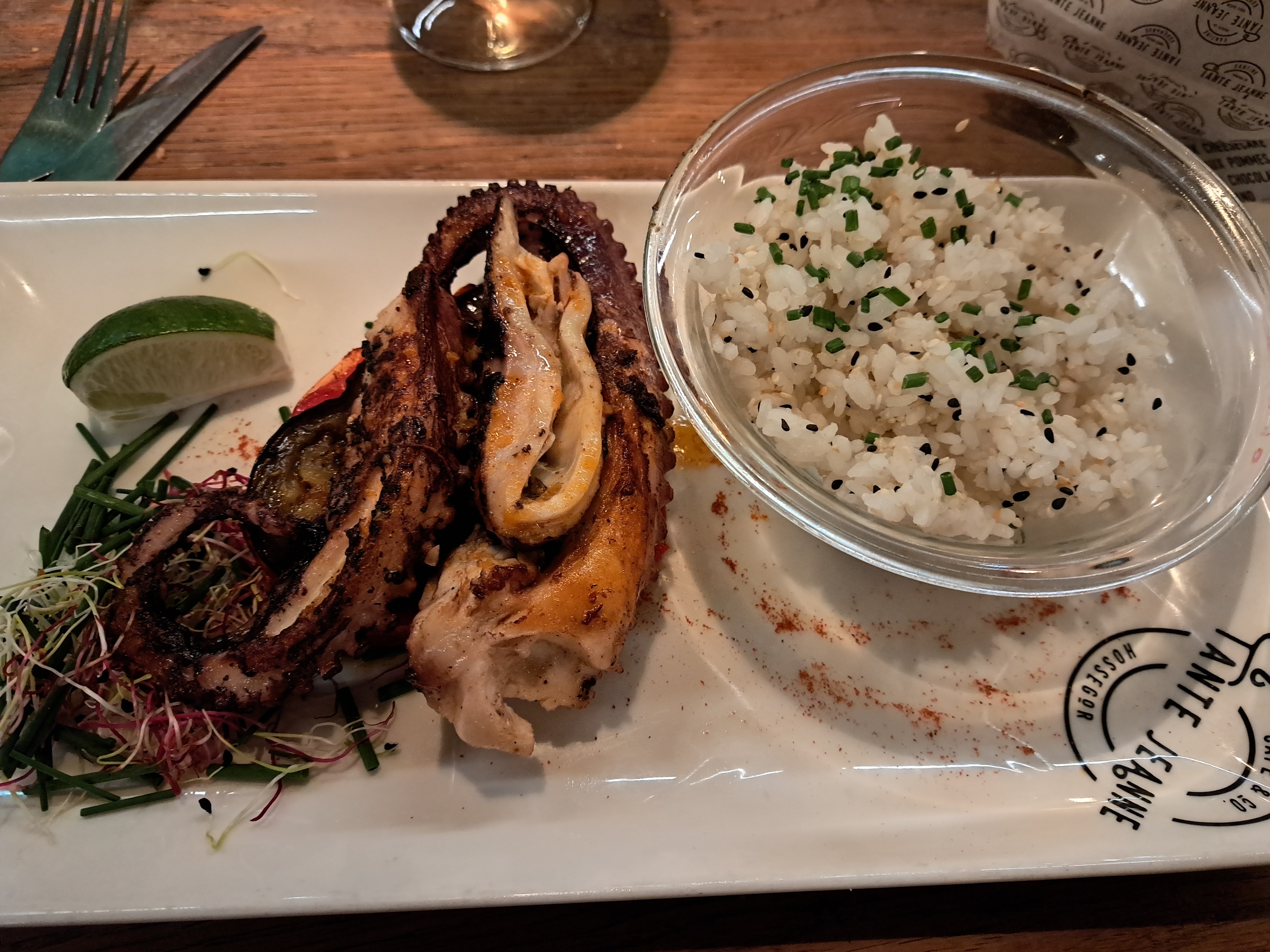 Au vu du nombre de passants croisés dans la rue et s'exclamant tu as vu c'est tante Jeanne ! Le lieu est bien connu localement. Arrivés à 12h05 un samedi midi mi-février, nous avons du attendre vingt minutes dans la longue queue déjà présente. Je n'ose imaginer l'été. La queue n'a cessé de s'allonger durant notre repas. Le restaurant possède une petite salle au rez-de-chaussée, une assez grande cour fermée et derrière et une autre salle à l'étage. Avec une nuée de serveurs filant dans tous les sens, le service est rapide et attentionné. Les plats sont relevés et les cuissons maîtrisées (mention spéciale pour la tendresse de mon plat de tentacules de seiche ?. Les prix ne sont pas bon marché mais restent tout de même raisonnables.
