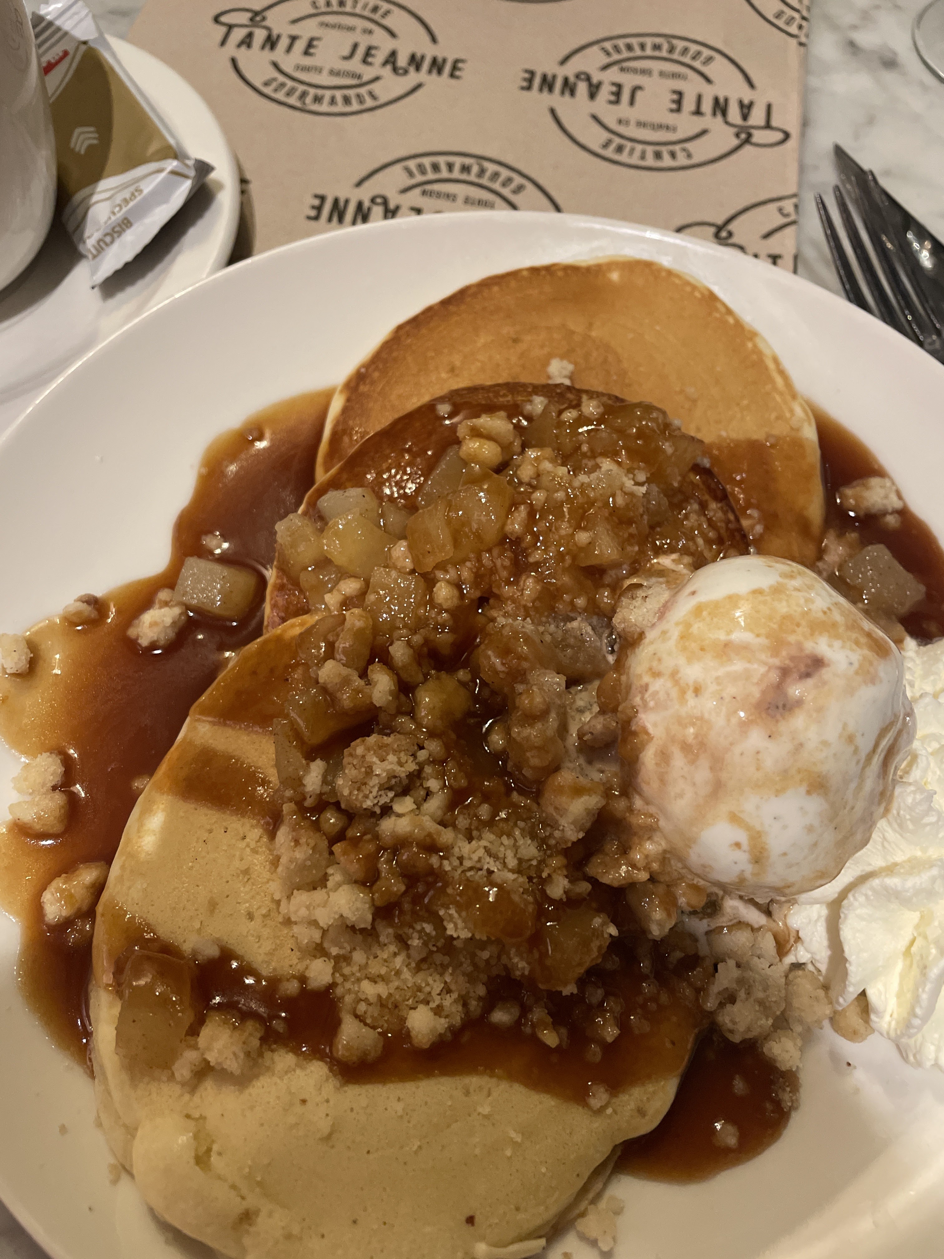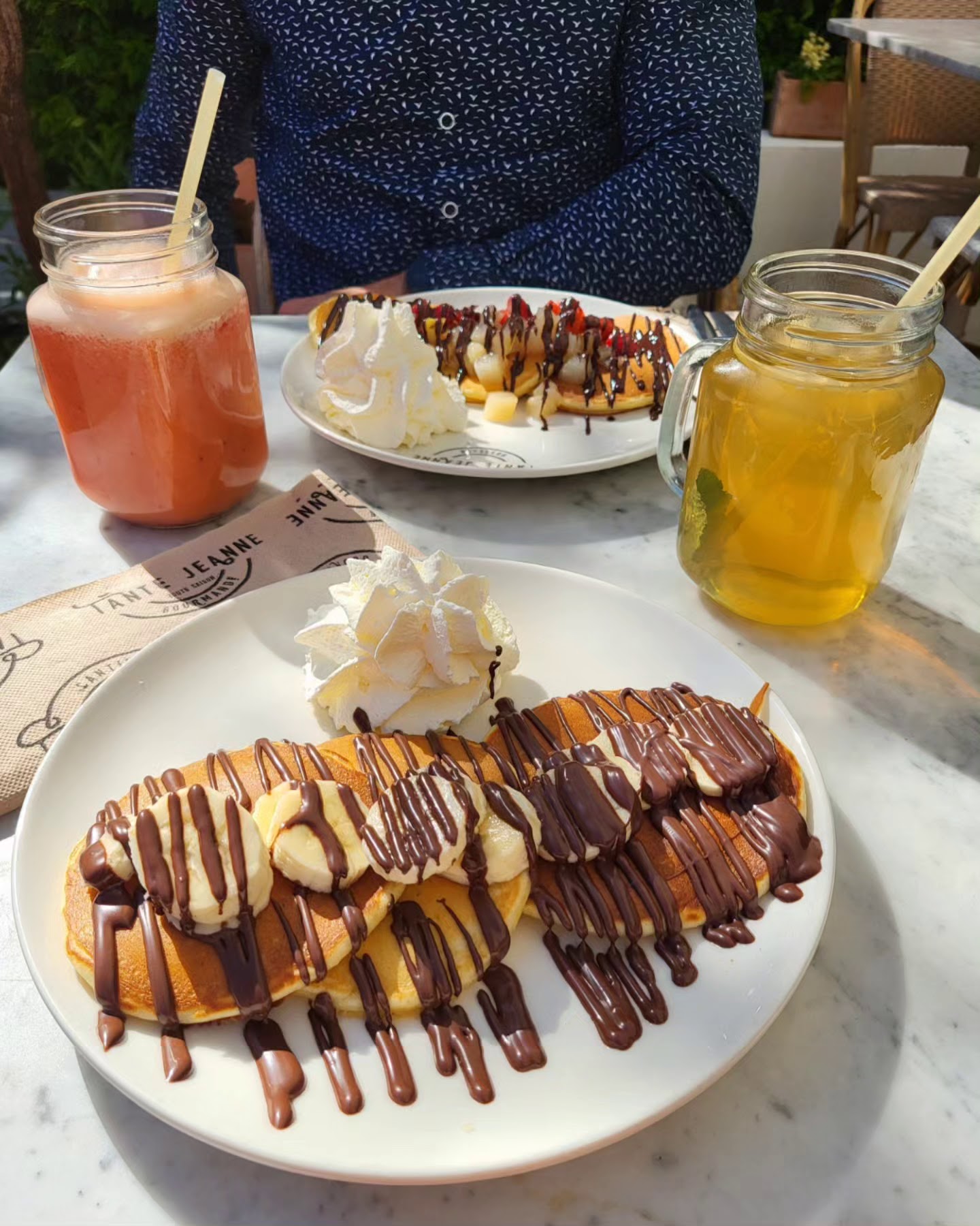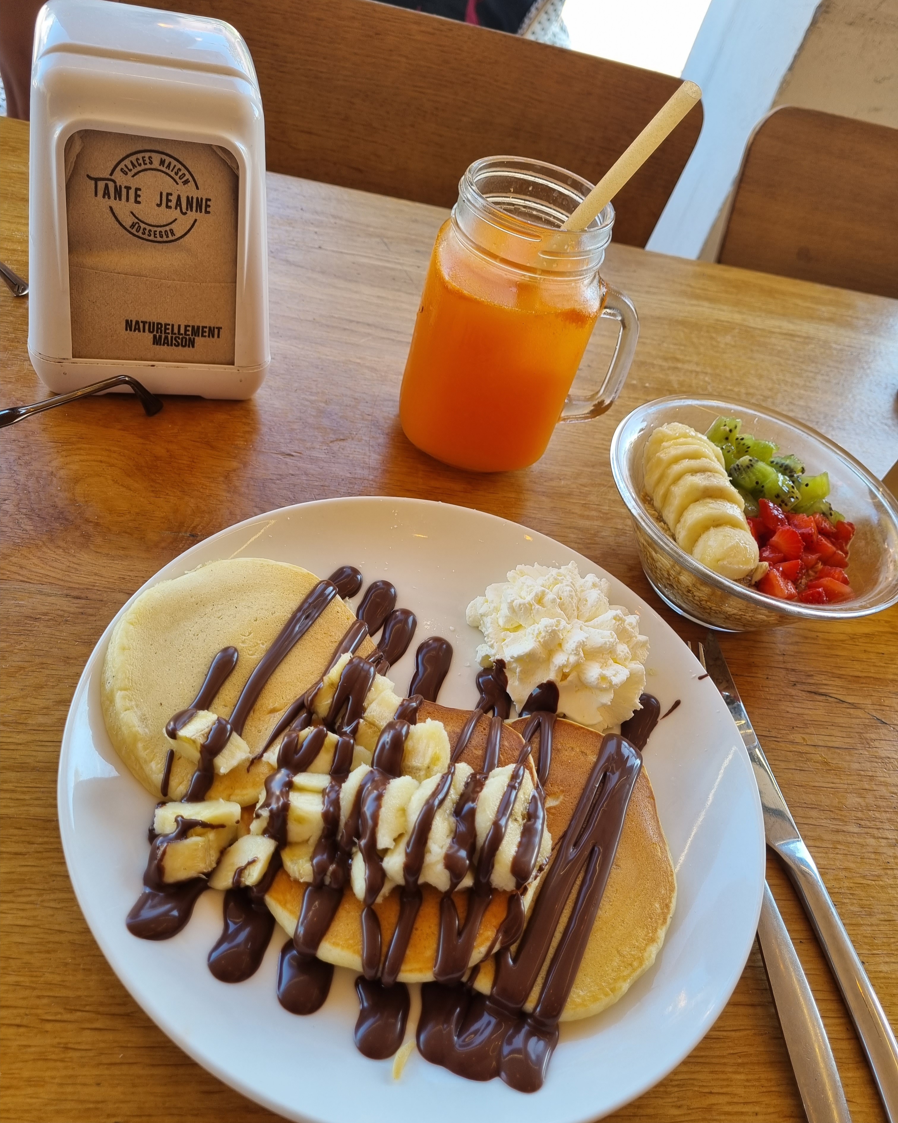 Des mois à parler d'aller tester Tante Jeanne, et quel régal ! Les jus de fruits sont excellents, j'avais peur d'avoir encore faim après ma tartine, mais il restait tout juste de la place pour les pancakes. Hâte de revenir et de goûter cette fois les glaces qui ont l'air tout aussi incroyables. La jeune fille qui s'est occupée de notre table était top !