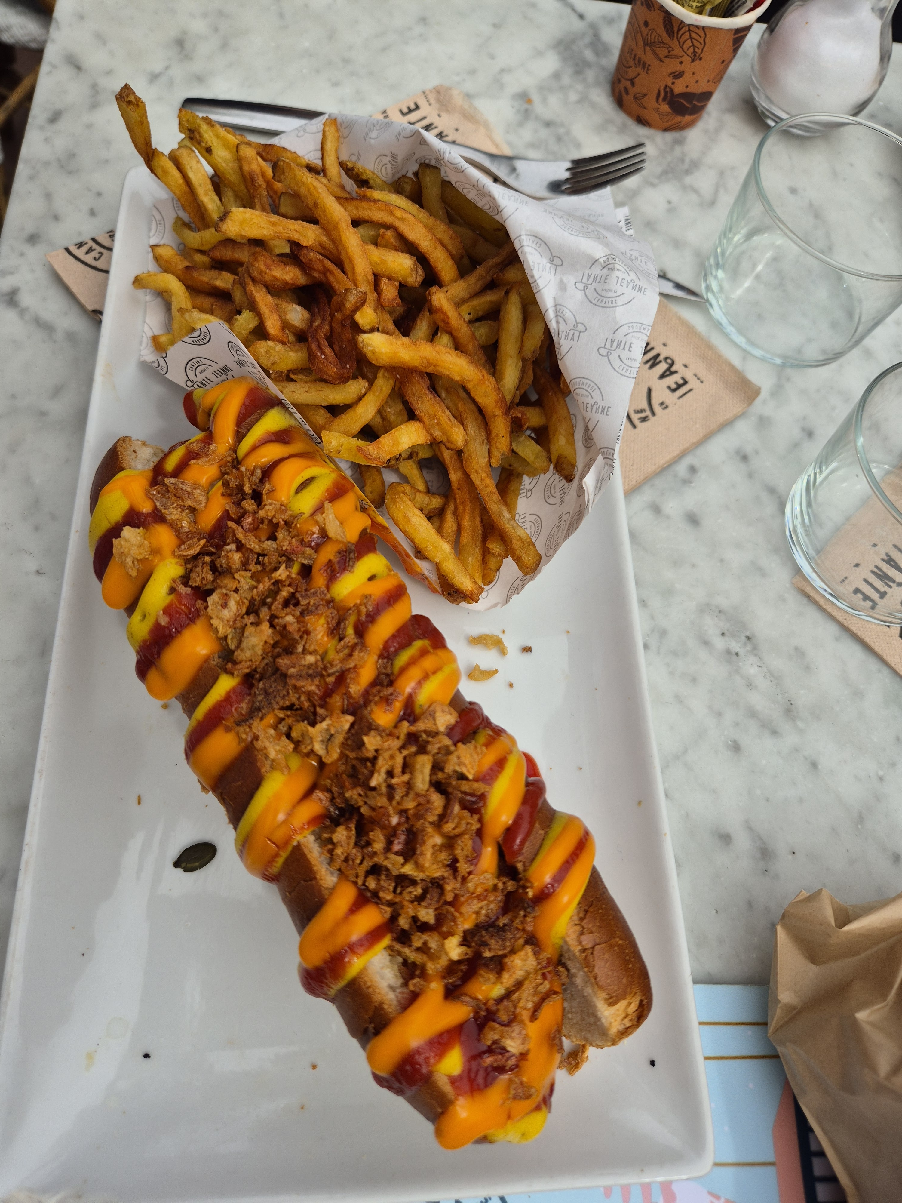 Repas correcte, le hot dog n'est vraiment pas pratique à manger, et la garniture était froide, même le fromage était sous forme de sauce, mais sinon plat assez bien fournis , manquait un peu de salade et mettre un peu moins de frite je pense à la place. C'est quand même relativement cher 15 euros pour un hot dog frite. Impossible de prendre des glaces au service à emporter, les serveuses déborder mais qui prennent même pas attention au faite que des gens attendaient quand même et nous sommes tous parties, et finalement nous avons eu nos glaces juste à côté dans un autre commerce.