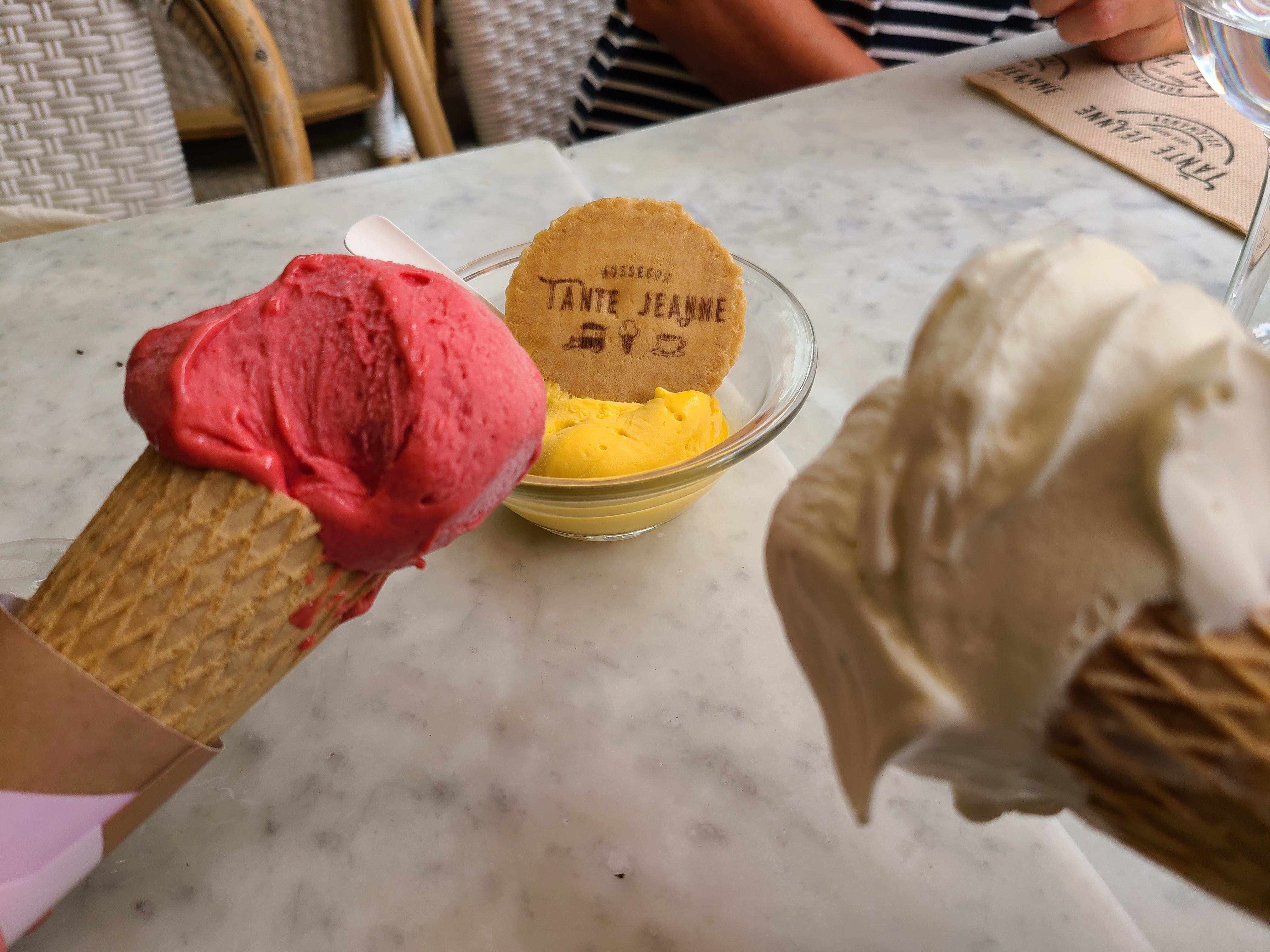 On nous a conseillé Tante Jeanne pour ses glaces, mais après quelques recherches sur le net j'ai vu que c'était aussi une bonne adresse pour les repas. Nous y sommes allés le midi. Ma fille très compliquée pour manger a dit que c'était le meilleur plat qu'elle ai mangé... Repus, nous n'aurions pas apprécié notre glace, on y est donc retourné à 16h : un régal. Le personnel est au Top 👌