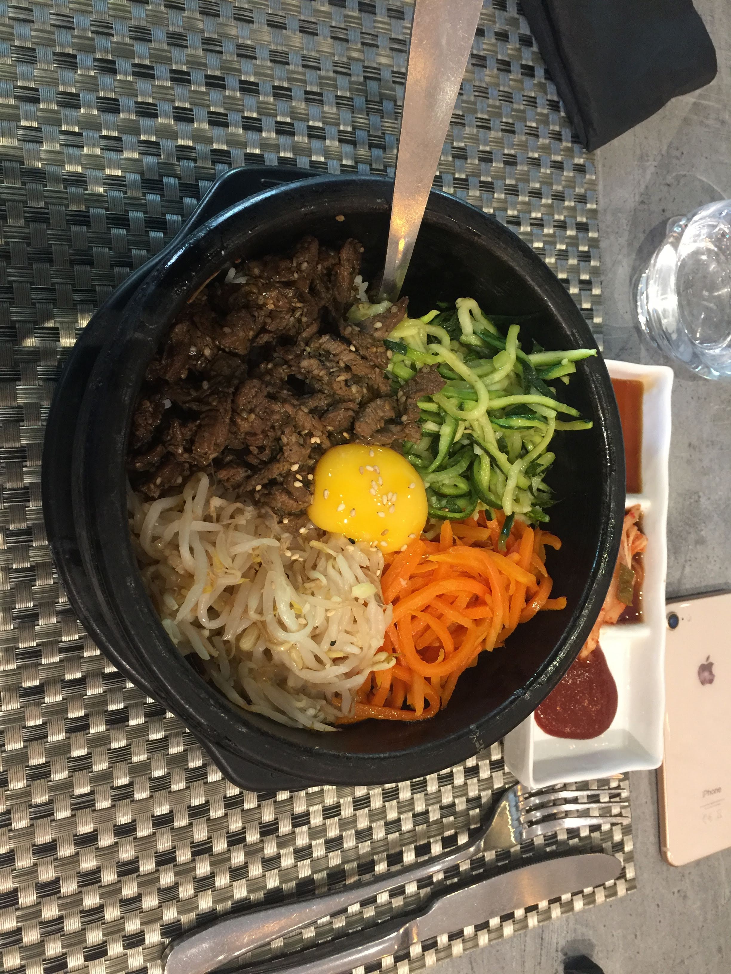 La nourriture est correcte, mais chaque plat était un peu décalé d'une manière ou d'une autre. Les ramen étaient bons, mais les bouillons ne semblaient pas correspondre complètement aux images et les nouilles n'étaient pas aussi moelleuses que nous le souhaitons. Le pad Thai contenait le trio pad Thai caractéristique à la saveur piquante, et il manquait au bimbibap le riz croustillant au fond du bol en pierre. C'est une nourriture correcte, mais cela ne vaut pas la peine d'y revenir.