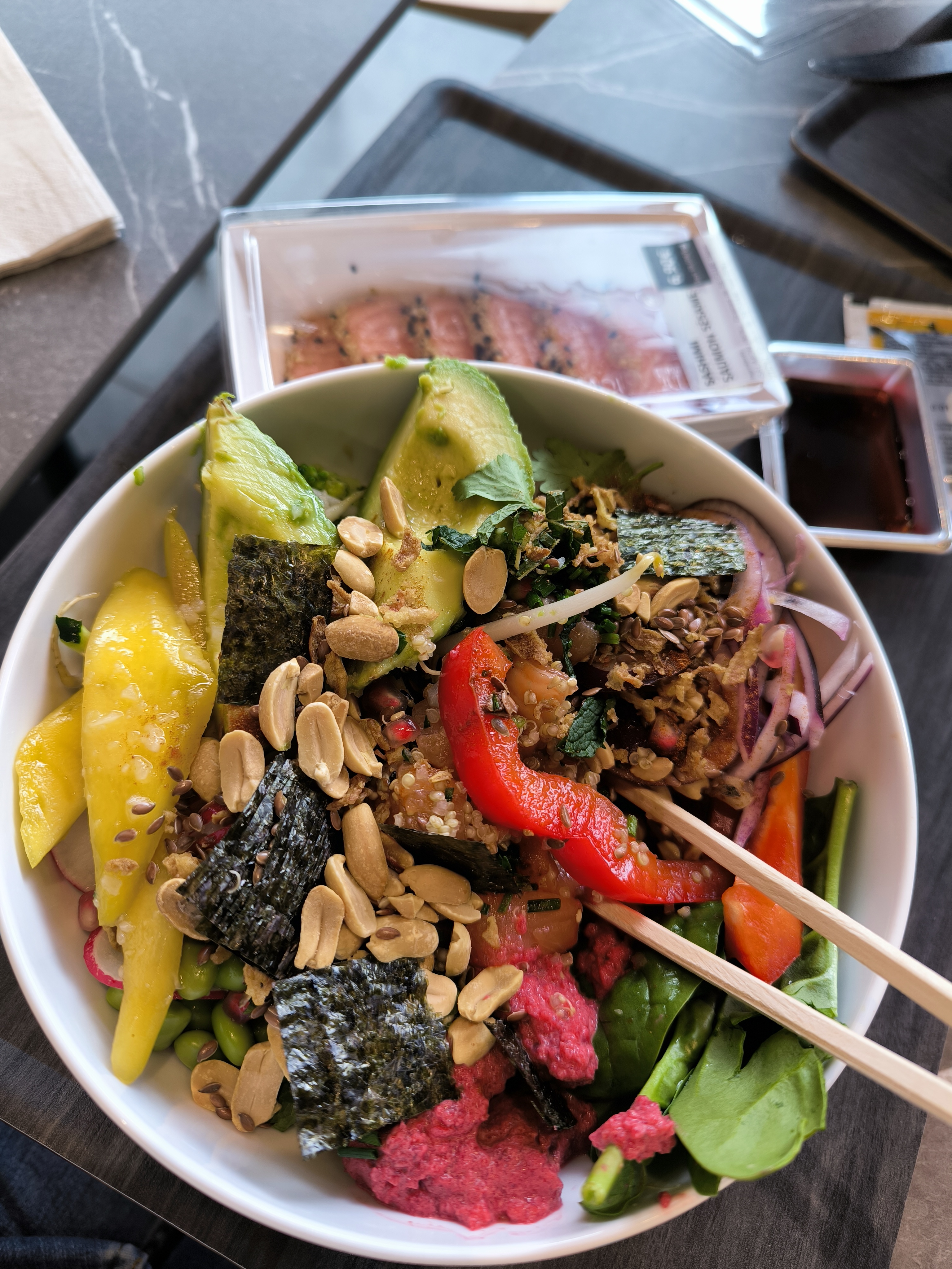 J'ai pris un poke bowl saumon à emporter, très bon, rien à redire. Service rapide Si je peut juste me permettre une réflexion dommage que l'avocat ne soit pas coupé