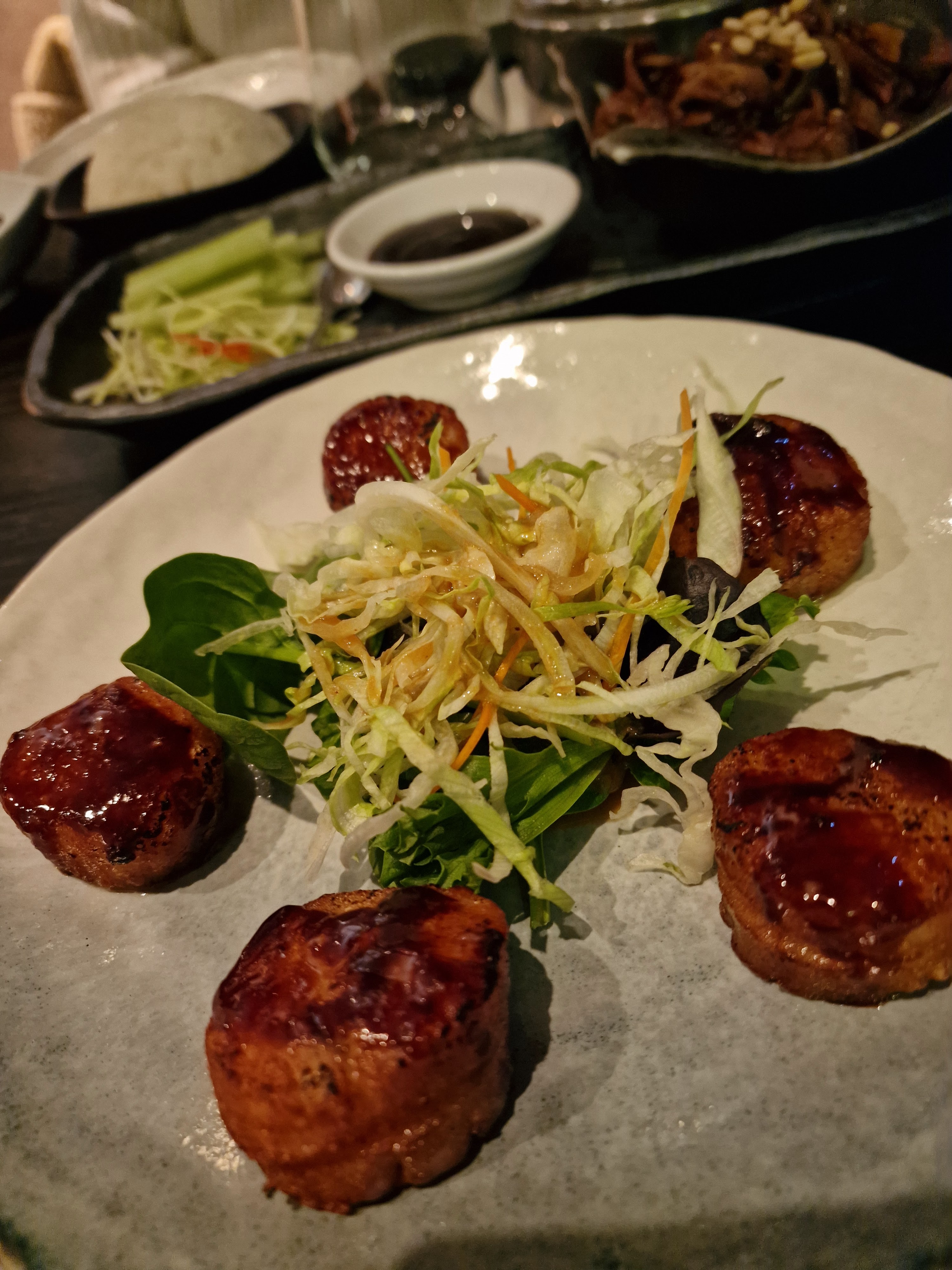 Restaurant dont on sait immédiatement qu'une bonne partie de l'addition est faite pour payer plus le décor que l'assiette. Non pas que celle-soit mauvaise mais elle n'est au niveau de la prétention du lieu. Les entrées sont bien sûr plus travaillées que chez votre traiteur chinois du coin de la rue. Vous n'y retrouverez pas ce coté légèrement élastique pour les vapeurs et plus collant que croustillant pour les nems frits. Mais le goût n'a rien de transcendant. Les Saint-Jacques laquées au miso sont bien cuites mais de moindre qualité. Elles ont ce goût vraiment désagréable (à mon avis) très particulier très facilement reconnaissable quand on est habitué à la pecten maximus française. De plus, la salade en décoration n'était pas de première fraicheur, photo à l'appui. Les raviolis vietnamiens sont très bons. Les riz ne sont absolument pas salés. Un oubli ? Beignets banane caramel classiques, banals. Pour une addition de 138 euros pour 2, on pourrait s'attendre à une qualité de produits et des goûts plus travaillés. Textes blog La Table d’Ogre