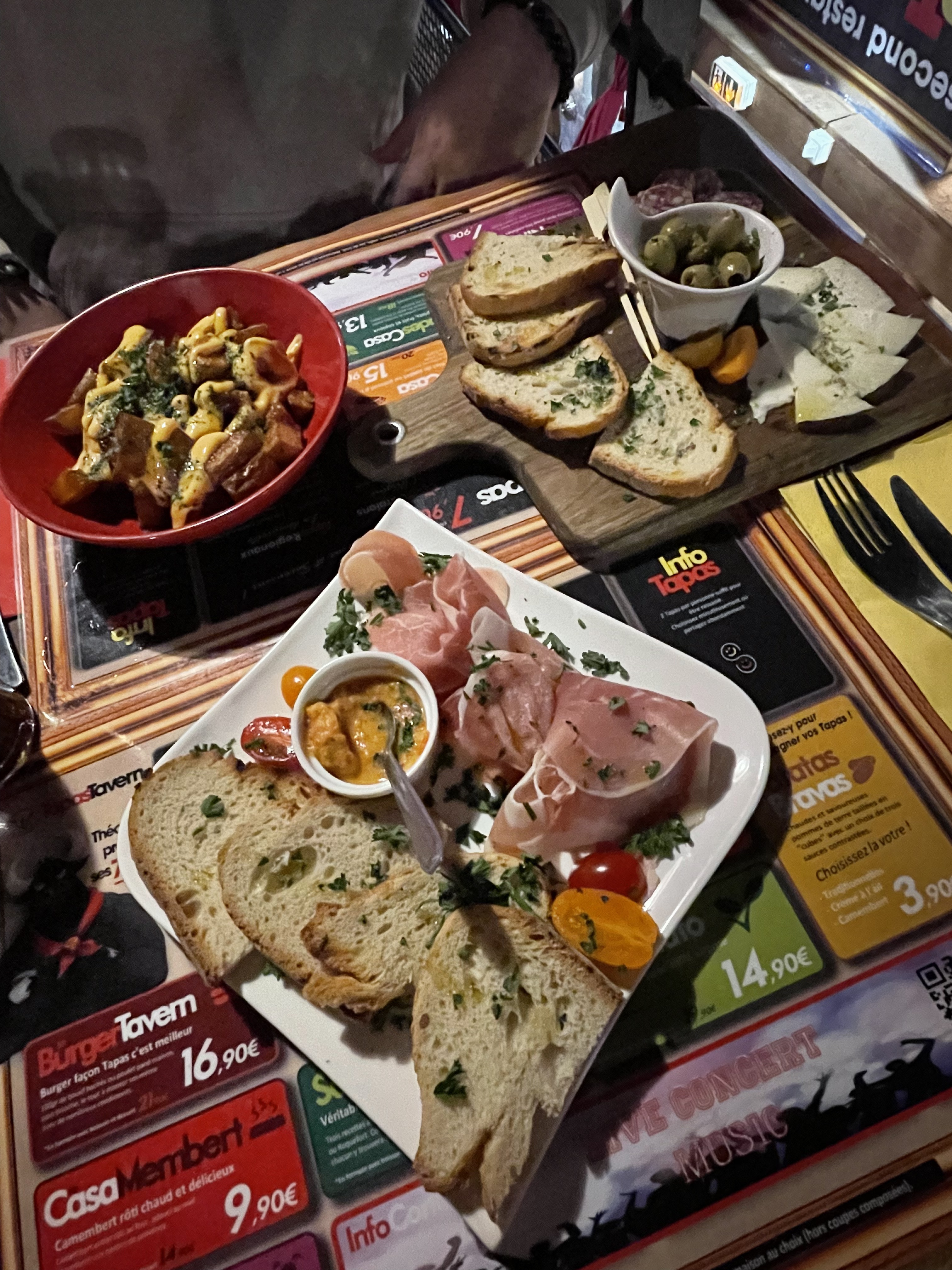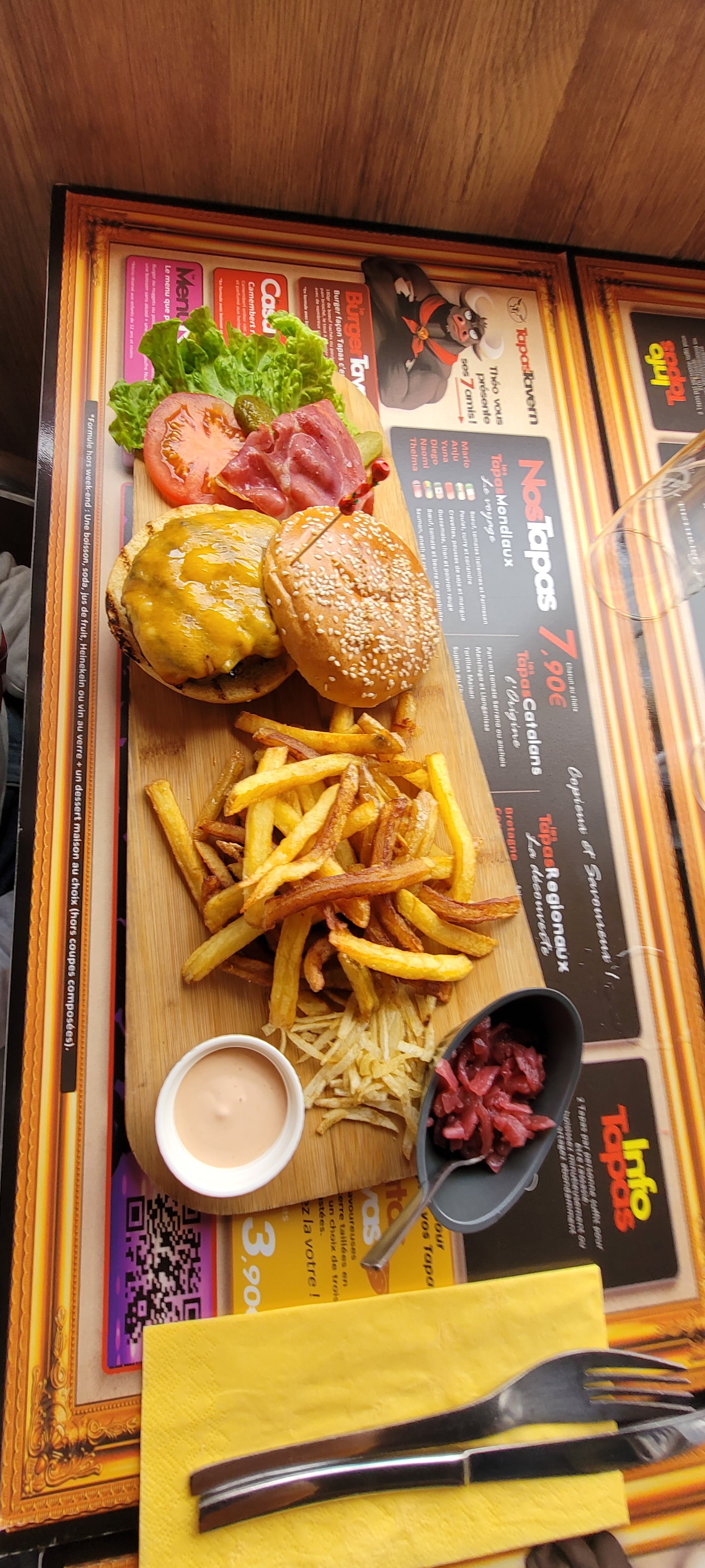 Pas de carte de menu. Il faut aller voir au fond de la salle sur la pancarte. De plus désorganisation complète lors de notre passage et serveuse désagréable. On ne se rappelle pas de notre réservation on nous impose une table dedans alors qu'il y a un concert organisé à l'extérieur. Des Tables sont disponibles dehors mais soir disant réservées. Bref , Nous avons quitté le restaurant et mangé en face à la crêperie. Nous avons bien mangé et avons été bien reçu. Lorsque nous repartons tard les tables du Tapas tavern soit disant réservées sont toujours vides... 🤔😓