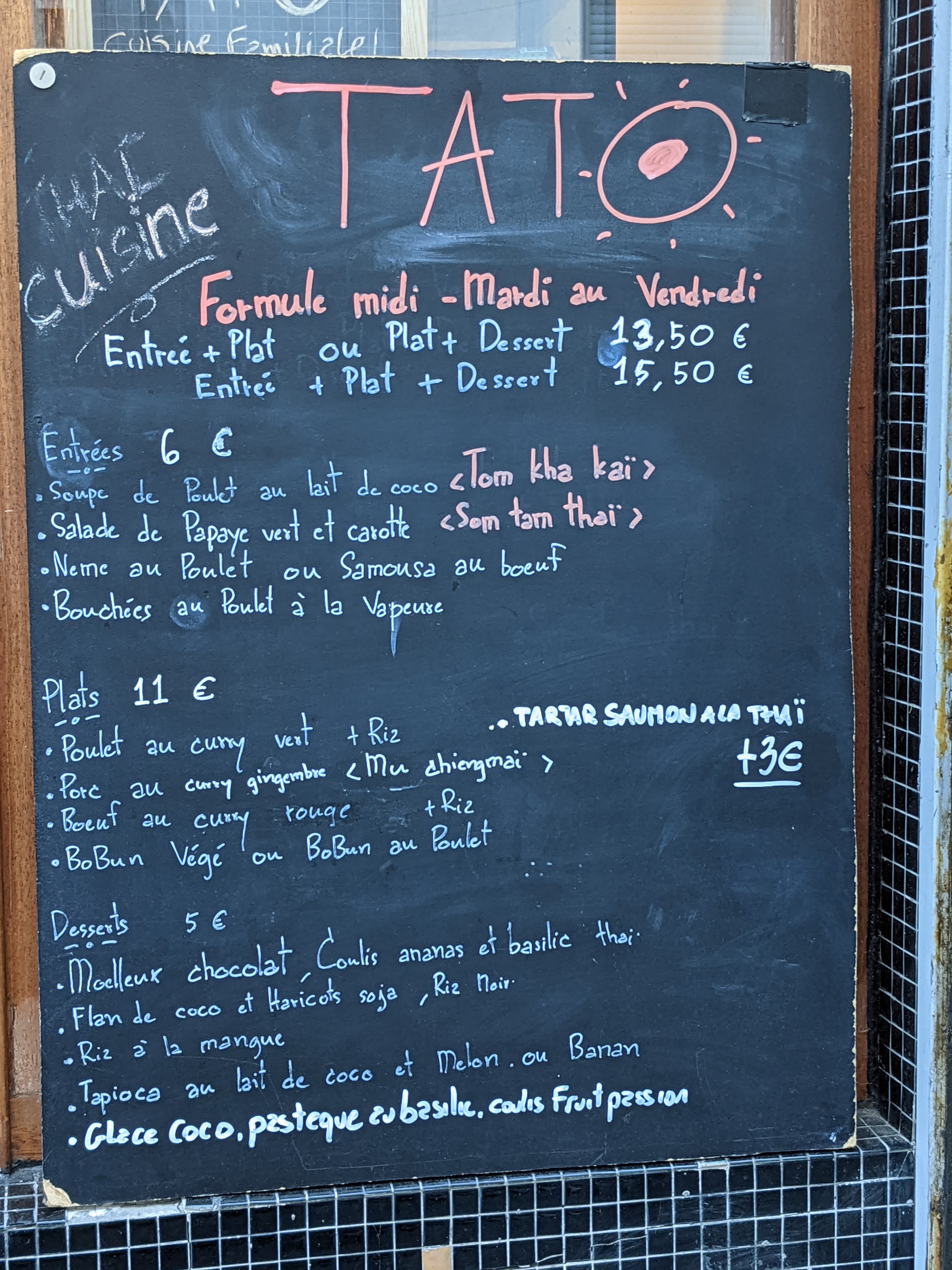Petit resto avec terrasse. Un mélange subtil de cuisine thaï avec des vins (Toscane et une superbe découverte d'un blanc des Pyrénées/64). L'addition est un peu monté après dégustation au verre : 1, 2, 3. ! 😜Le genre de lieu recherché et si rare lors de nos passages à Paris. Désormais un lieu de passage obligé pour nous.