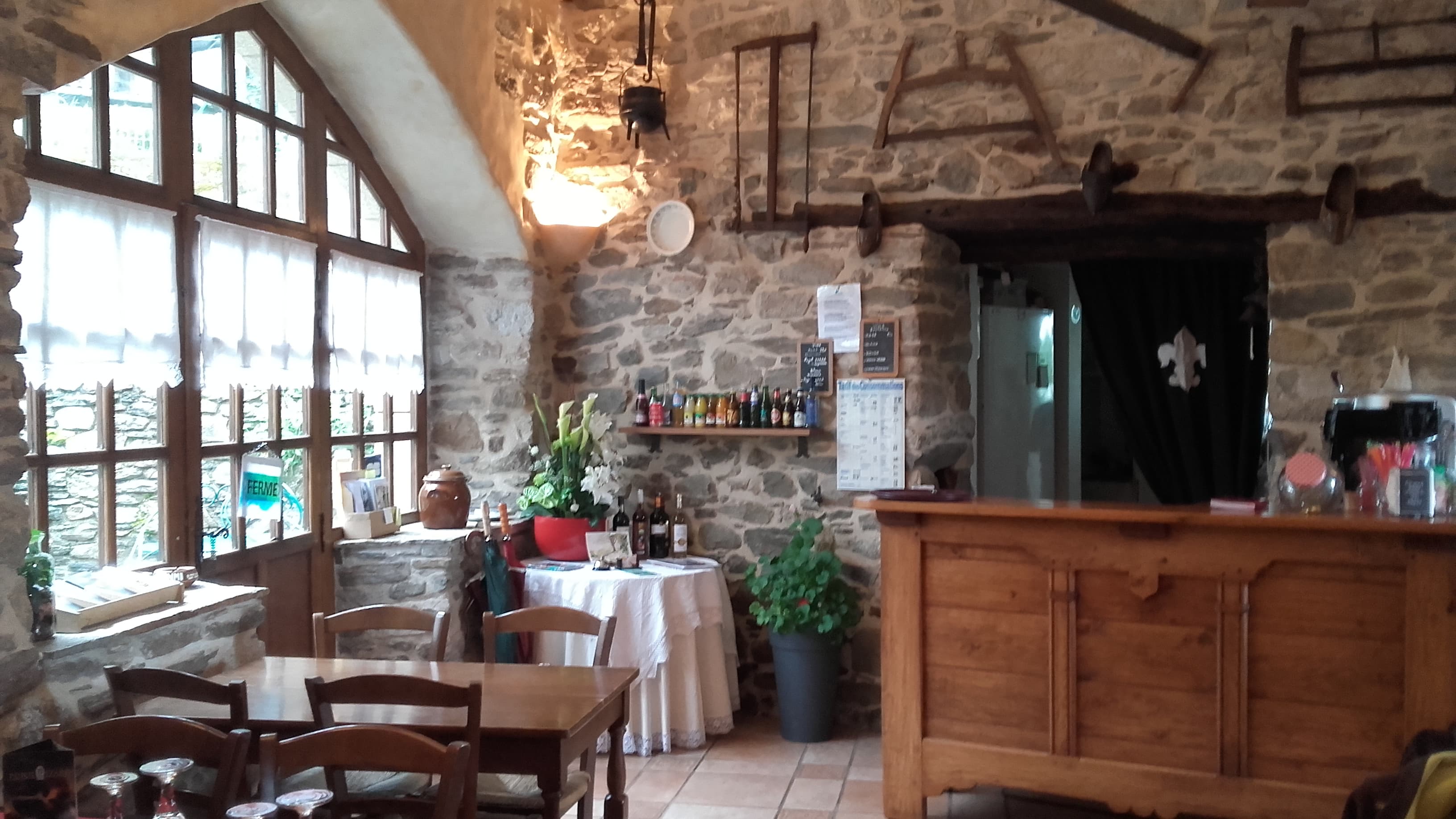 Bon accueil ! On se retrouve dans un lieu empreint d histoire, vieilles pierres apparentes et boiseries, tables rangées façon taverne de l époque. Et surtout une terrasse couverte avec une vue époustouflante sur la passerelle et la vallée !