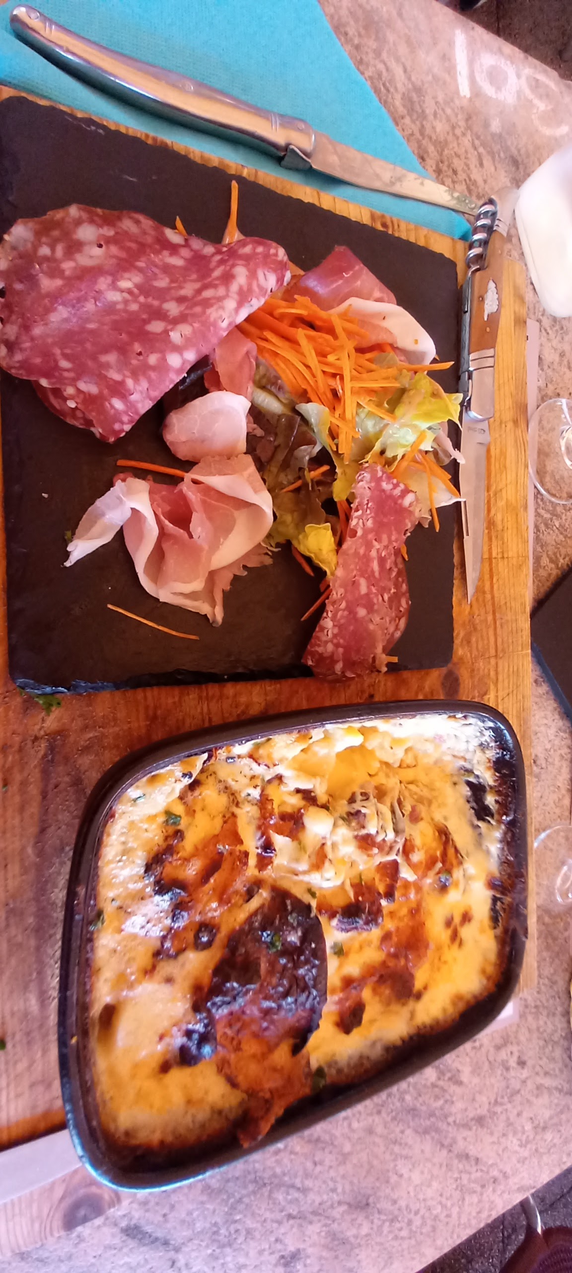 Pas le temps de faire l'apéro que les entrées et les plats sont envoyés en même temps. L'apéro + les entrées de mes invités et mon plat principal ont été envoyé en MÊME TEMPS !! En plus la qualité de la tartiflette est à revoir ... pas bonne du tout. Bourrative et peu de goût.. avec énormément de mozarella (pas précisé dans la carte de cet ingrédient) étant donné la texture élastique apparemment due au gratinage, peu de goût du reblochon voir pas du tout, les patates doivent être vendus en sachets plastiques vue la qualité de la patate... je ne recommande pas du tout ce plat.. et ni ce restaurant d'ailleurs. Cher pour ce qu'ils proposent ...