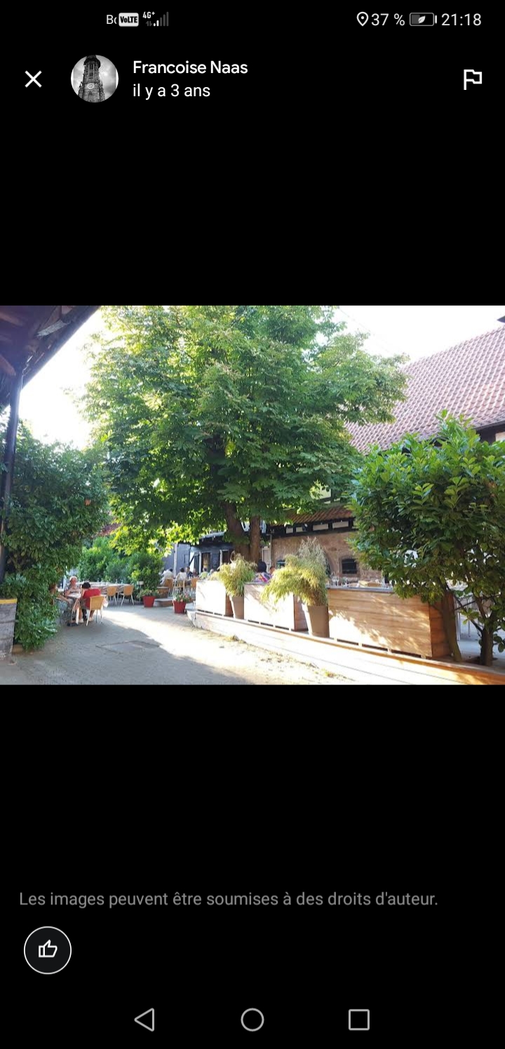 Magnifique cadre. Nous étions plusieurs amis et avons mangé en terrasse dans la cour où trône un magnifique marronnier. Bière meteor en pression. Tartes flambées délicieuses. Attente correcte et personnel à l'écoute. Les tarifs ne sont pas rédhibitoires compte tenu de la qualité de la tarte flambée servie dans ce restaurant.