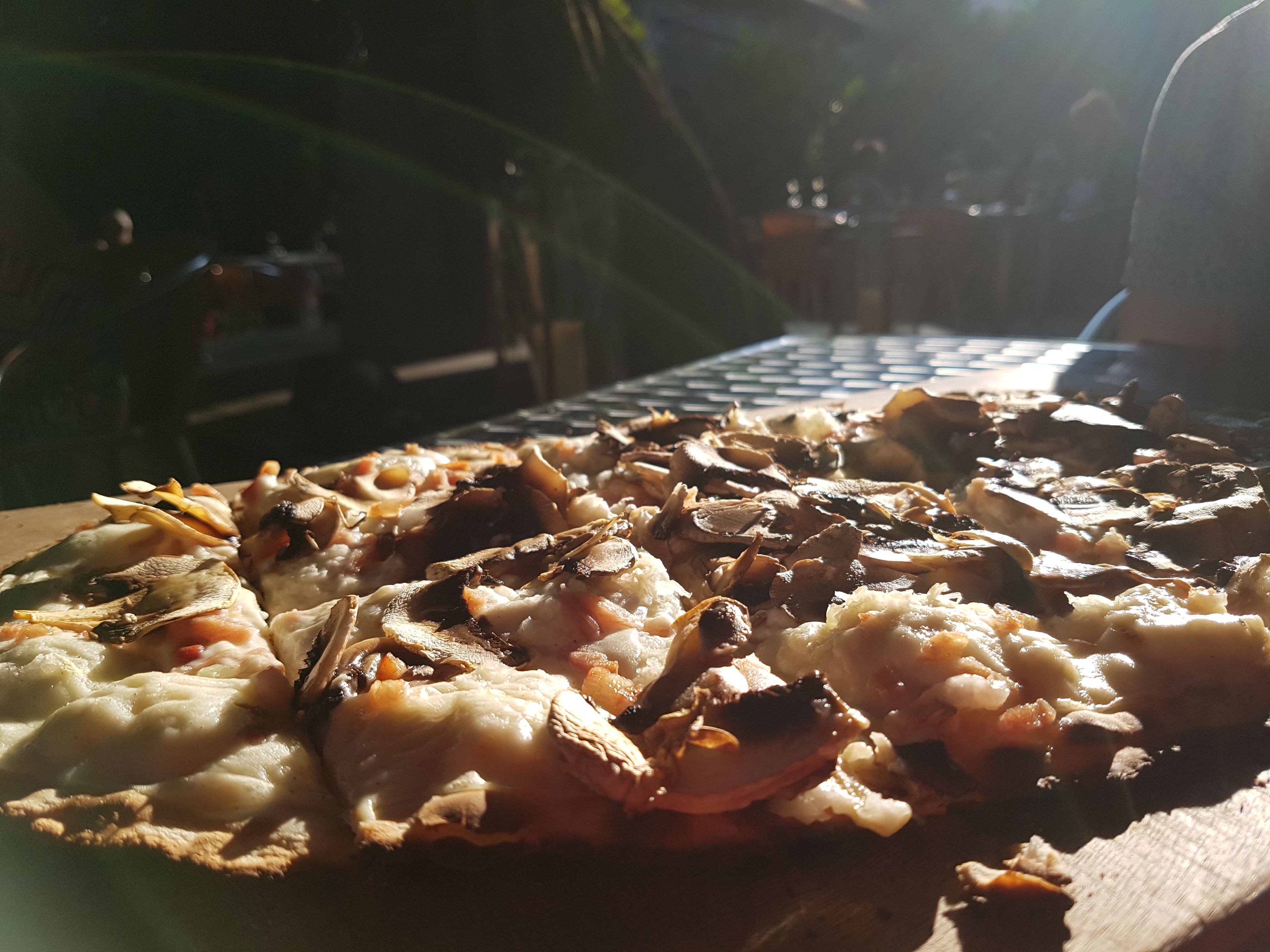 Tarte flambée délicieuse avec quelques variantes champignons, ail, grattons. Pâte bien cuite et croustillante.