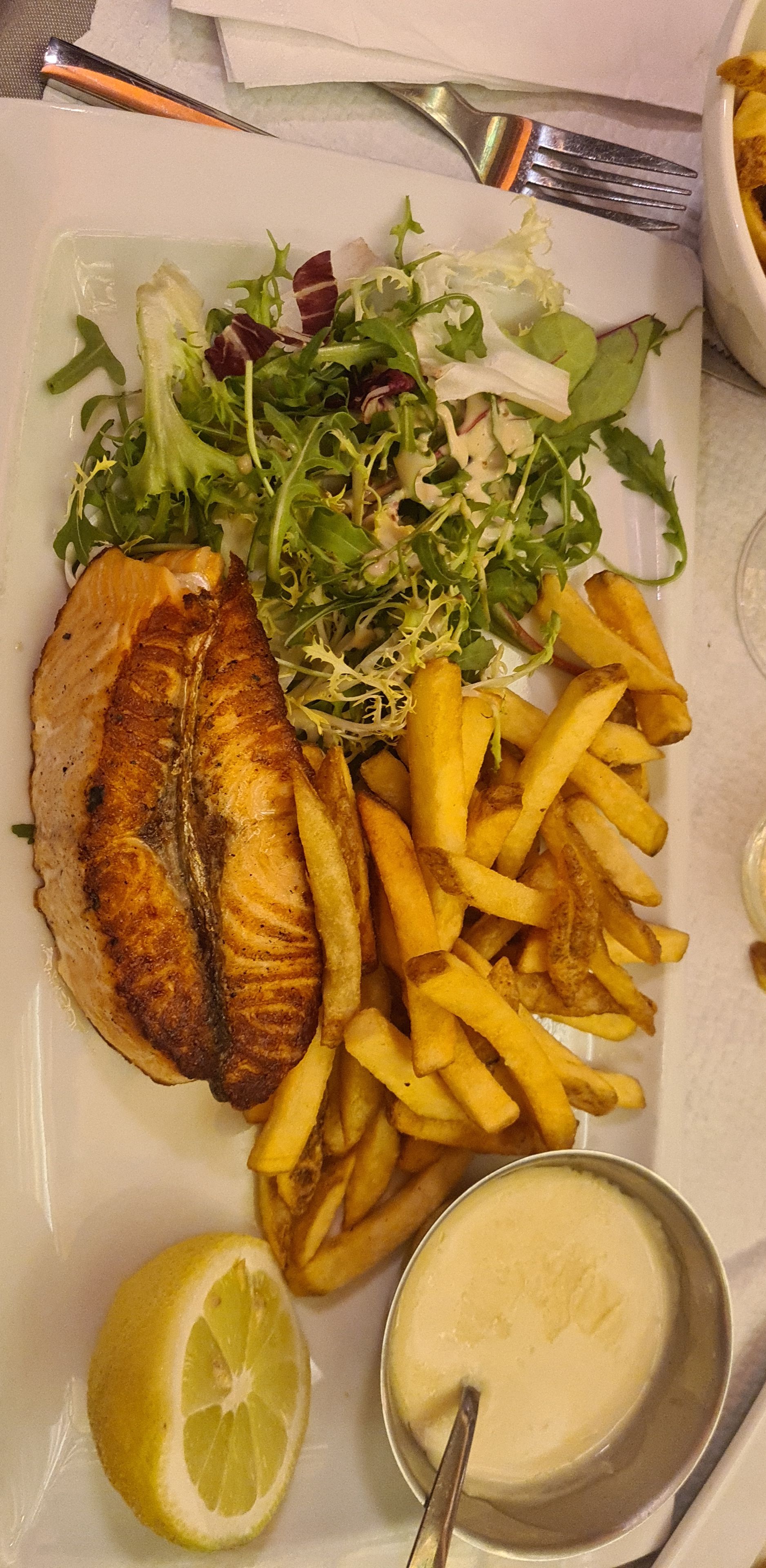 Filet de bœuf était bon, les frites c’était limite. La salade taverne à 14€, on s’attendait à quelque chose de mieux et ils avaient oublié l’œuf. Sinon le personnel était sympathique et avenant sauf un jeune serveur qui faisait mal à la tête à parler fort. « Dire bonjour c’est la moindre des politesses » a-t-il dit à un client étranger… Parler fort n’aide pas à se faire comprendre par contre prendre des cours d’anglais si !