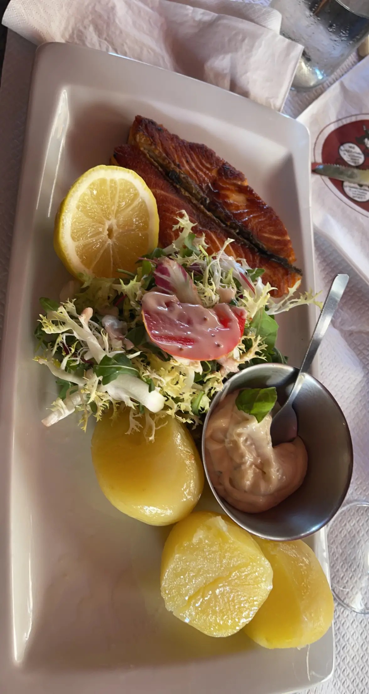 Restaurant avec des produits pas frais, commandé en août 2021 durant mes vacances, j'ai pris un saumon grillé avec sa garniture. Le saumon était fade et franchement pas grillé. Servis avec des pommes de terre à l'eau et une sauce ciboulette à la mayonnaise.. Le tout pour 22 euros... Résultat: Dîner à 22h environ, réveil en pleine nuit à 01h du matin avec vomissement accompagnés de diarrhée... Restaurant très décevant qui a gâché une partie de mes vacances. C'est un piège à attrape touriste!