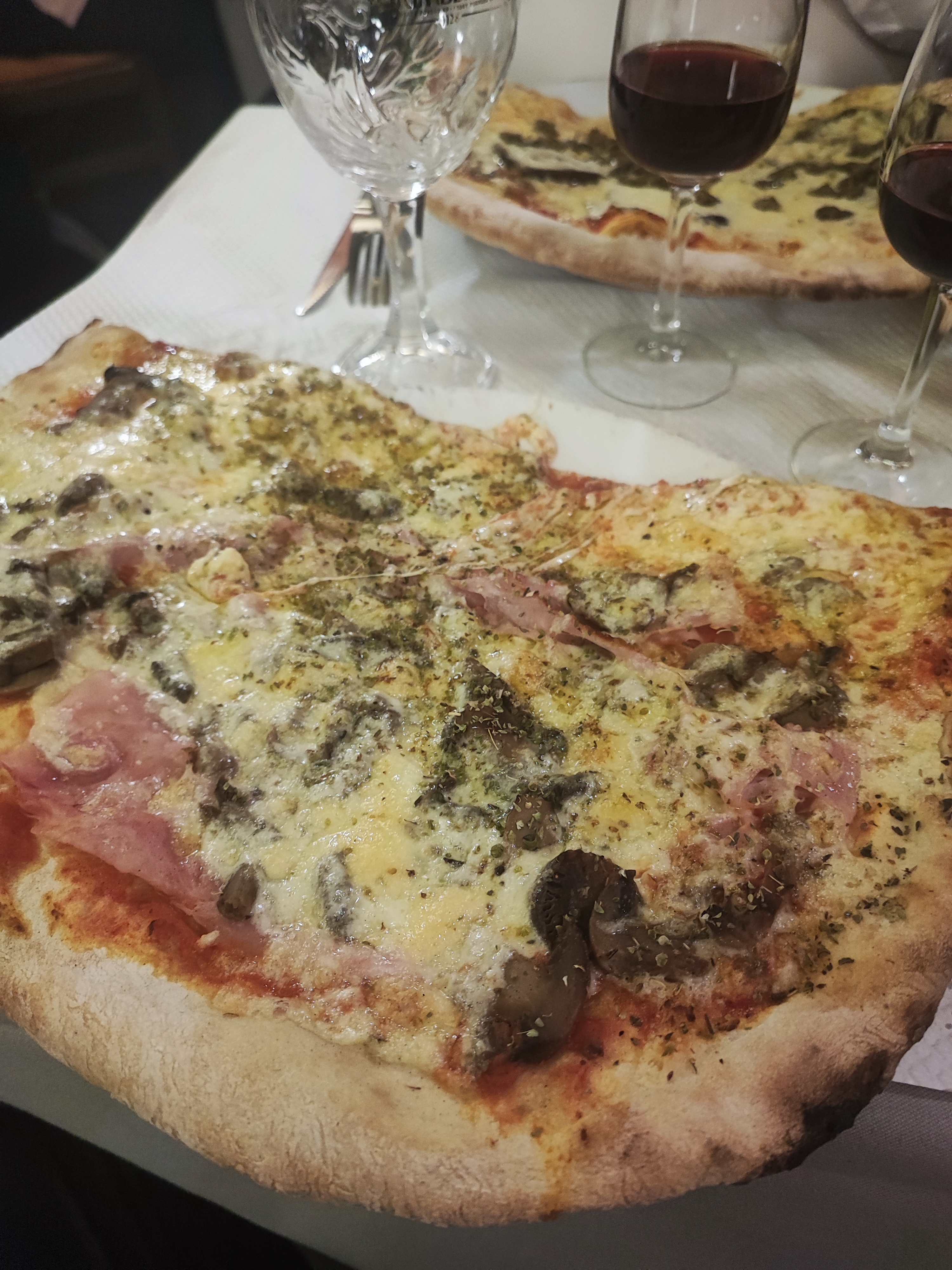 Pizza moyenne avec une pâte très dure à couper, les serveurs semblent un peu débordés par pas grand chose malgré le peu de client à ce moment, pizza en demi-lune posée dans une assiette pas du tout adaptée, il faut manger la moitié de la pizza pour qu’elle tienne dans l’assiette sinon l’autre moitié est sur la table