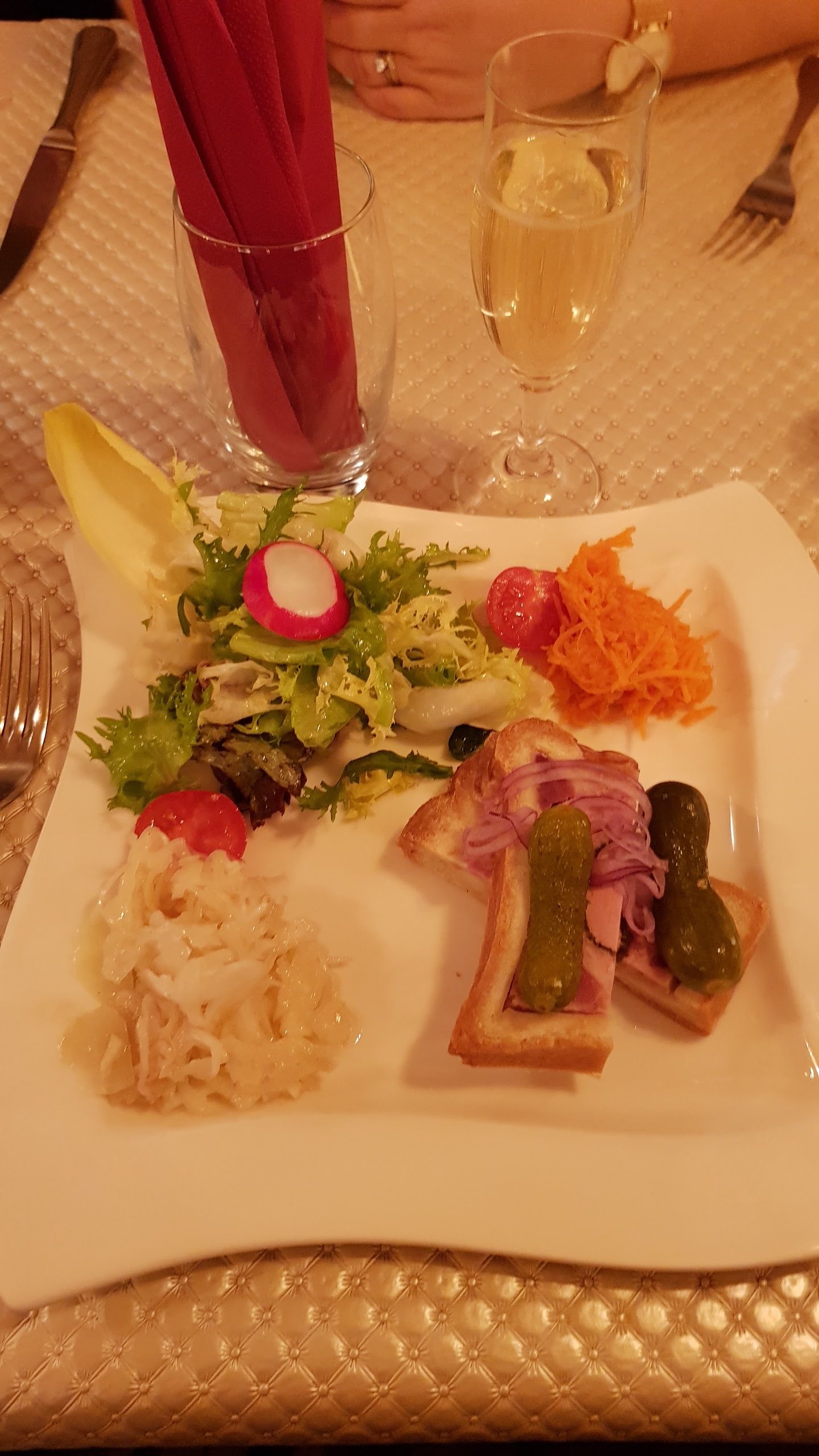 Nous avions réservé pour le réveillon Nous n'étions pas trop pressés mais 1h30 d attente pour être servis pour l'entrée était trop long.. Nous avons mis cela sur le compte du manque de personnel donc avons été tolérants malgré une ambiance tendue. Mais nous avons abandonné l'idée de finir par un dessert. Cependant 2 personnes qui avaient pris le même plat ( ballotlne de chapon) ont été malades après. Ðécus de ce restaurant.