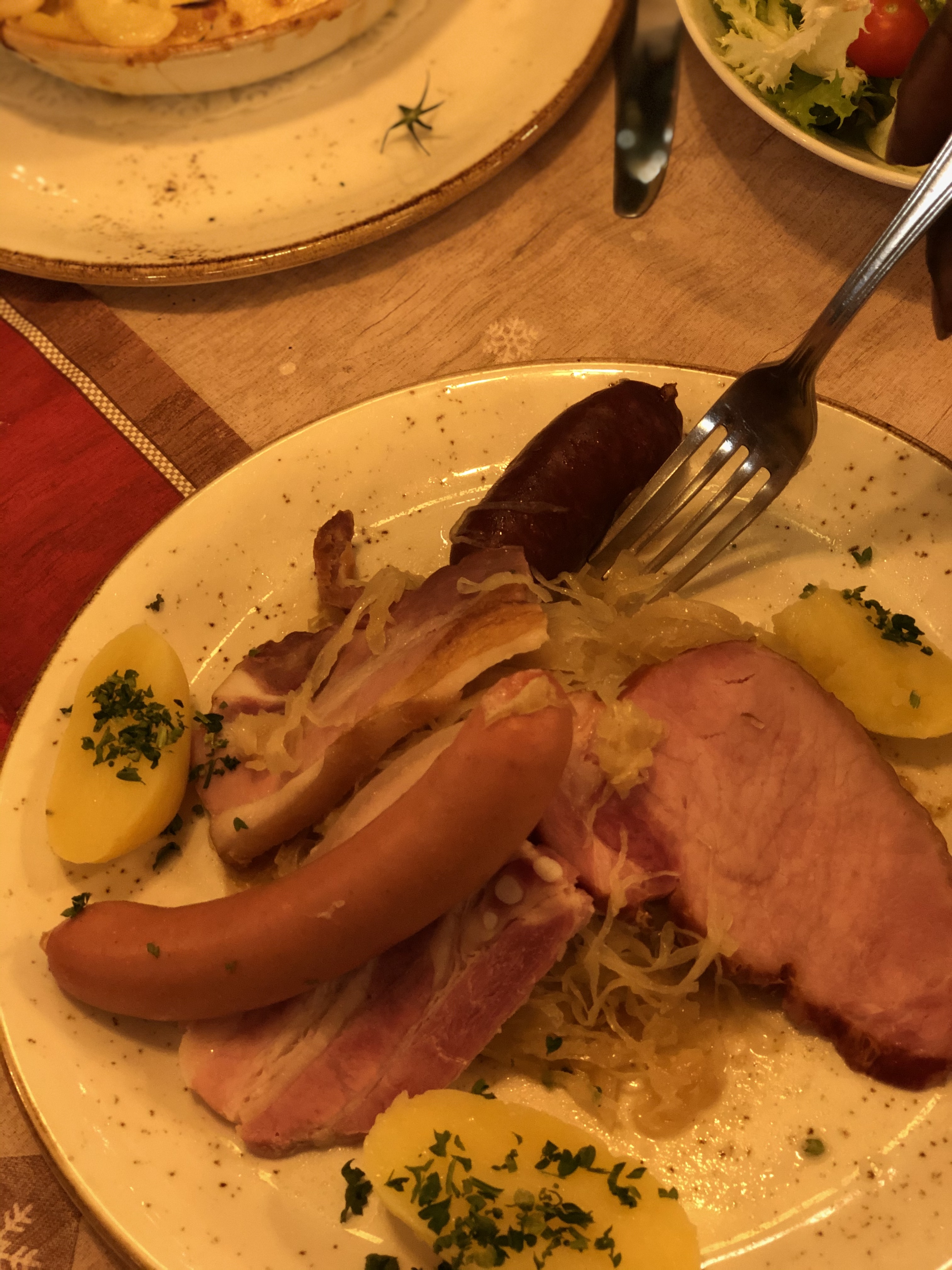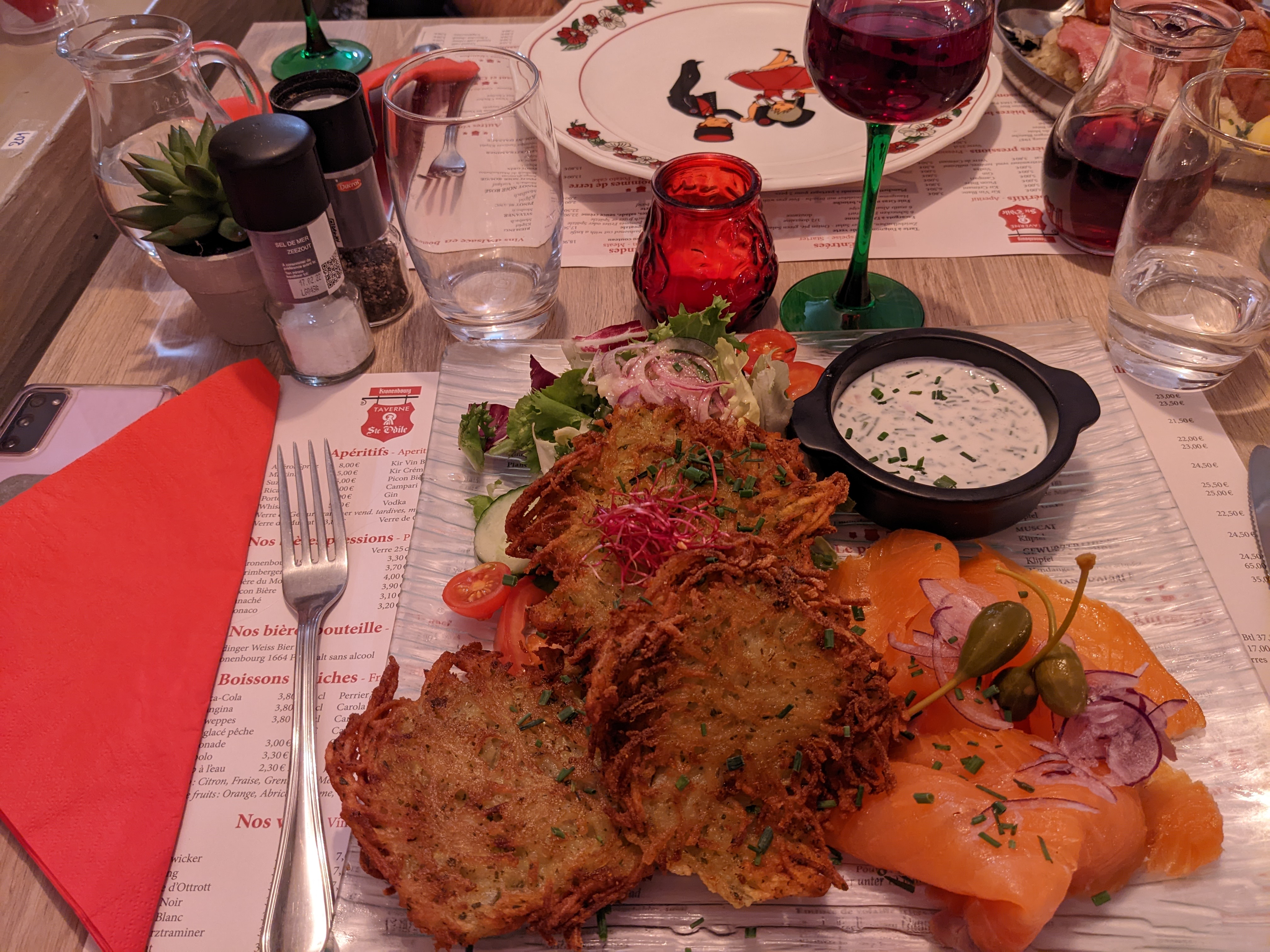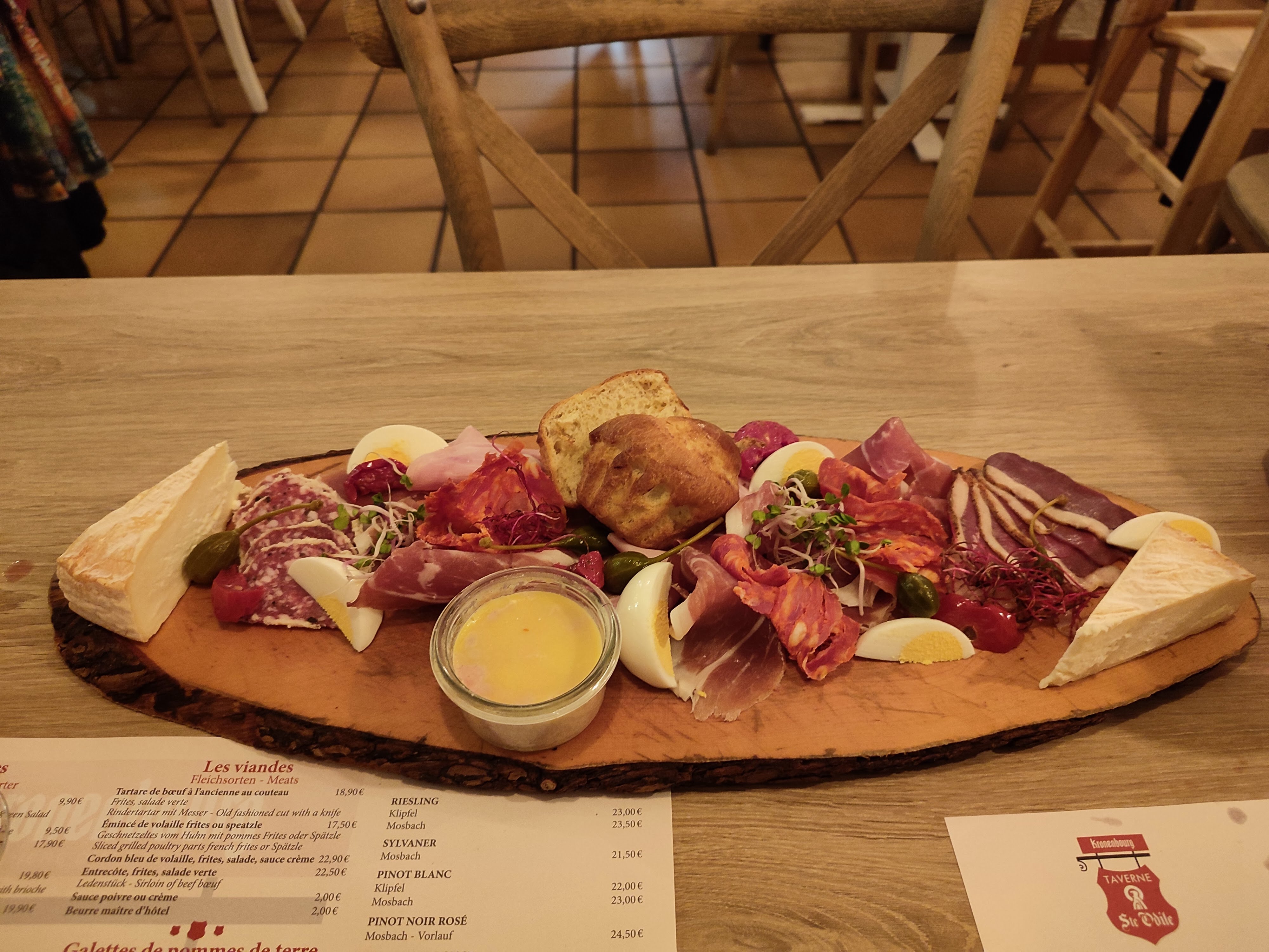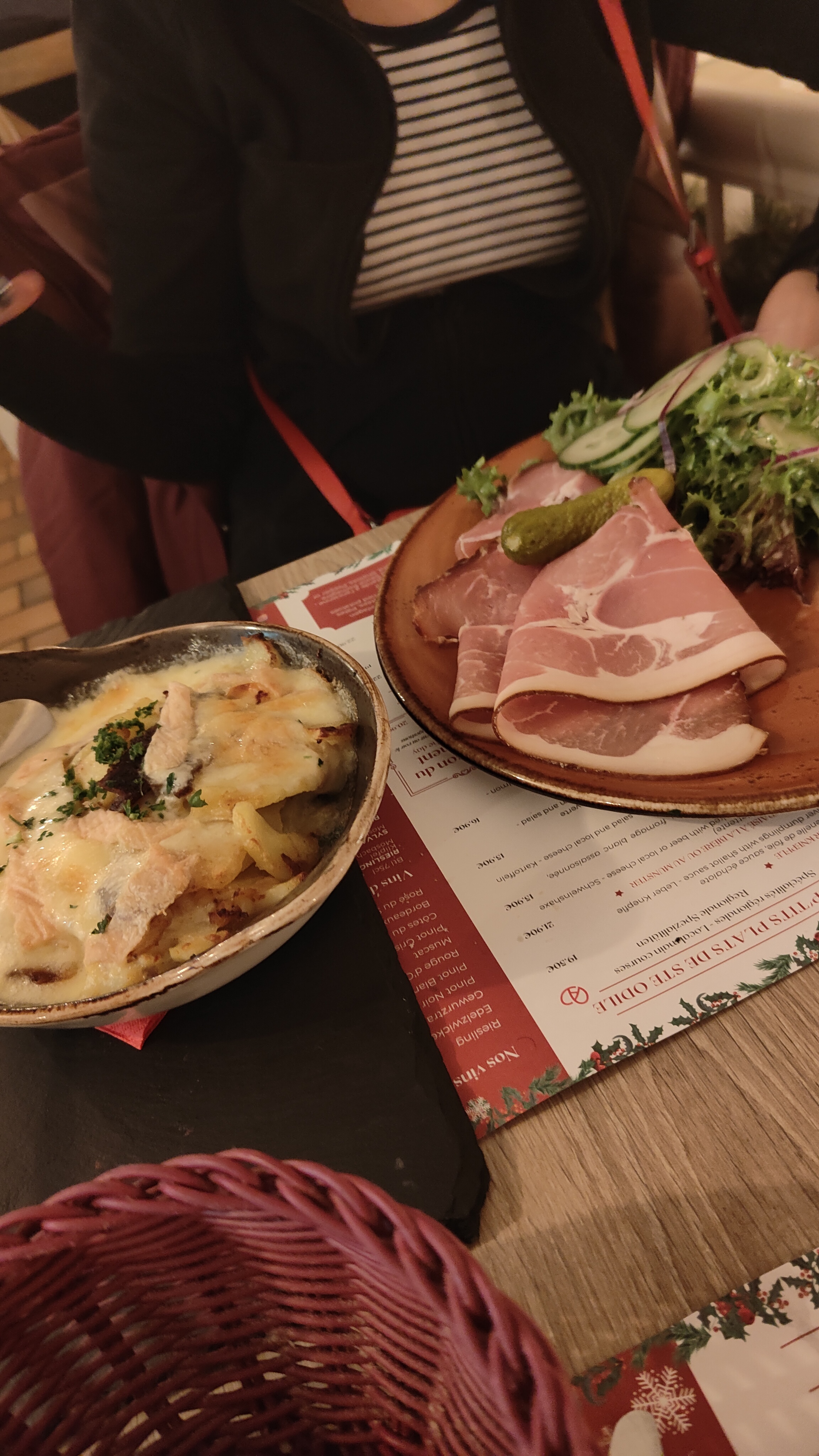 Attendu 1h pour un gratin de pomme de terre au munster et jambon fumé en insistant et la oh surprise ce n est pas un gratin mais des pommes de terre jetées avec une tranche de fromage qui n est clairement pas du munster en bouche et 2 tranches de jambon industriel sur une assiette a part! Meme si je cuisine sur le pouce j aurais au moins épluché et coupé les pommes de terres et cuit je jambon avec! Je vous parle meme pas du vin ! Rouge d ottrot qui n en ai clairement pas un et gewurtzraminer très bas de gamme. Bref même un routier fait bien mieux.