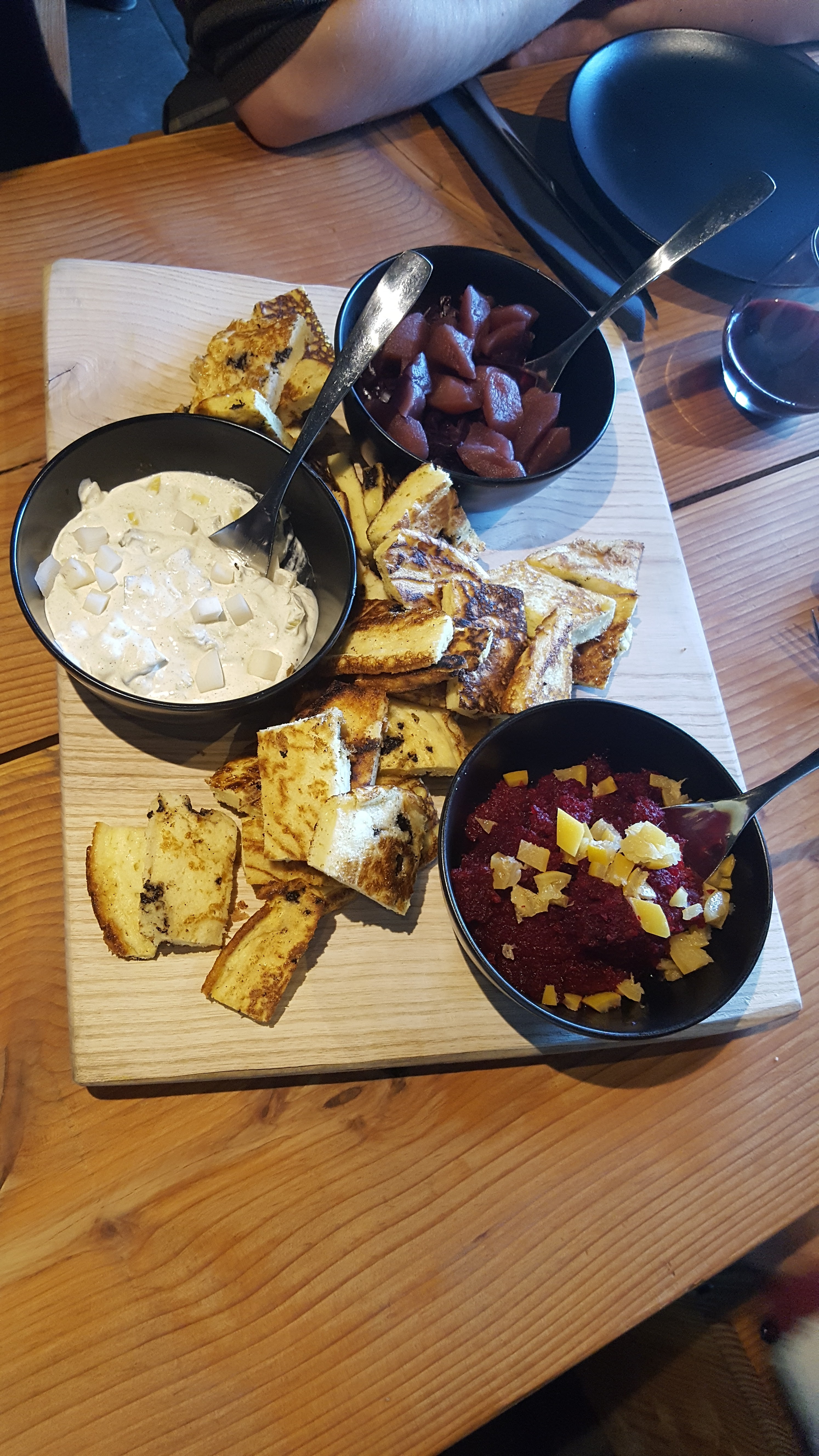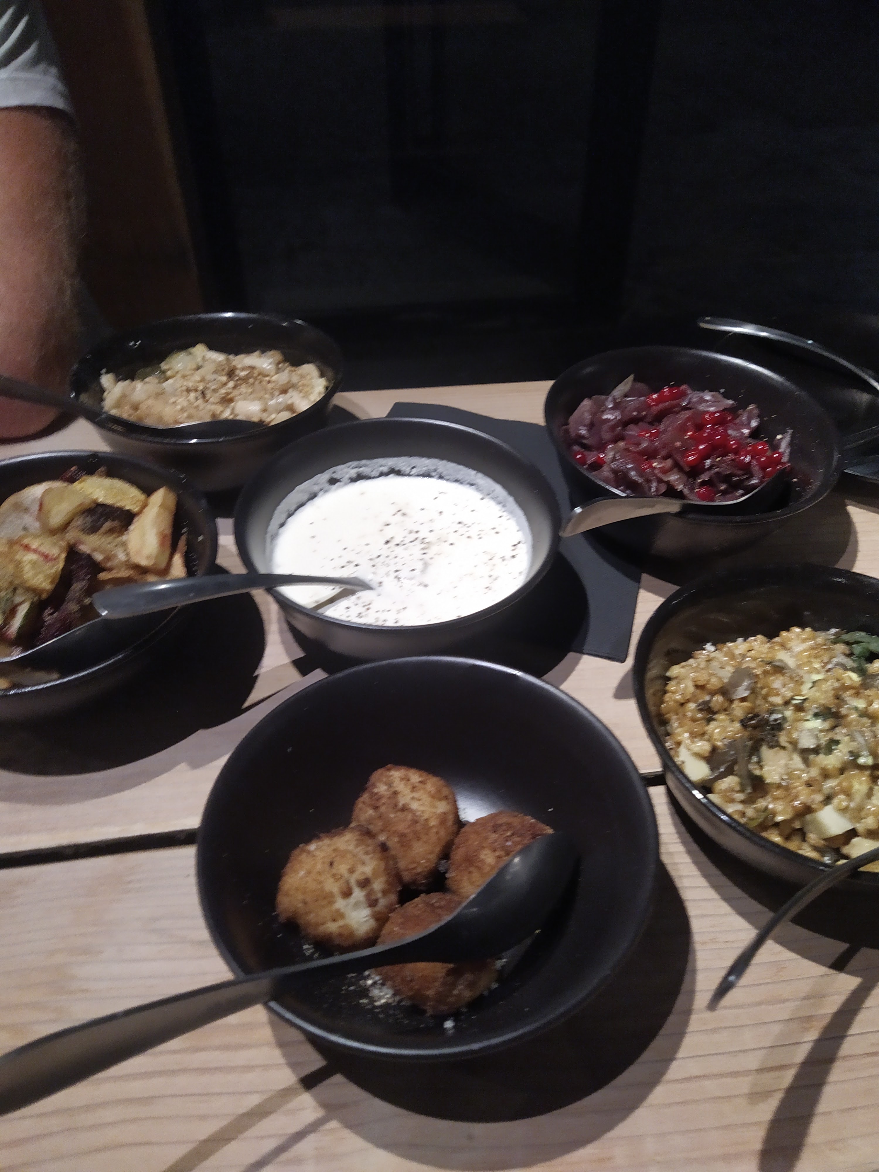 Repas original ; tout était excellent.Le menu est décliné en plein de plats différents ce qui permet de goûter à tout.C’était une découverte pour moi et j’ai vraiment adoré.Tout était féerique : l’emplacement dans la forêt ; la neige, le soleil et l’endroit.Le patron aussi qui répond à nos questions enfin c’était génial !