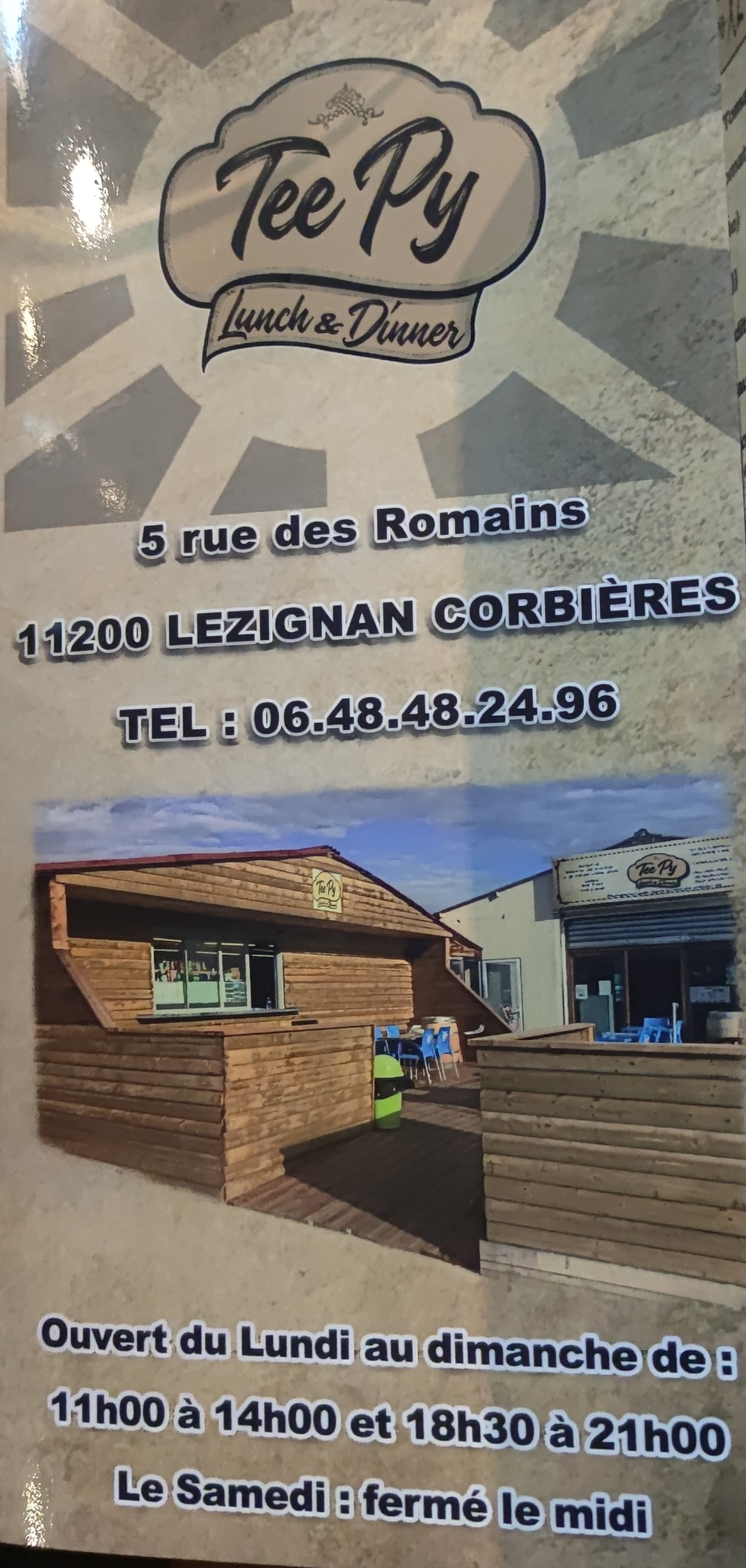 Lieu très agréable Très bonne qualité alimentaire Le personnel est vraiment très agréable J'ai demandé eau chaude avec citron, on me l'a apporté. Je reconnais que je fais toujours cette demande afin de voir la qualité soins avec la clientèle. J'ai rencontré assez souvent un refus total pour cette demande. Il m'a été très agréable de constater que Tee-py fait plaisir à ses clients. Quand au prix vraiment plus que parfait. Je recommande vivement le Tee-py si on veut manger qualité, ambiance, service et prix. Si vous êtes dans le secteur de Lézignan Corbières faîte un petit détour pour venir manger au Tee-py.