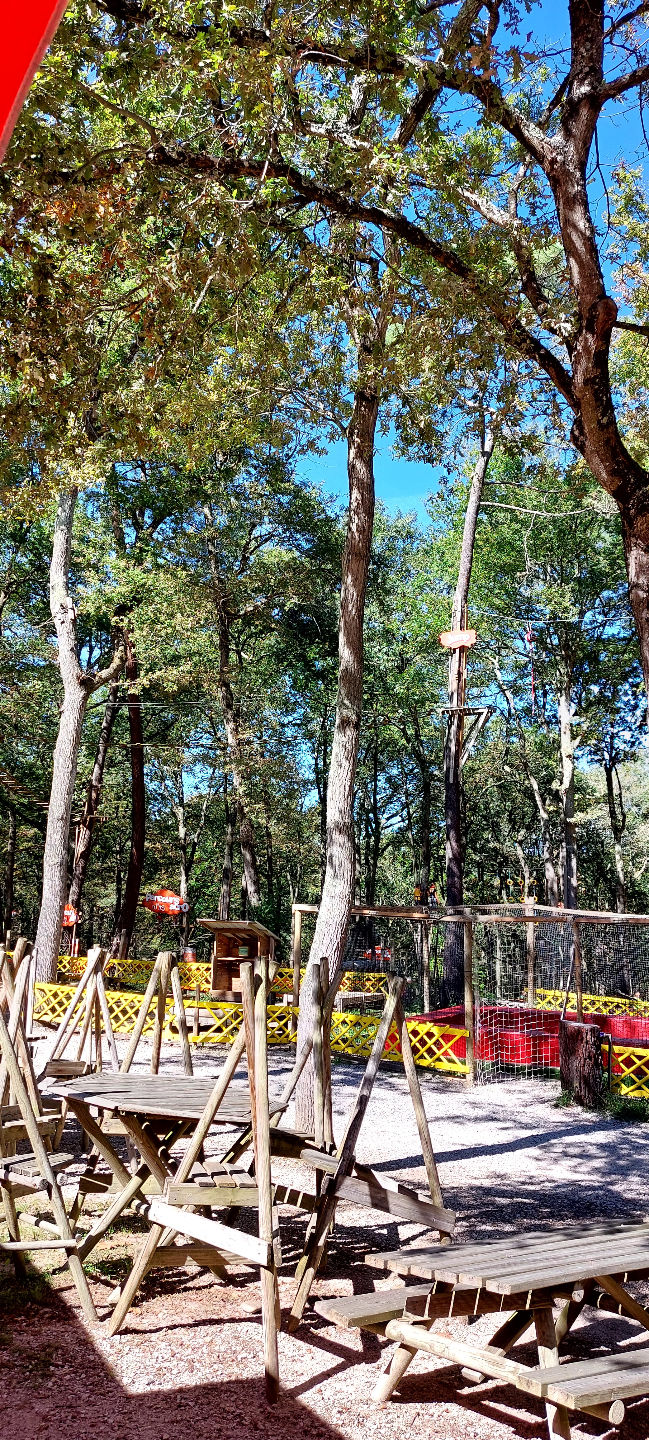 Super endroit pour passer une journée en famille. Encadrement serieux. Si on ne souhaite pas faire de l'accrobranche, on peut quand même suivre le reste de la famille en suivant le parcours au sol. Les parcours dans les arbres sont fermés de 12h30 à 13h30. Il est aussi impossible de rentré et sortir du parc pendant ces horaires. Les jeux de société géant et le parcour pour les tous petit eux reste ouvert entre midi. Le pique nique est autoriser, mais il y a aussi un snack bar ou les prix sont très correcte. Important, il vaut mieux penser a mettre du spray anti moustique parce sinon on se fait bouffer.